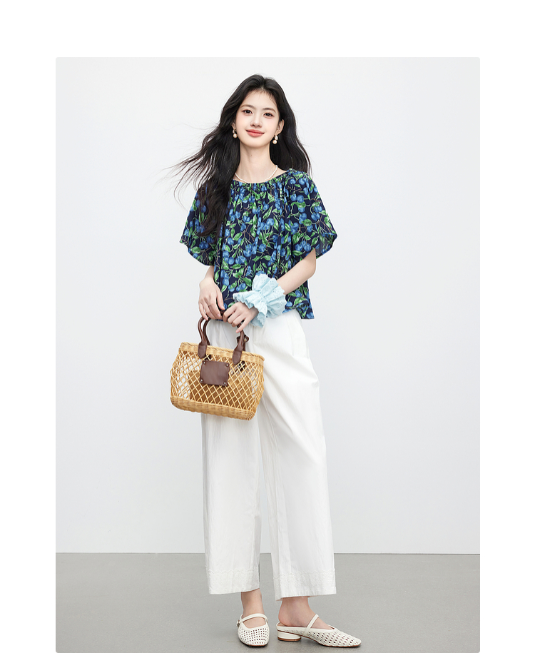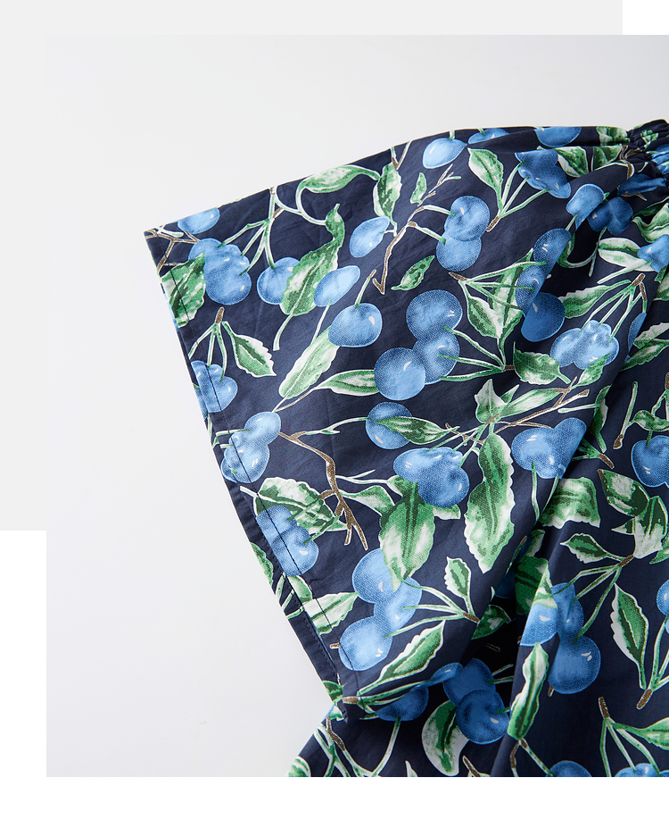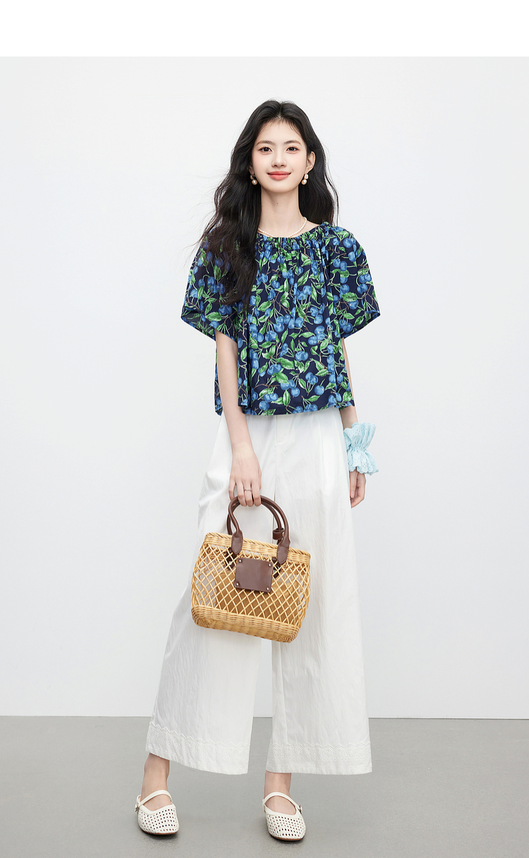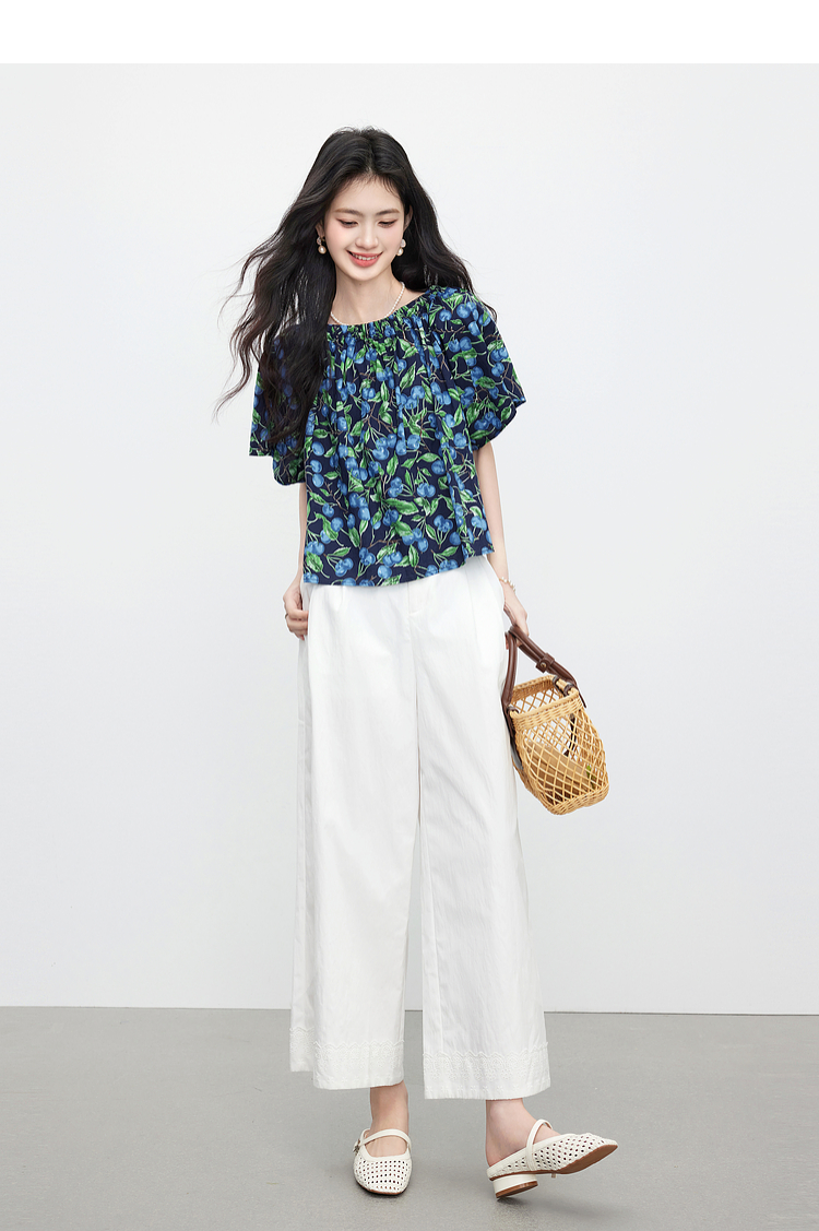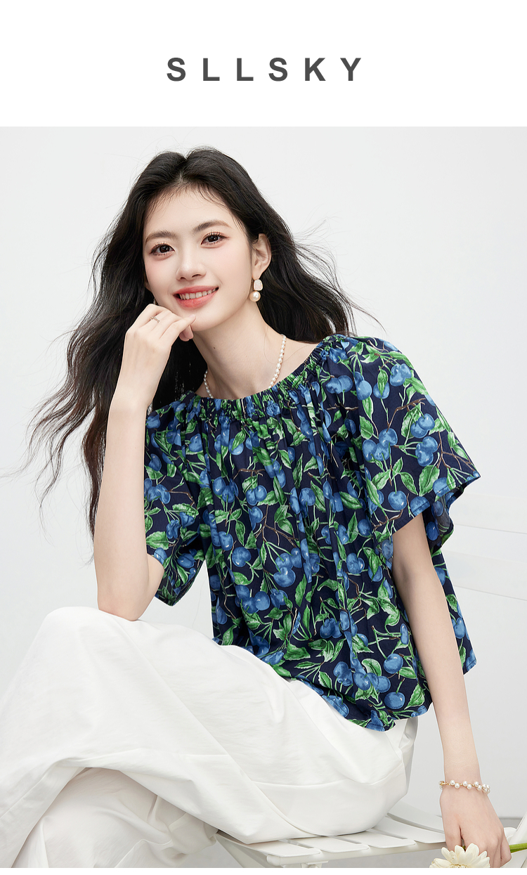【周四狂欢价】熙世界纯棉蓝莓印花衬衫女设计感小众休闲一字肩上衣2025夏日新款