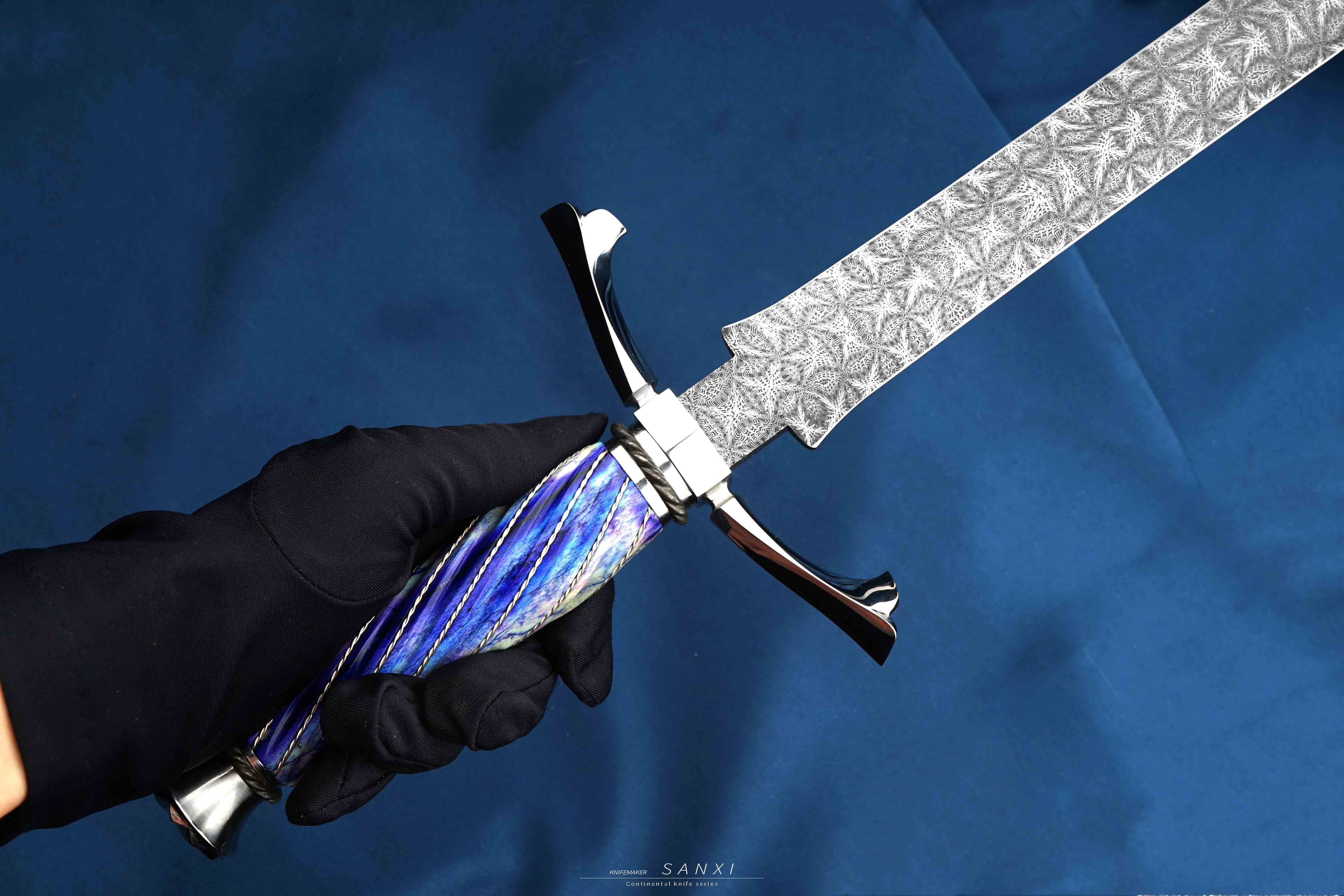 新做的高配大马短剑,西子师傅全手工制作,他做东西不需要机器,一把锉刀手工全搞定,四芒星大马+玉化螺旋猛犸柄