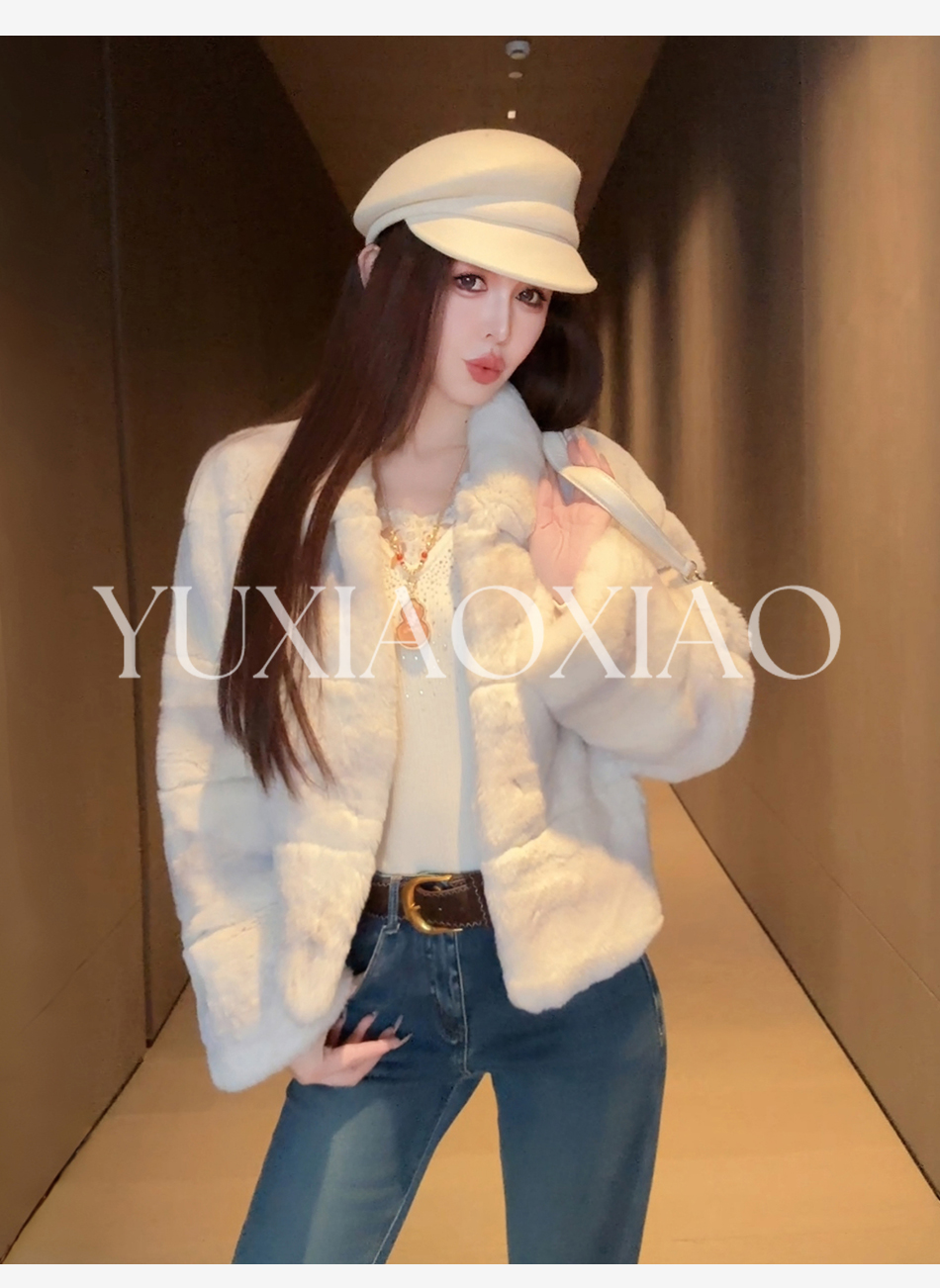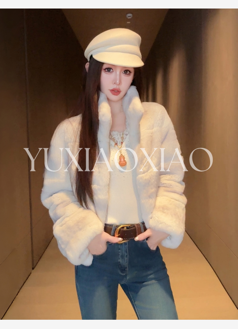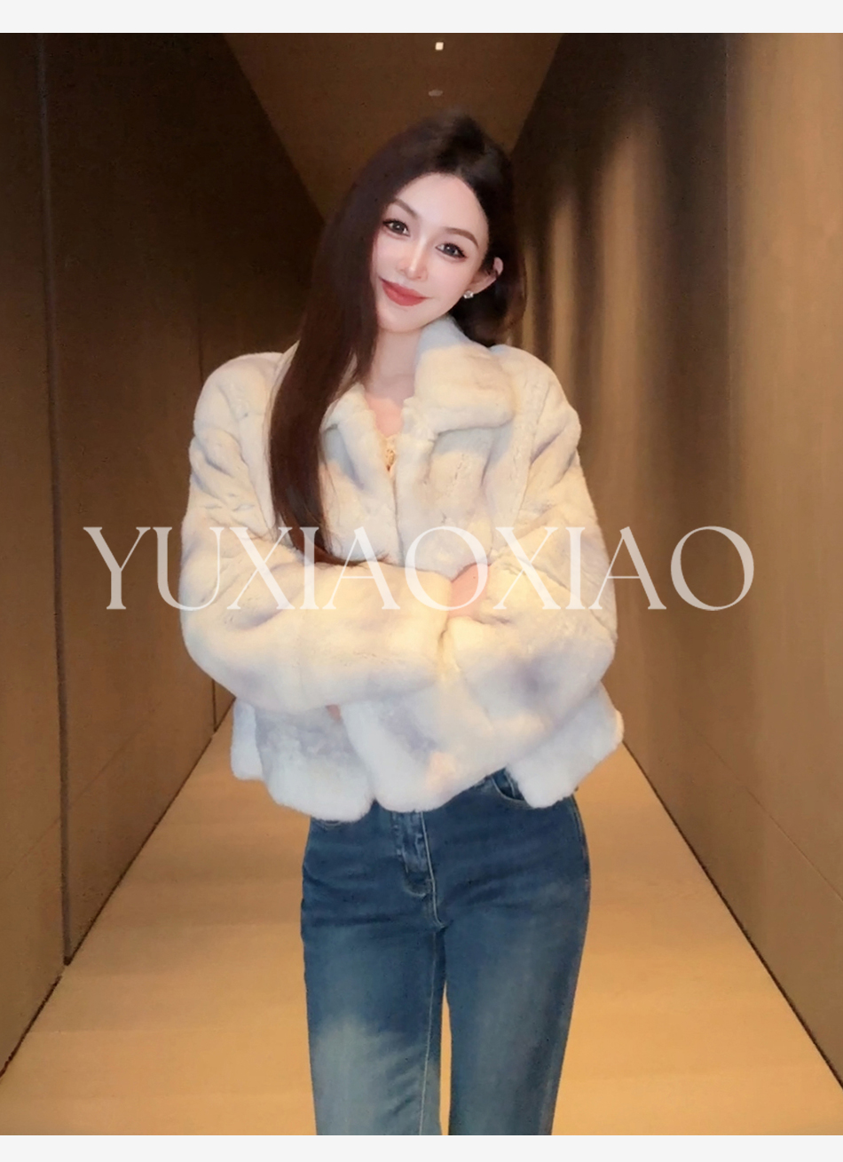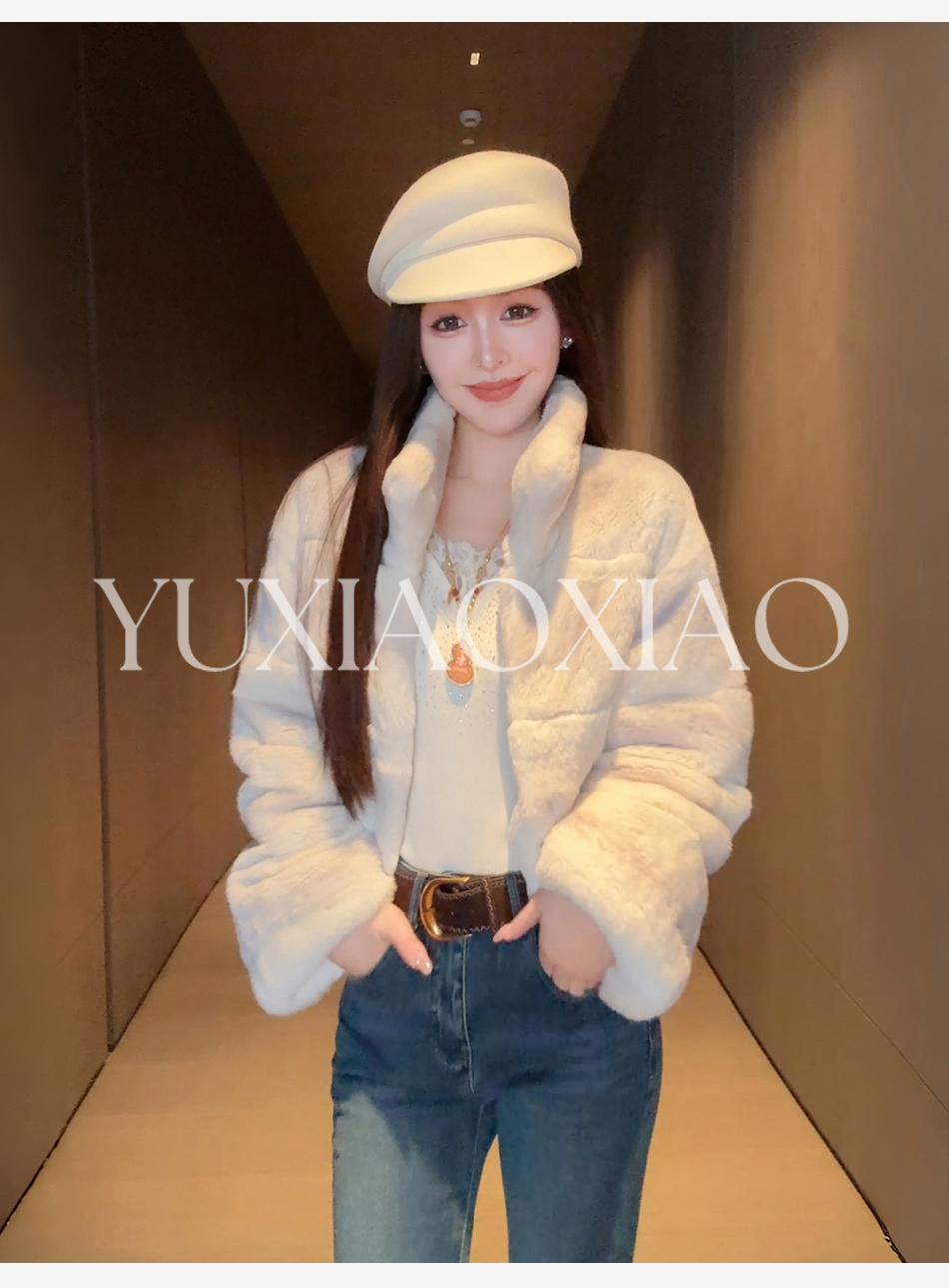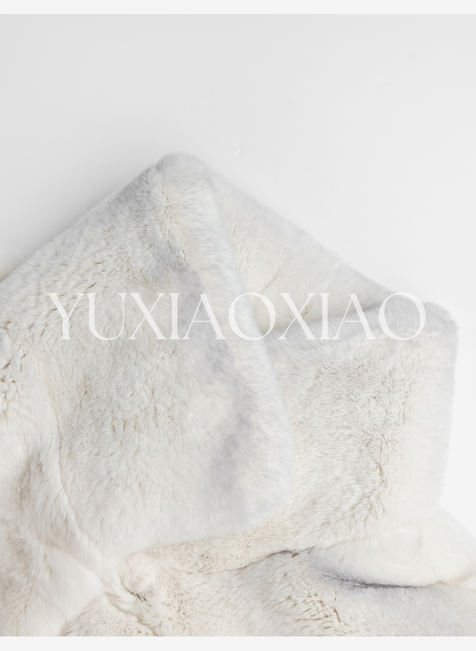 余潇潇【柏林月光】横排雷克斯獭兔毛填充薄棉保暖舒适翻领皮草