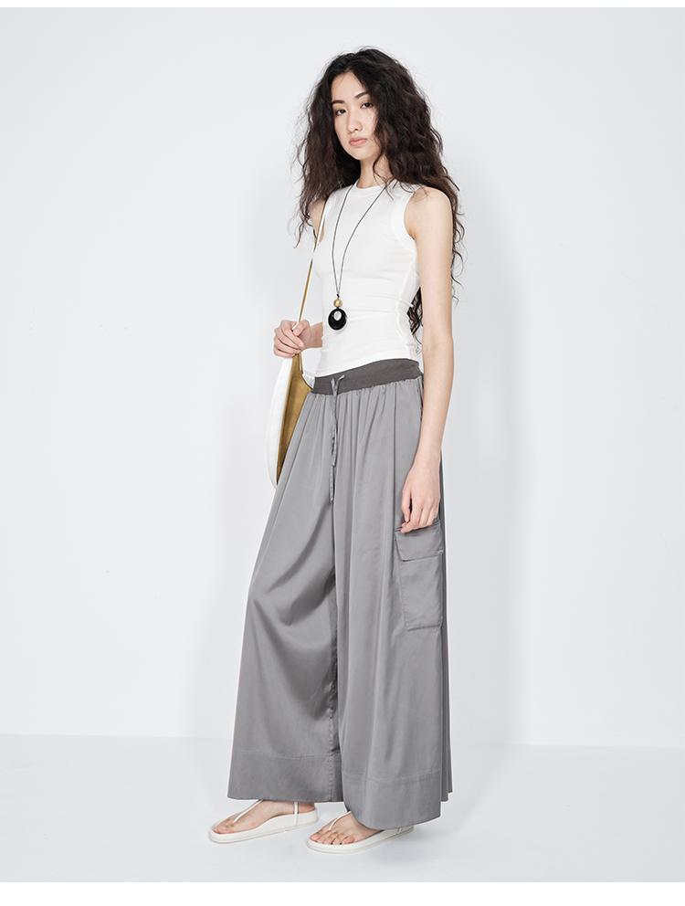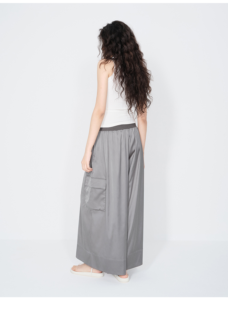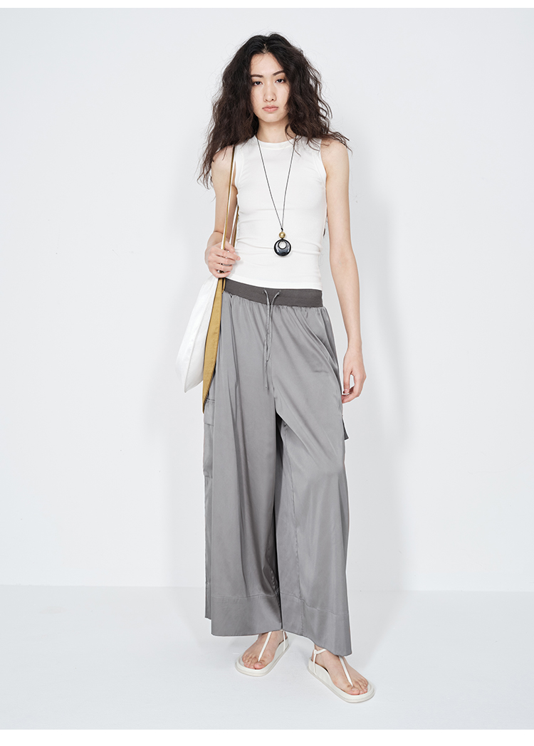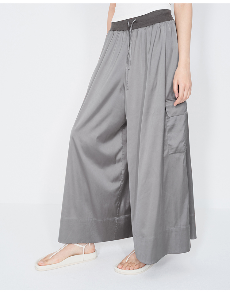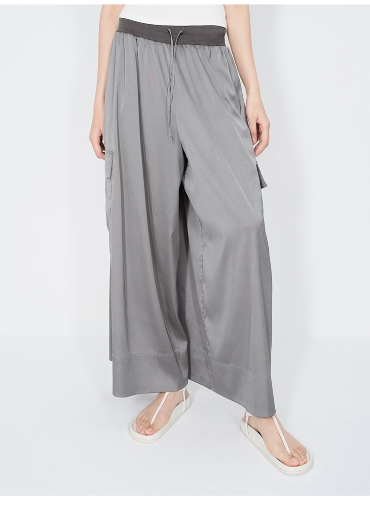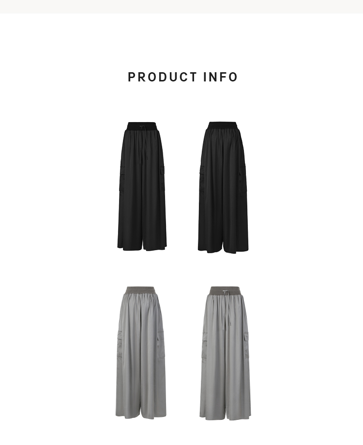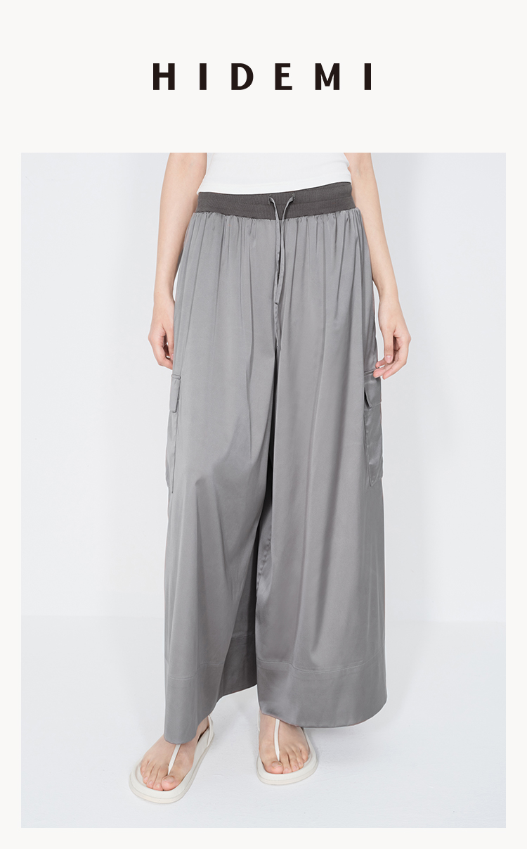 HIDEMI 极简工装口袋缎面款腰松紧腰飘逸柔顺阔腿裤 炭灰色/黑色