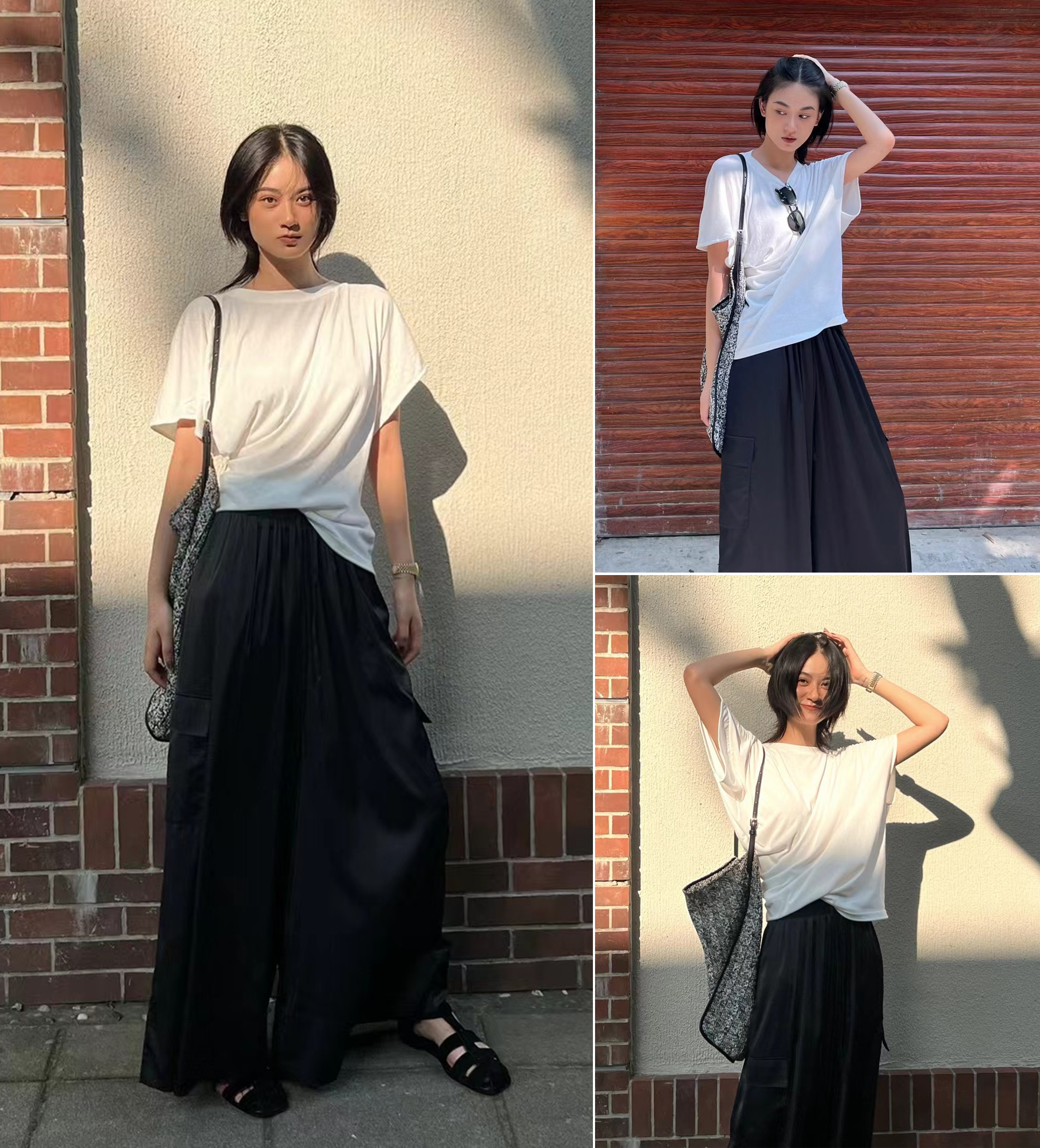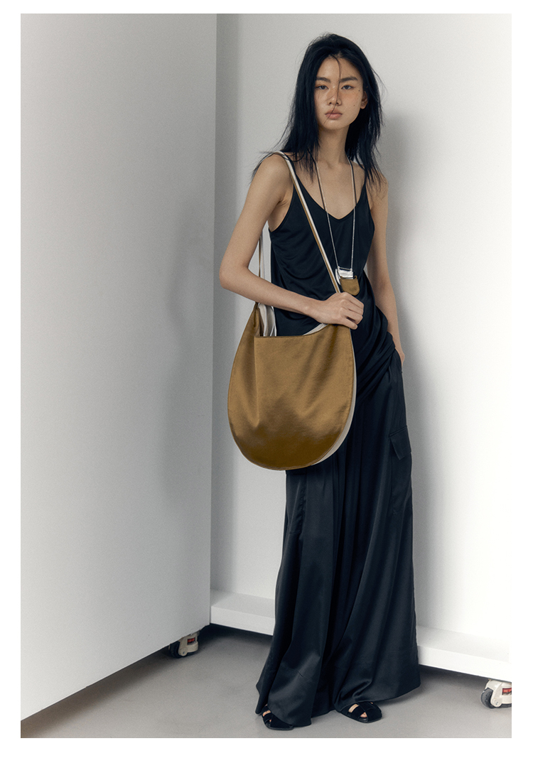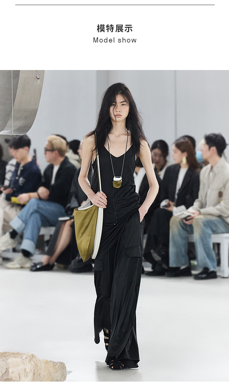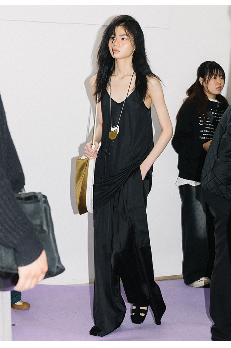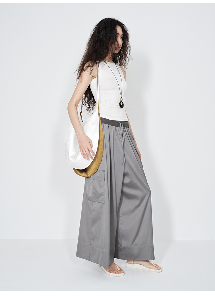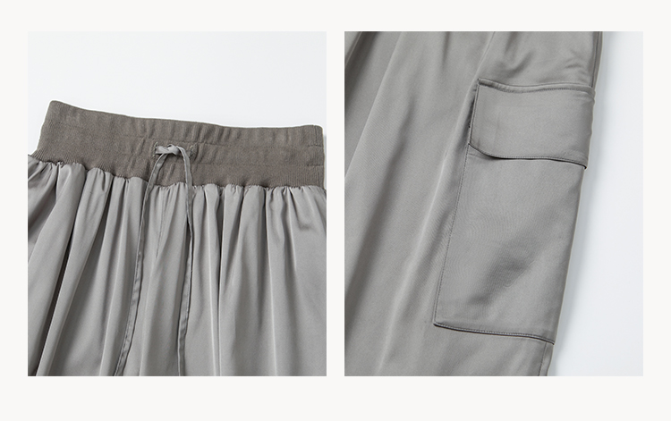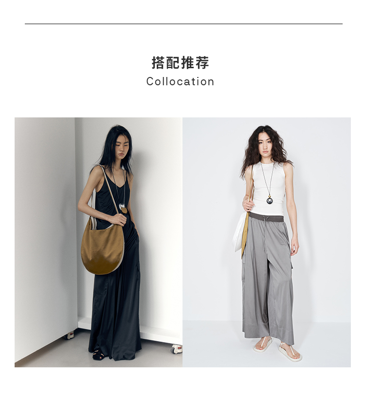 HIDEMI 极简工装口袋缎面款腰松紧腰飘逸柔顺阔腿裤 炭灰色/黑色
