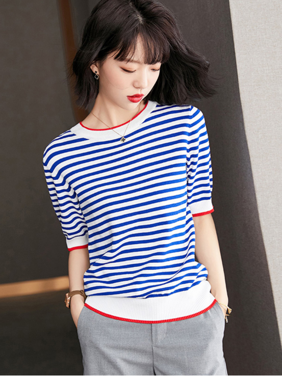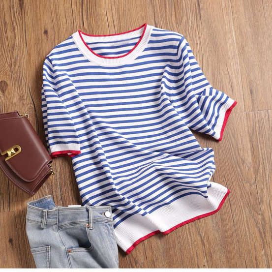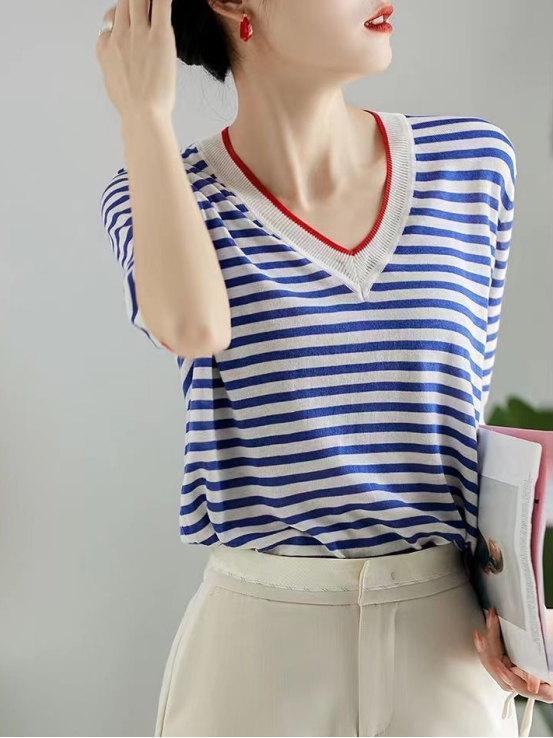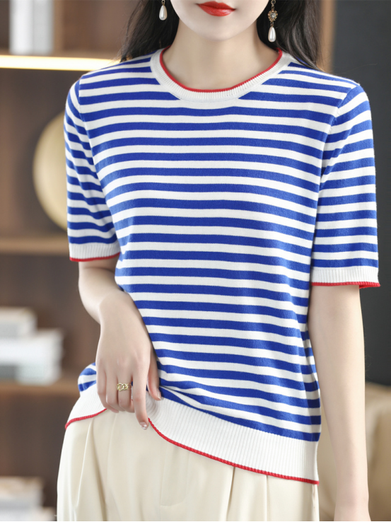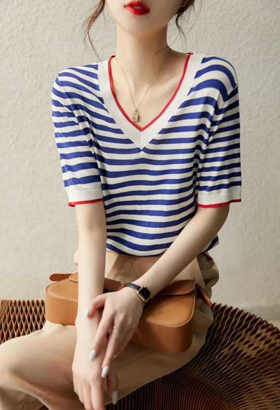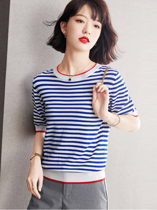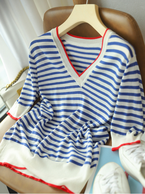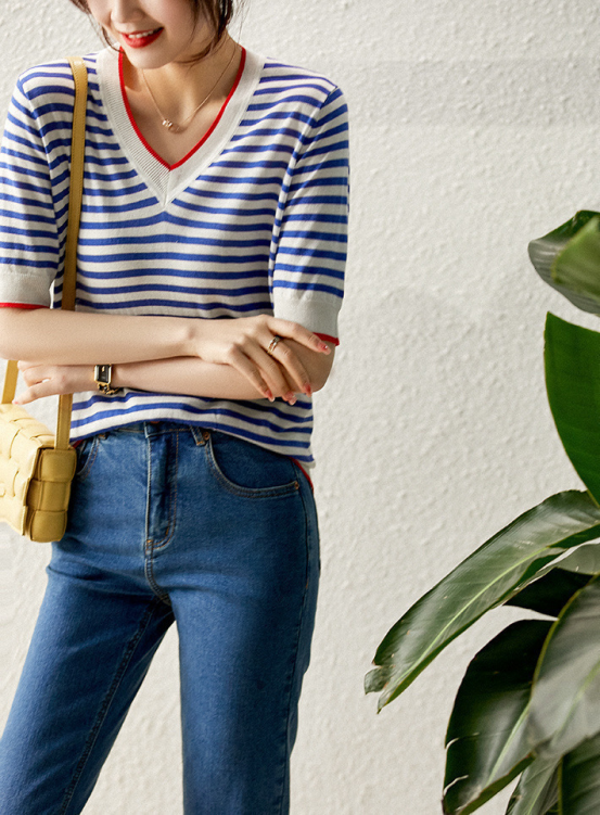百搭不挑人,衣柜里任何一件衣服 都可以与之搭配,实用性up! 【必入理由】 ✨经典条纹针织衫,毫不费力的高级! ✨高端定制进口纱线,丝滑有型,透气不闷热 ✨条纹领口撞色设计,经典时髦,万能百搭单品 ✨圆领/V领两种款式,视觉更显脸小,显得脖颈线条更修长 ✨单穿内搭都可以,一件能穿春、夏、秋三季