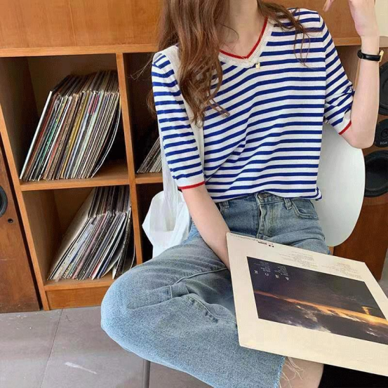 百搭经典的海魂衫💙有一件就够了! 我也是个条纹控! 遇到这种条纹系列的款式就挪不动脚! 今天推爆她🔥 减龄又好穿的海魂针织短袖🩰 手感柔软,亲肤透气超舒适! 时尚界的经典单品,垂坠轻薄,上身更显轻盈 巨显白的海军风来咯🌊好搭又时髦,实力推荐!