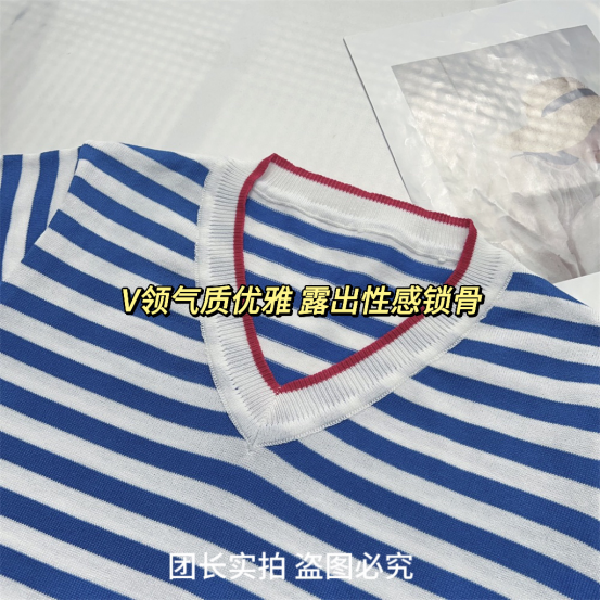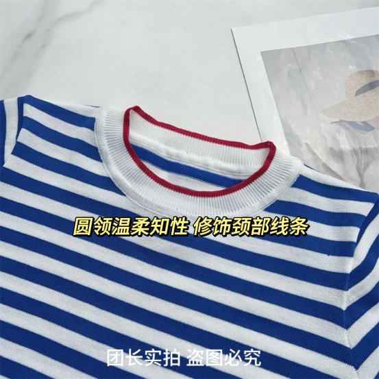 重磅自留款🏆55💰挖到李一桐同款海魂衫💗【茧墨】经典海军风条纹针织短袖 🧡某宝同款:1件409元 ❎ 💚本团破价:1件55元 ✅ 夏季人手必备的万金油🌈质感天花板级别‼️ 👏蓝白条纹配色真的很耐看,衣服撞色红色描边❤️沉稳有致,越穿越有味道🍃 🔸高端定制进口纱线,丝滑凉爽,抗起球 🔸圆领/V领两种款式,设计视觉更显脸小,显得脖颈线条更修长