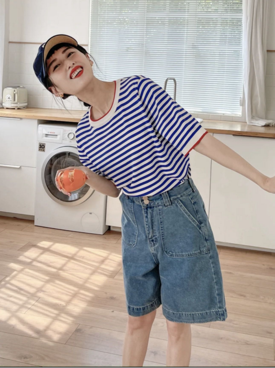 💙夏天的条纹完全是百搭不厌的有效穿搭, 版型就是那种看着简单,但上身很洋气的。 微宽松的版型休闲又舒适,包容性很好, 遮肉显瘦,轻松自在无拘无束, 穿出纸片人的效果👍 这种海魂衫根本不需要怎么穿搭, 就可以让你既时髦又洒脱自然‼️