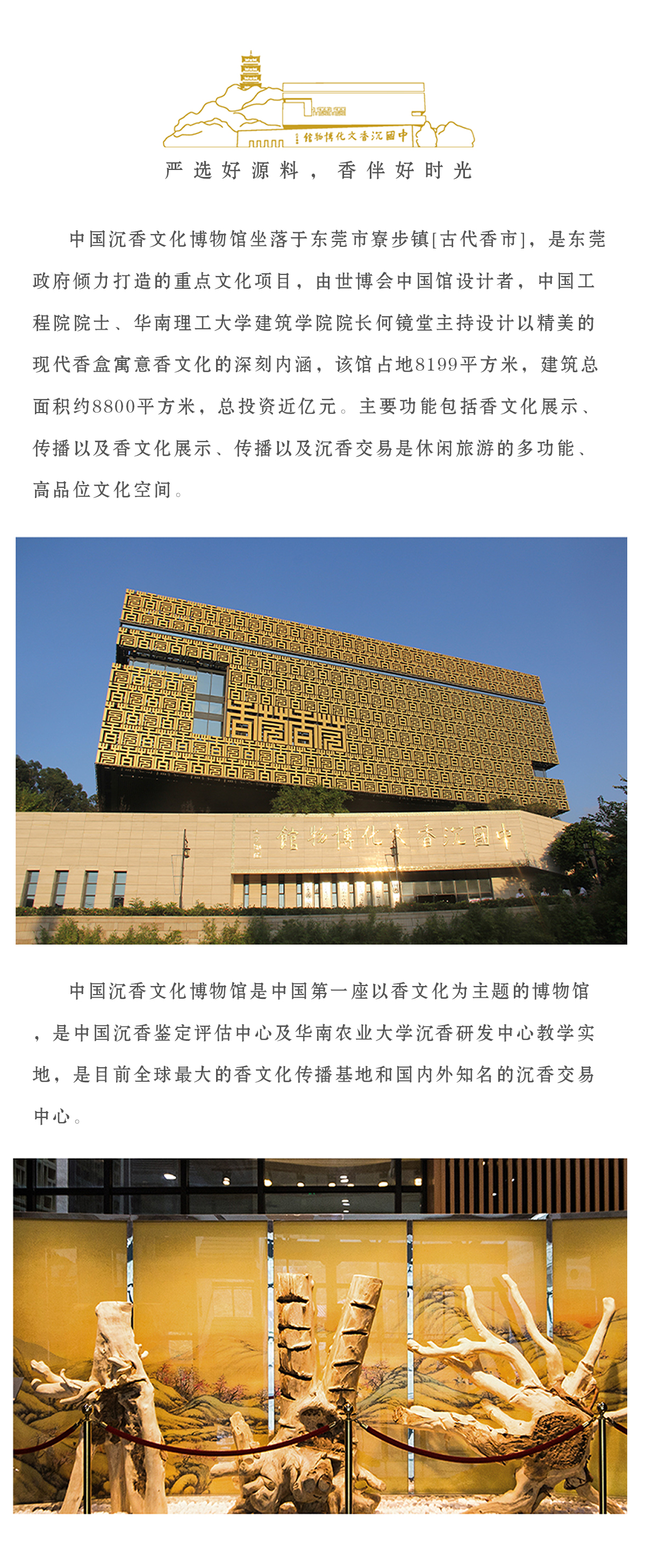 中国沉香文化博物馆坐落于古代[香市]东莞市寮步镇,是东莞政府倾力打造的重点文化项目,由世博会中国馆设计者,中国工程院院士、华南理工大学建筑学院院长何镜堂主持设计,以精美的现代[香盒]寓意香文化的深刻内