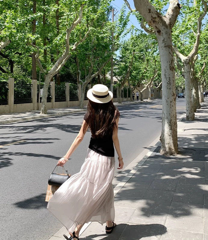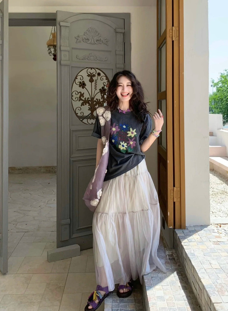 这种空灵浪漫的单品总是让人一眼爱上~ 仙美千金裙 仿若远离了尘世的喧嚣 不带一丝烟火气 微风吹拂的蹁跹裙摆 不禁让人频频回首 朦胧的光影,不会显得过分繁复,演绎恰到好处的美感~ 浪漫沁凉,简单搭配小衫/T恤/吊带....就很好看了