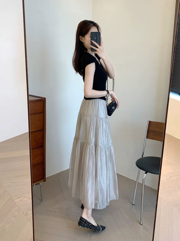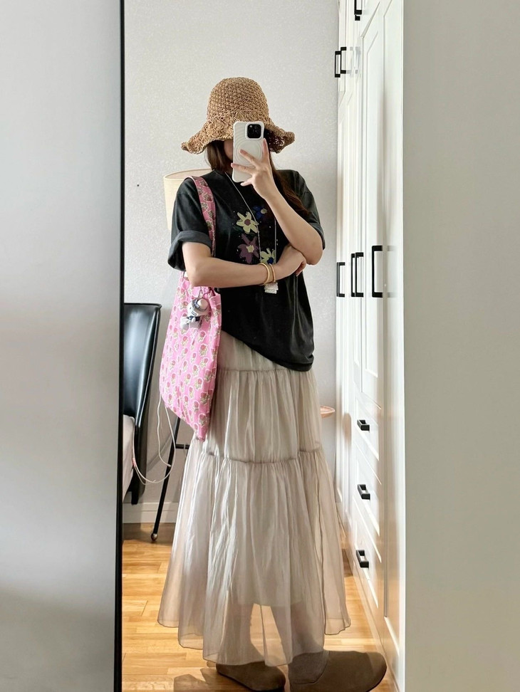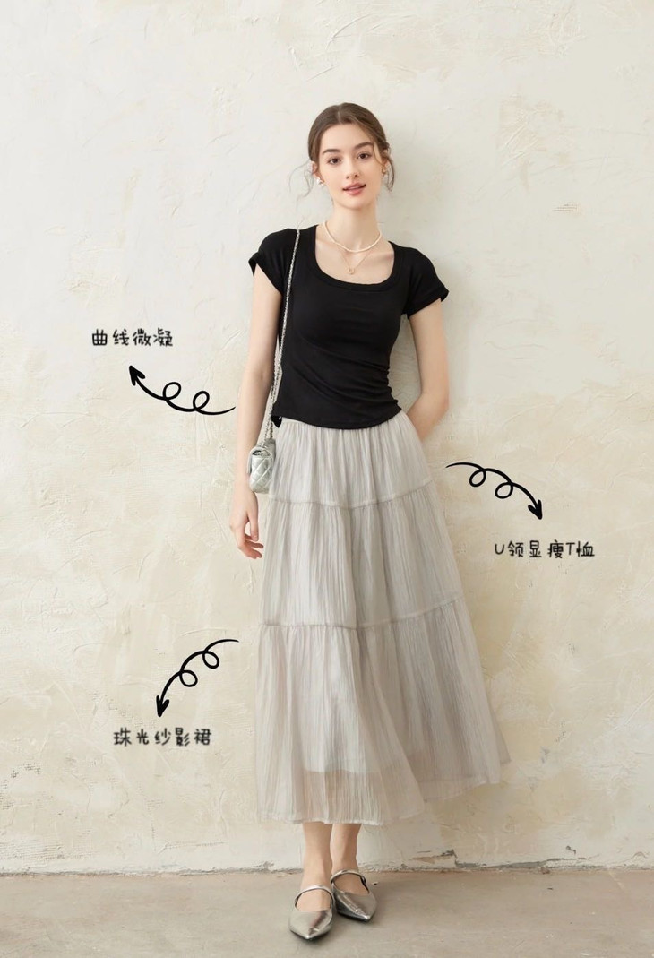 夏天尊嘟很需要这样温柔的裙子来搭配! 上衣搭T恤/衬衫啥的都可以,拍照杠杠出片噢~ 面料内含珠光,就像在阳光下的美人鱼般 触感细腻顺滑,轻盈飘逸,穿起来不闷汗不黏腻 外用料三米!出来的效果一整个惊喜住! A字裙型,遮肉藏胯,梨型身材的福音 腰头有弹力,不太限制腰围,穿着舒适不紧绷 以下本团实拍: