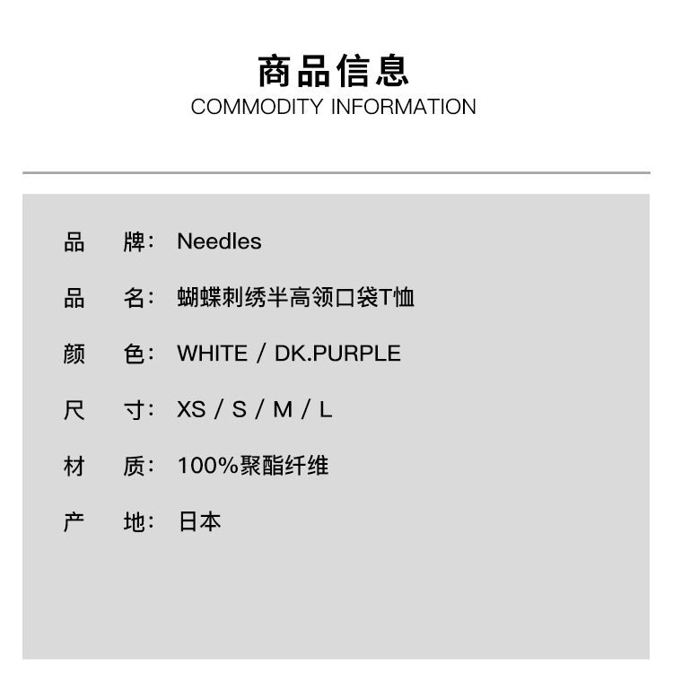 Needles S/S Crew Neck Tee Poly Jersey 蝴蝶刺绣圆领口袋T恤