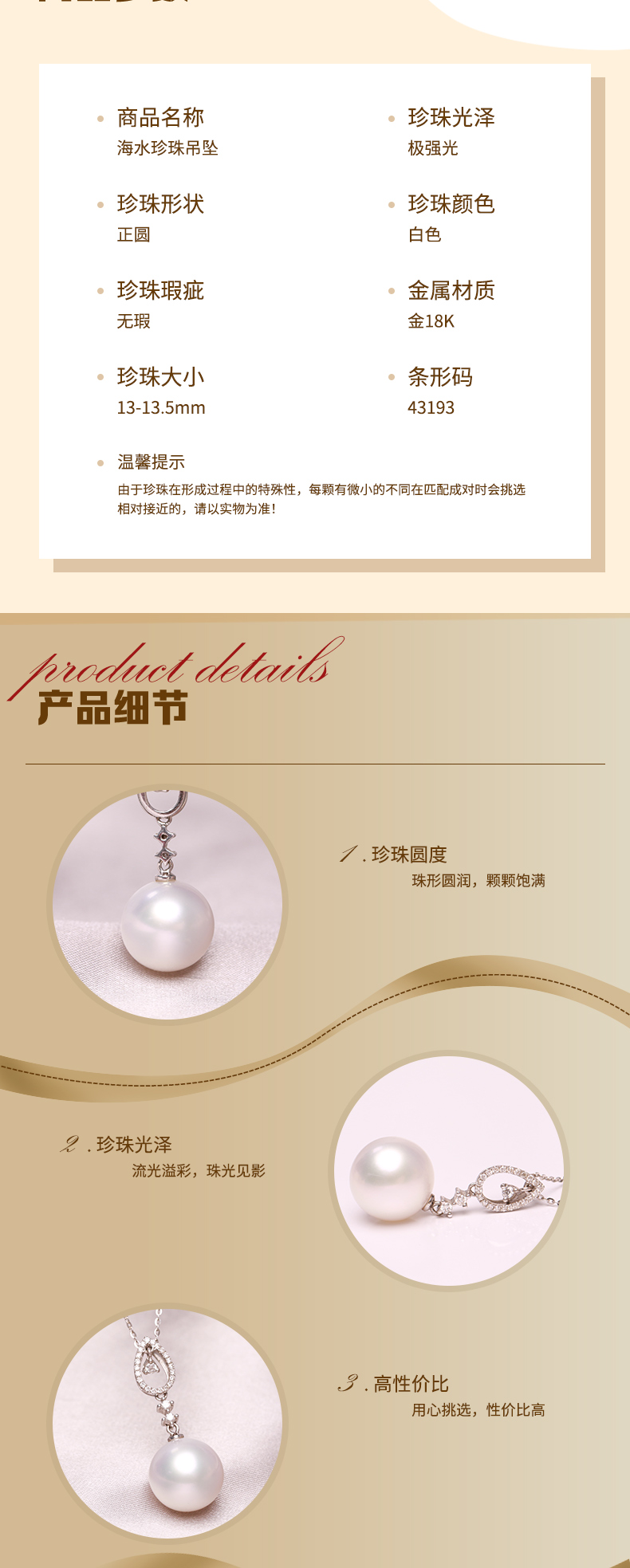 美裕 金18K海水珍珠吊坠 南洋珠吊坠13-13.5mm白 43193