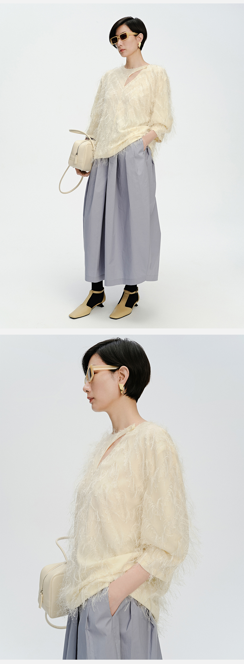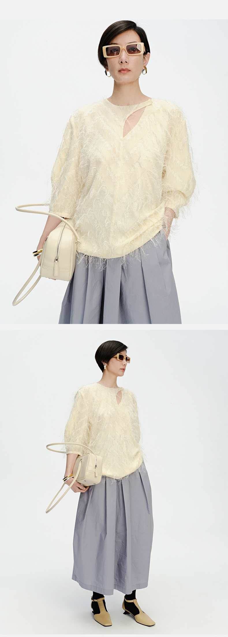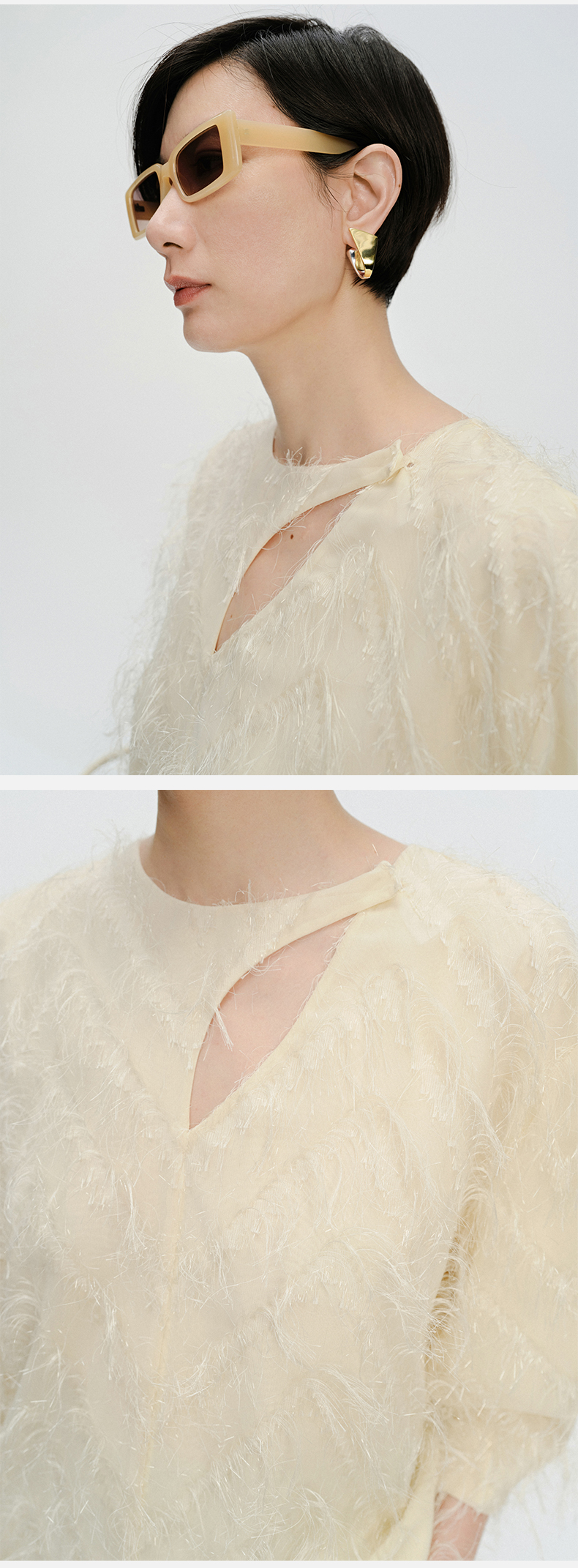 HIDEMI 软雕塑立体短流苏设计感不对称镂空设计廓形袖上衣