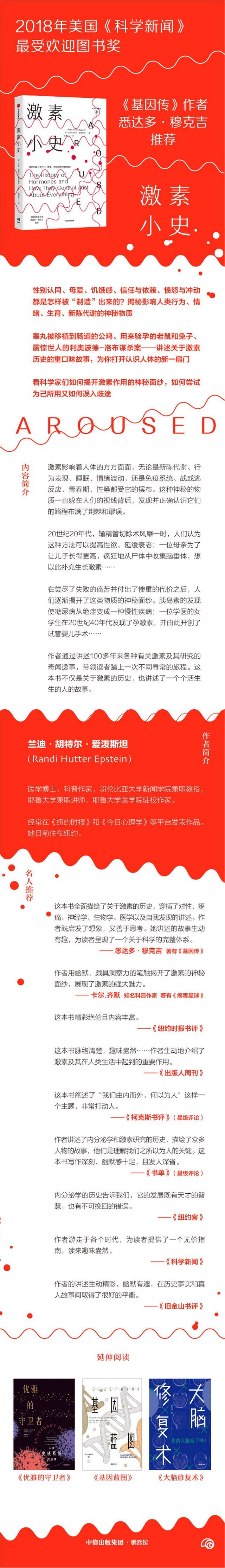 讲述了一个全面而精彩的关于激素历史的故事,中间穿插了对性、痛苦、神经学、生物学、医学以及自愈的讲述,兰迪胡特尔爱泼斯坦既启发了想象,又安抚了思考。她讲述的故事生动有趣,为读者呈现了一个关于科学的完整体系。