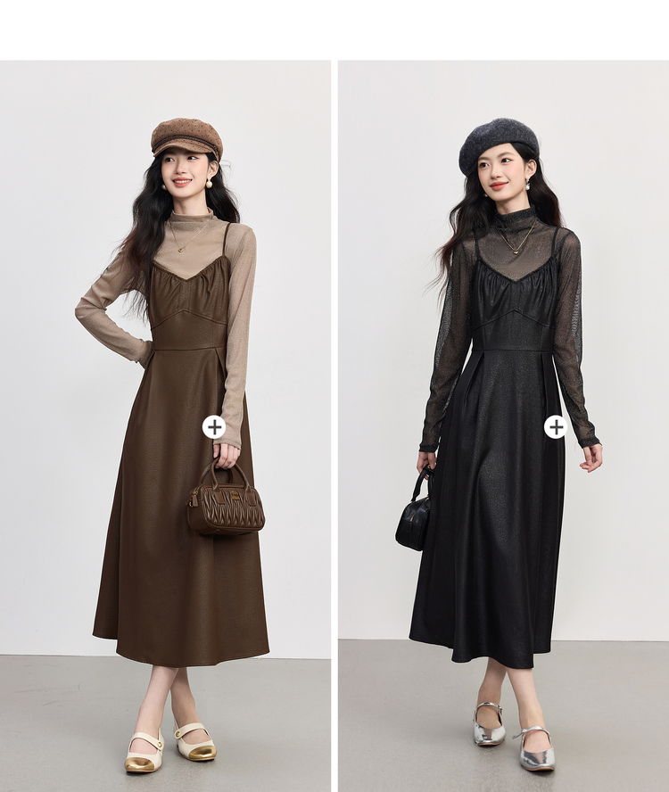 【10/1新品】熙世界琥珀流光PU皮吊带裙套装女秋冬复古网纱打底衫连衣裙两件套