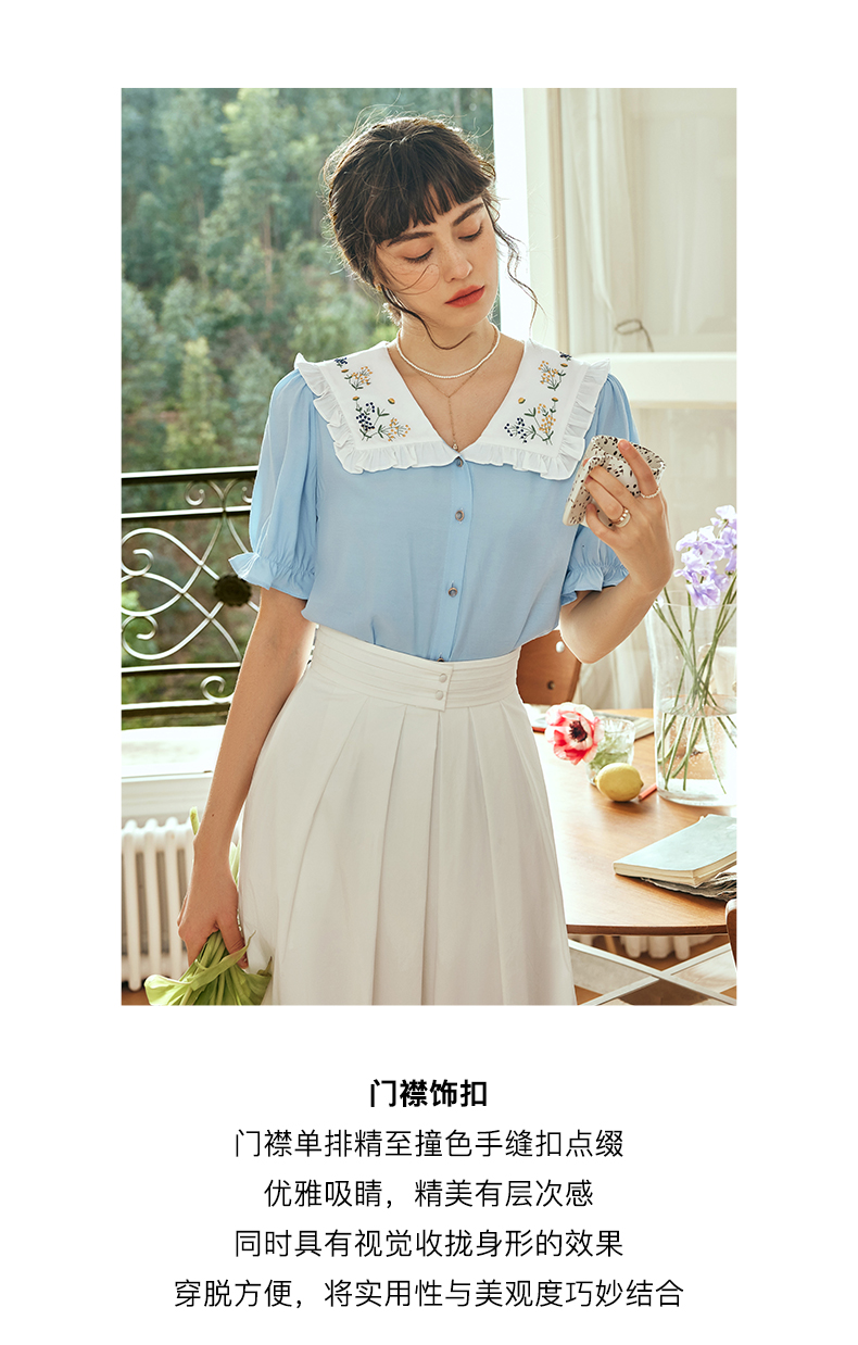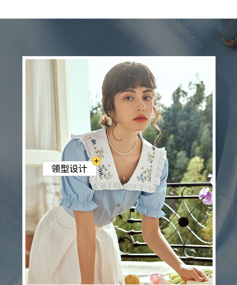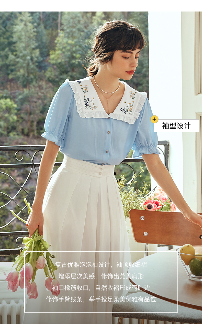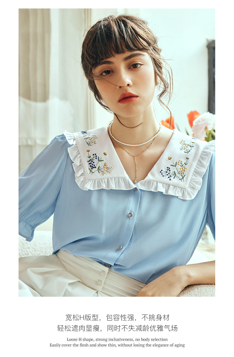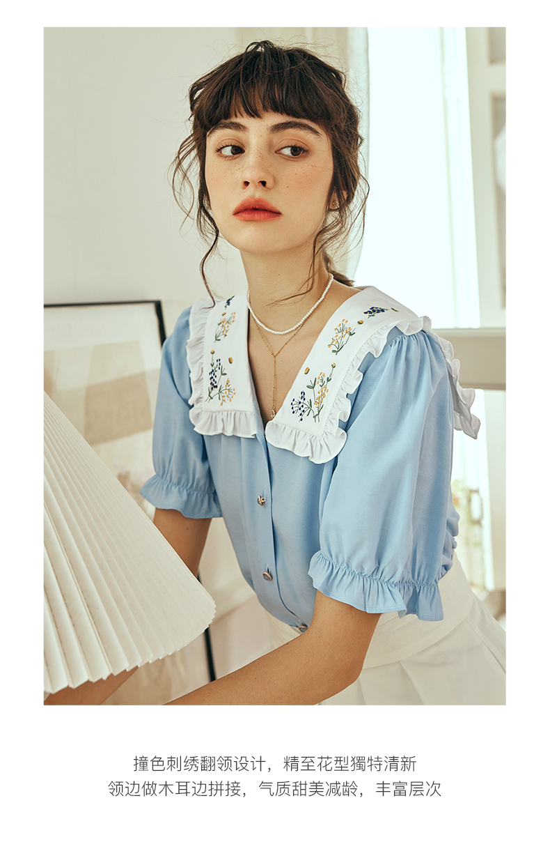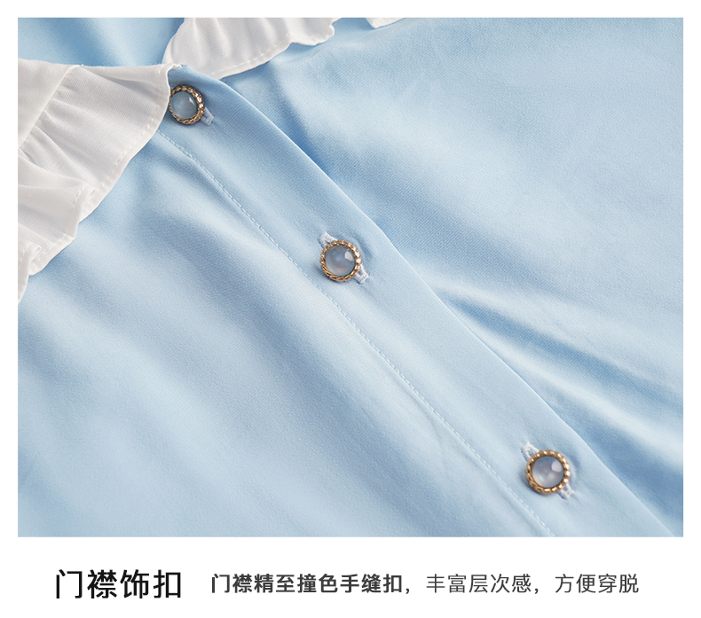 OLrain欧芮儿法式V领蕾丝雪纺衫女夏季2023年新款荷叶边拼接小衫