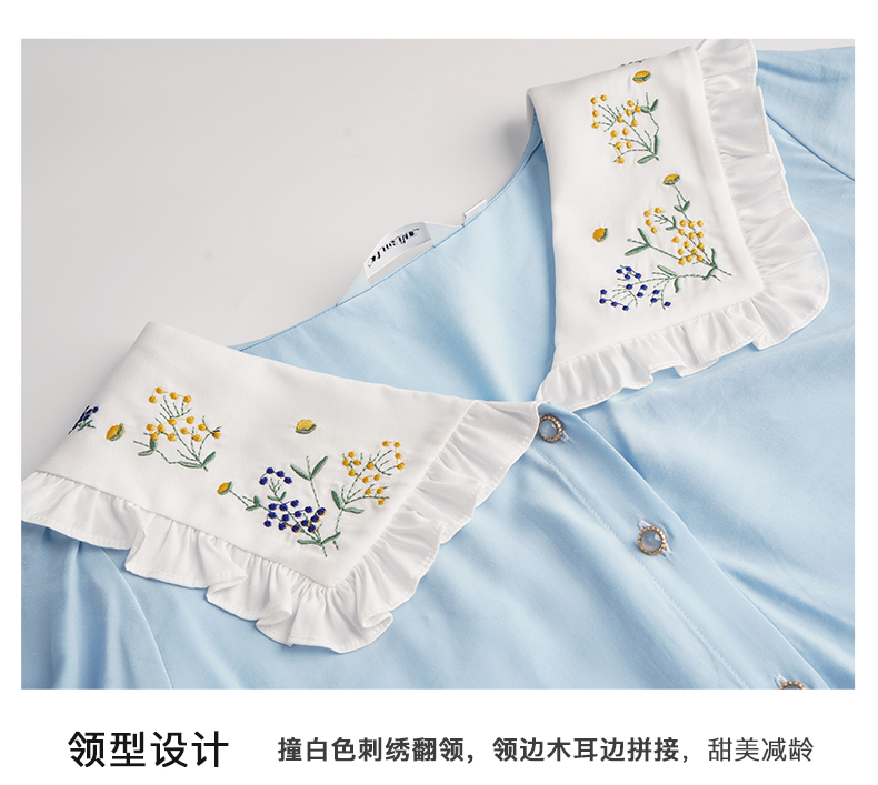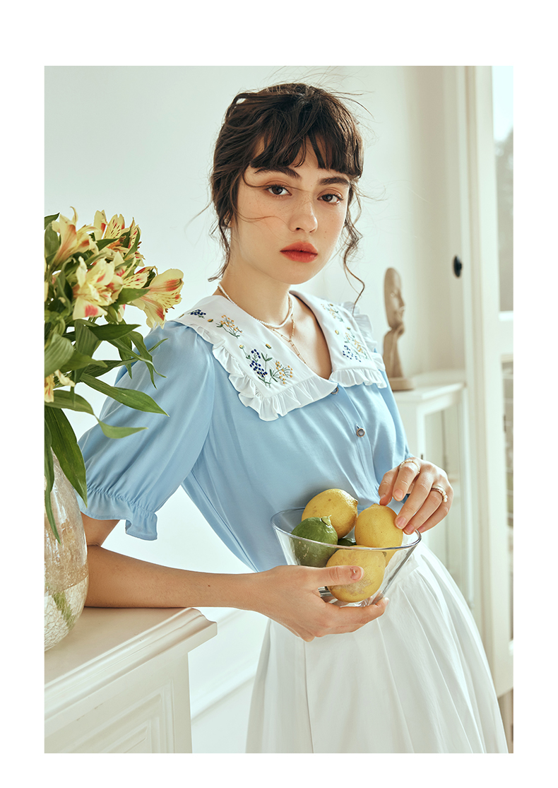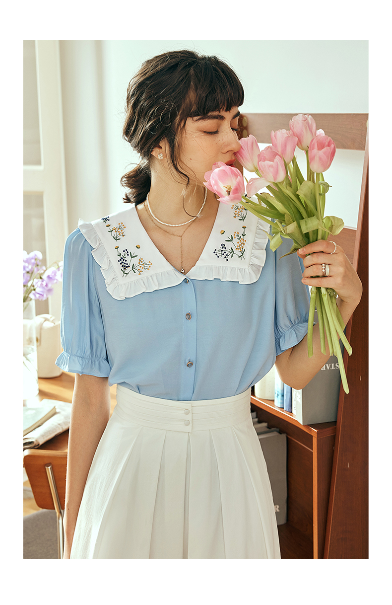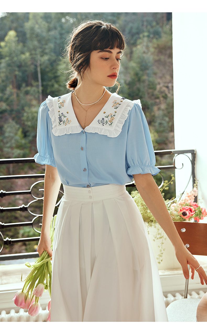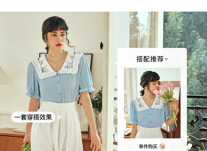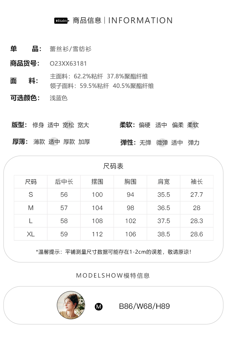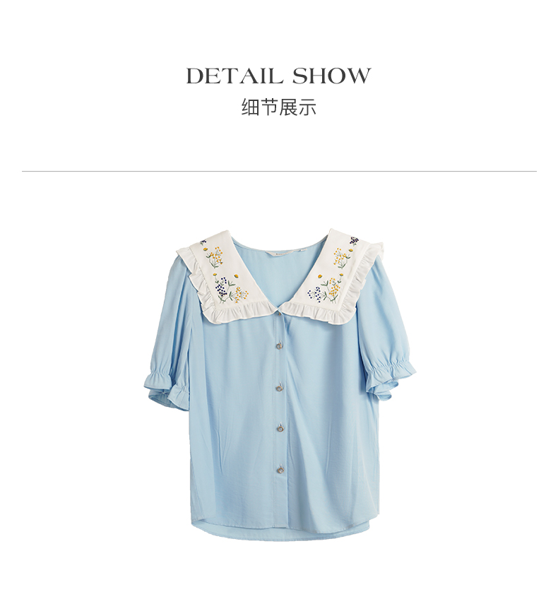 OLrain欧芮儿法式V领蕾丝雪纺衫女夏季2023年新款荷叶边拼接小衫