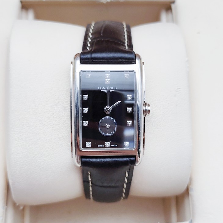 浪琴优雅系列L5.255.4.57.0女款石英表,20.5*32mm表径,黑色方盘,精钢表壳后换皮带,钻石时标刻度,9成新单表,现好价