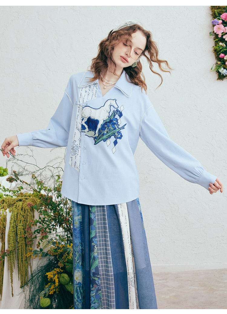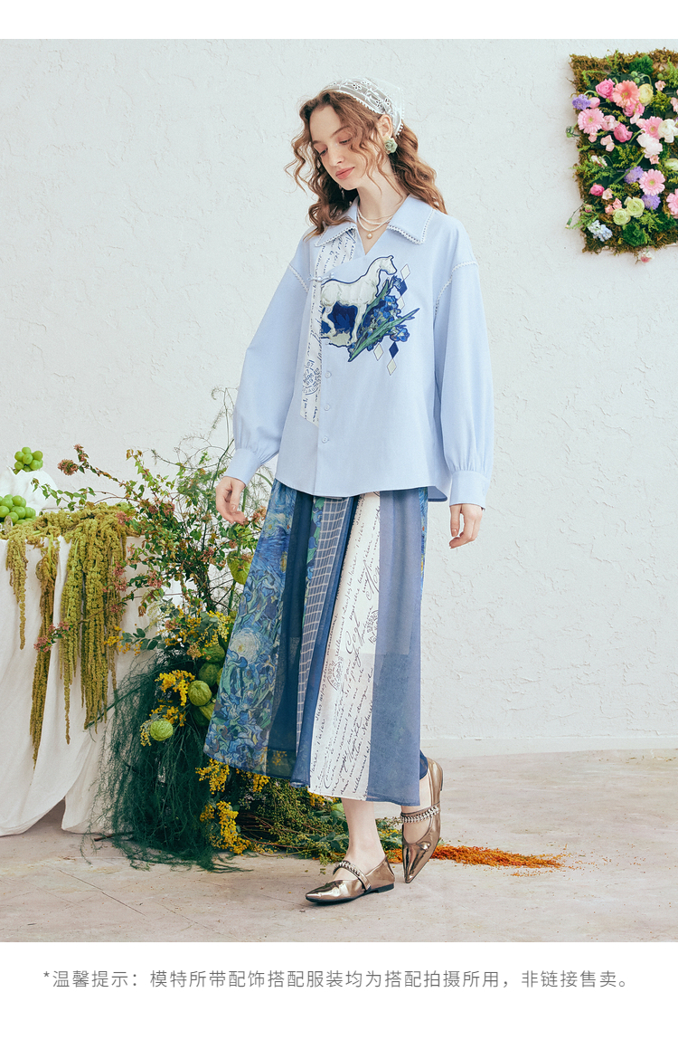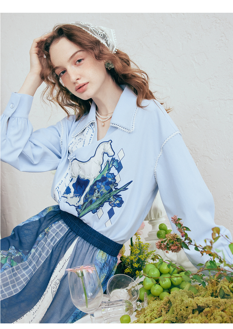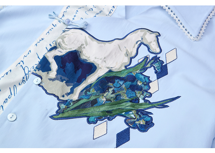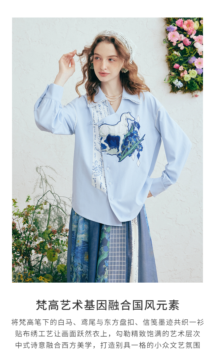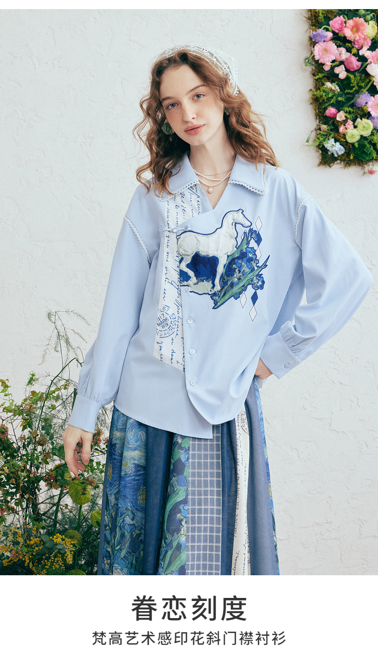 两三事梵高文艺眷恋刻度2026春新款小清新印花刺绣盘扣装饰衬衫女