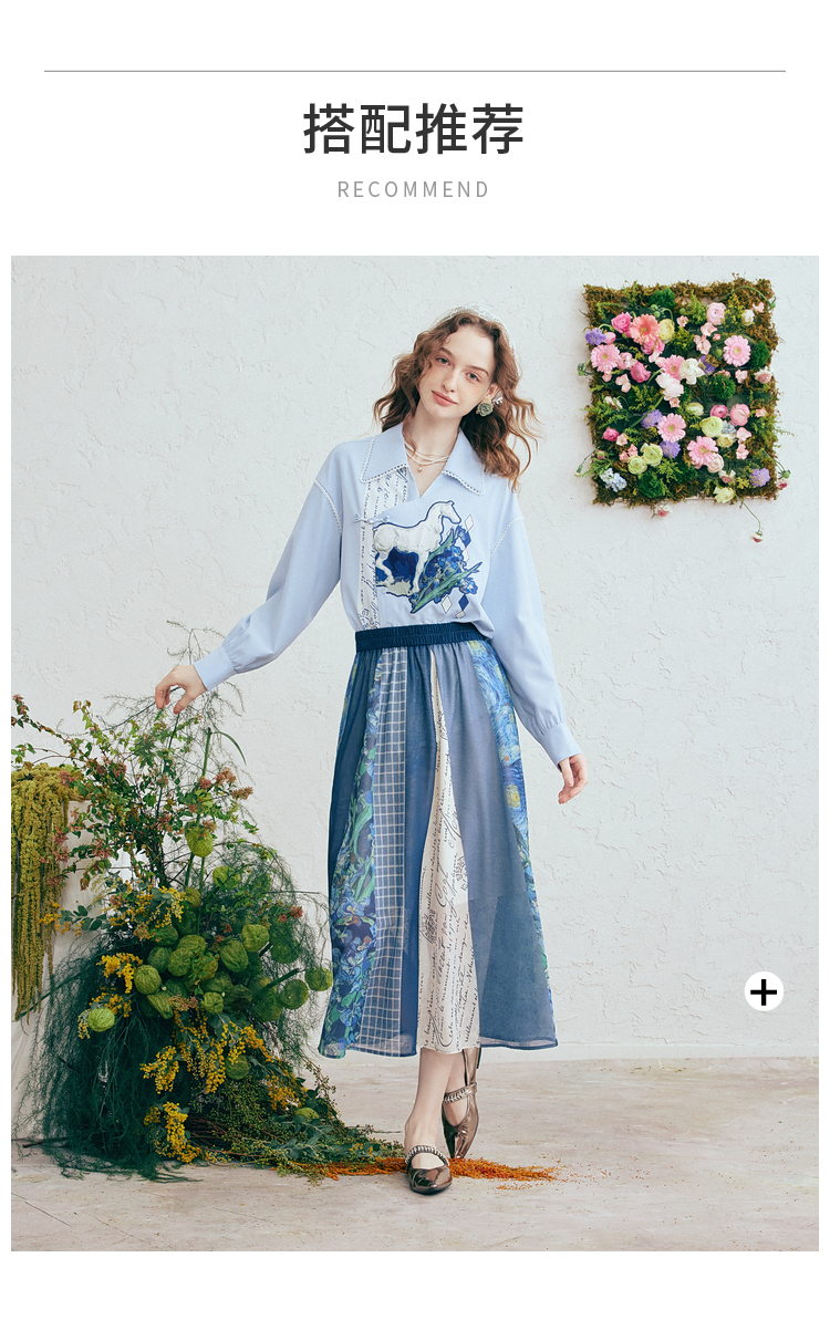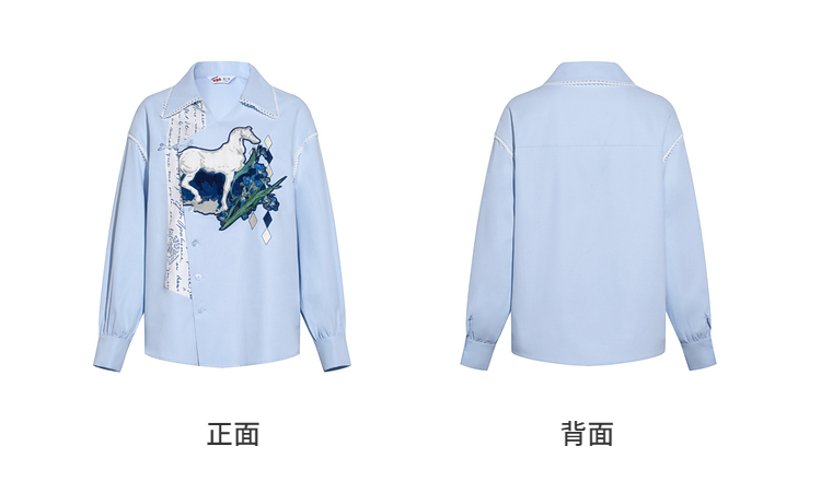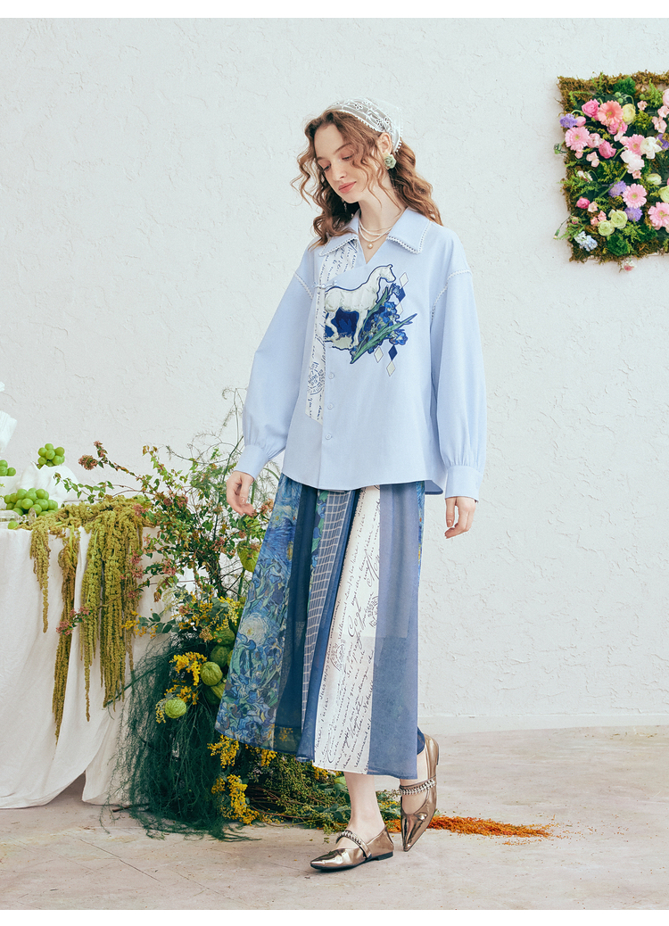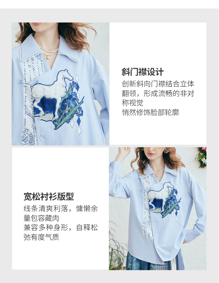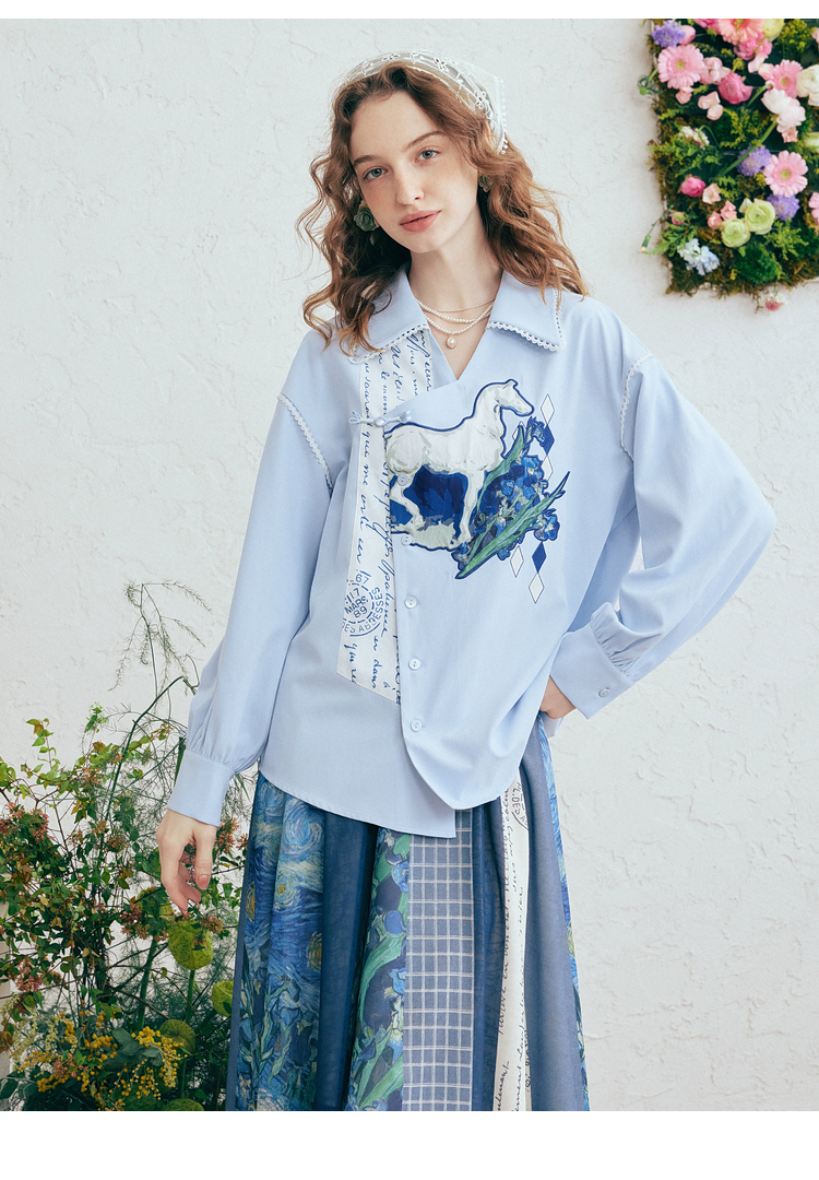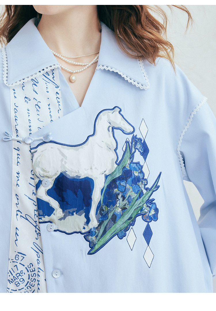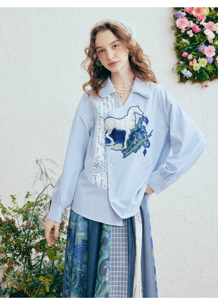 两三事梵高文艺眷恋刻度2026春新款小清新印花刺绣盘扣装饰衬衫女