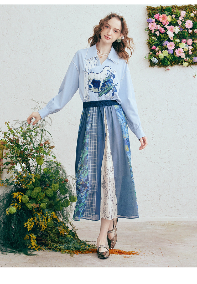 早春梵高文艺星环灵风2024春季新款法式风琴褶印花长袖衬衫女