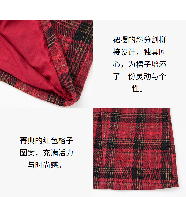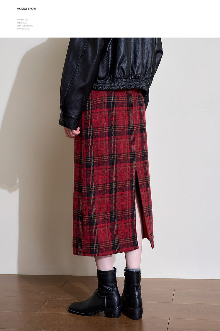 【含绵羊毛】复古风设计感格纹直筒裙女年早春保暖半身裙V4343582