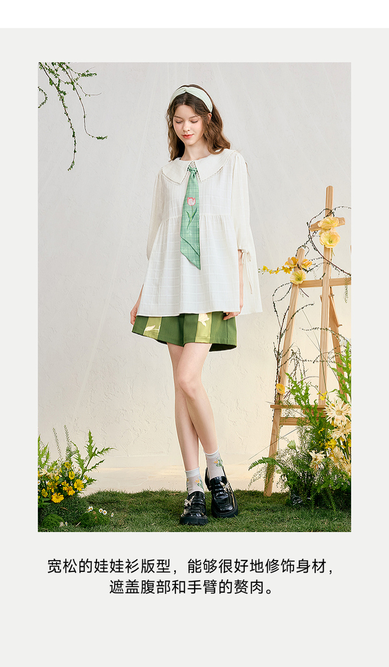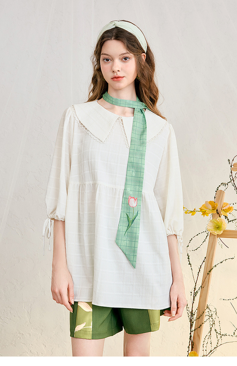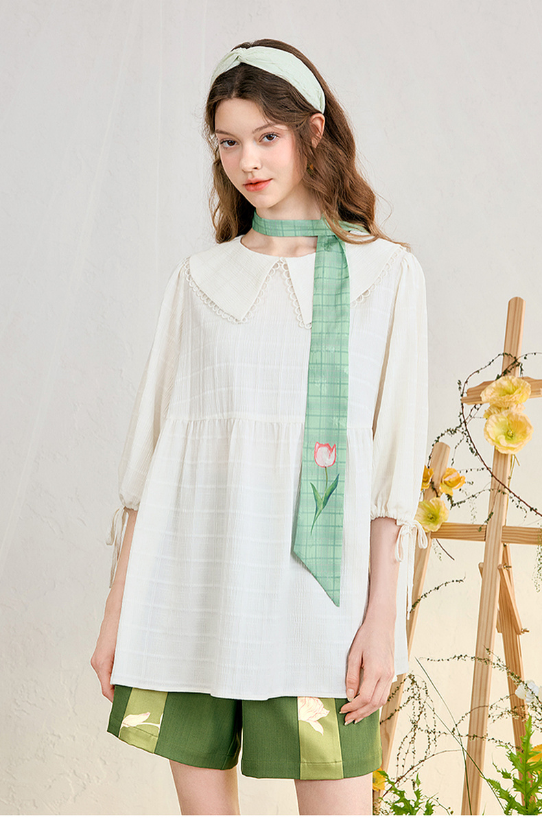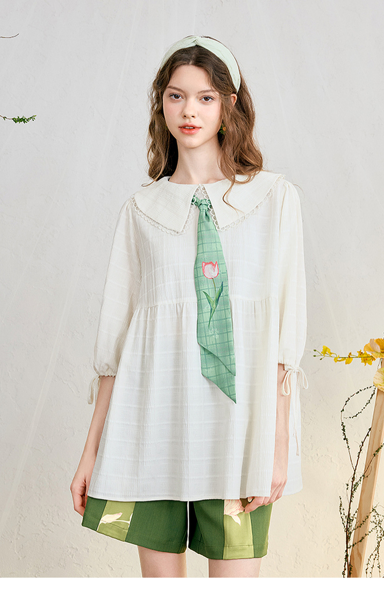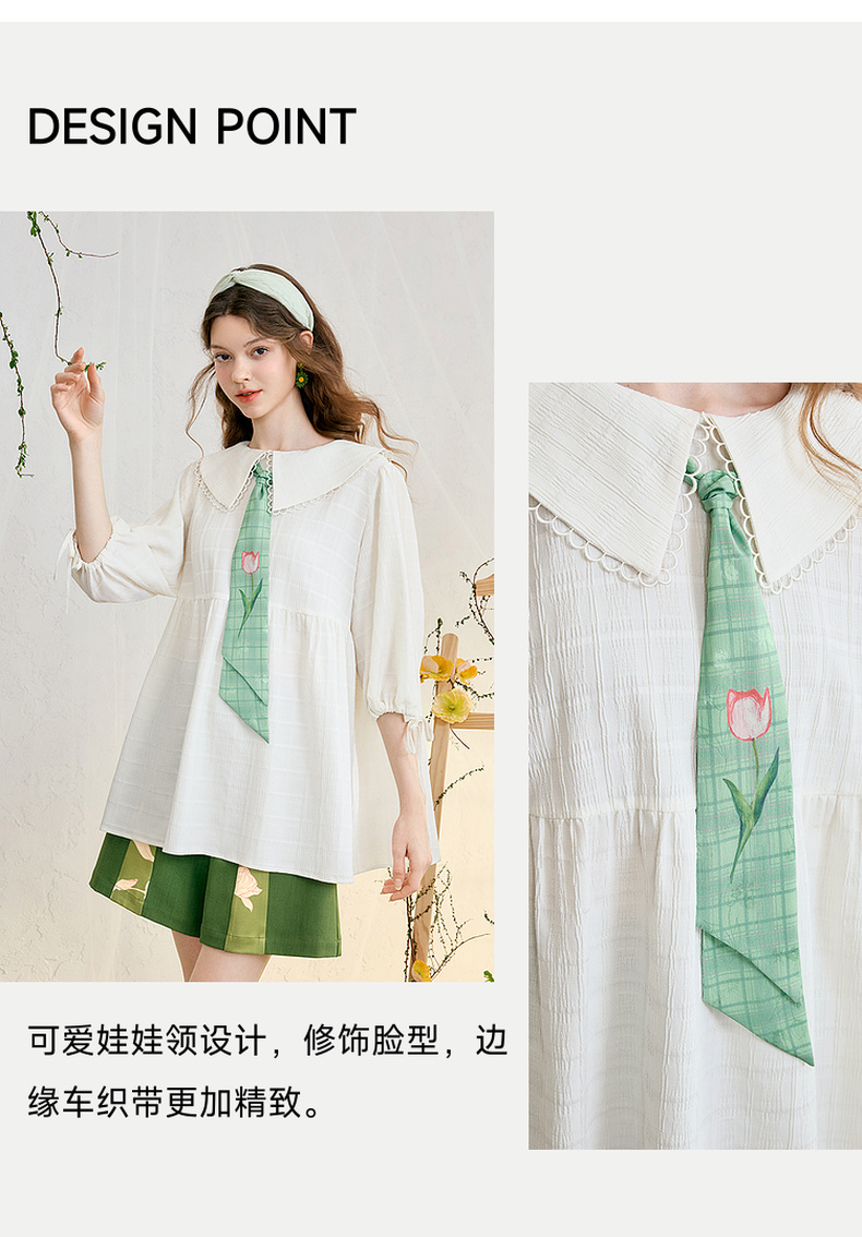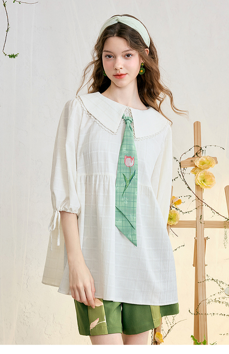 两三事 浮花清影 2025春季新款甜美印花领带绑带泡泡袖衬衫女宽松