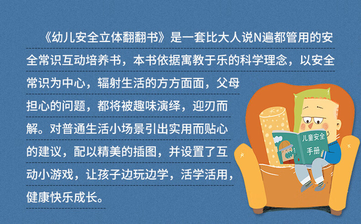 《幼儿安全立体翻翻书》是一套比大人说N遍都管用的安全常识互动培养书,本书依据寓教于乐的科学理念,以安全常识为中心,辐射生活的方方面面,父母担心的问题,都将被趣味演绎,迎刃而解。对普通生活小场景引出实用而贴心的建议,配以精美的插图,并设置了互动小游戏,让孩子边玩边学,活学活用,健康快乐成长。