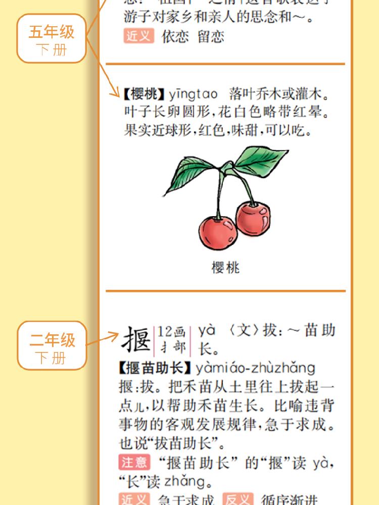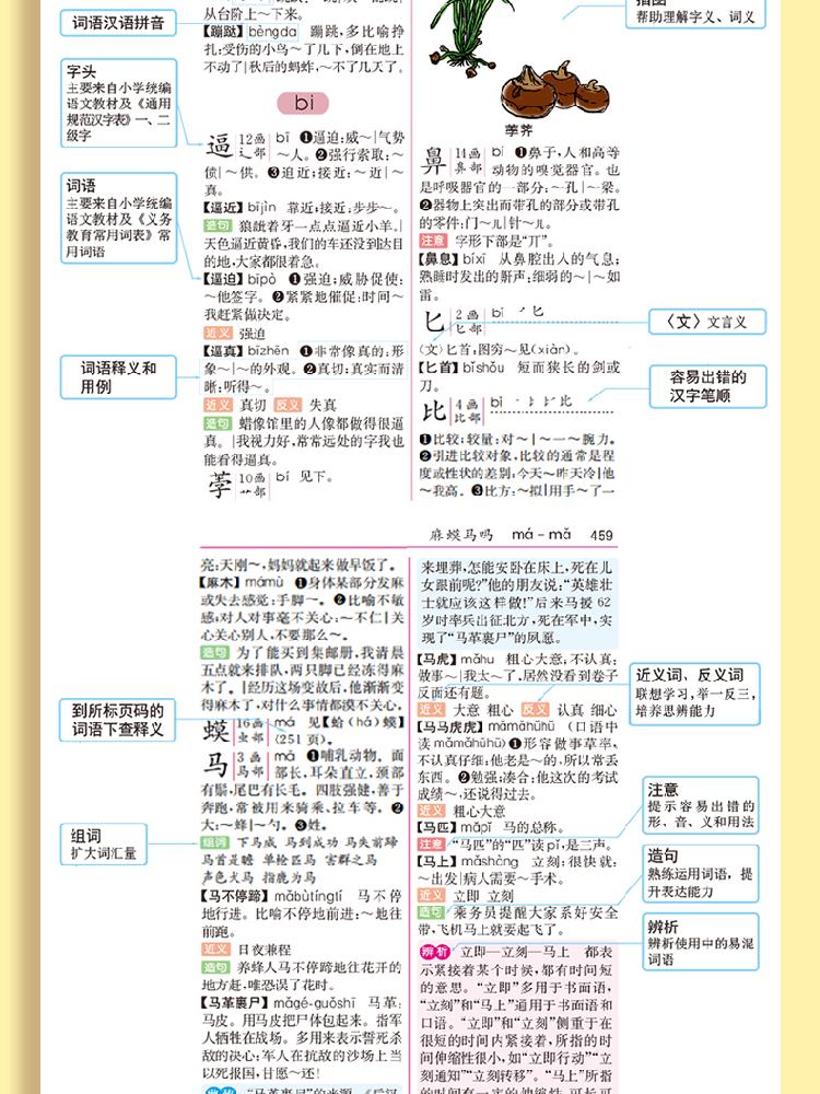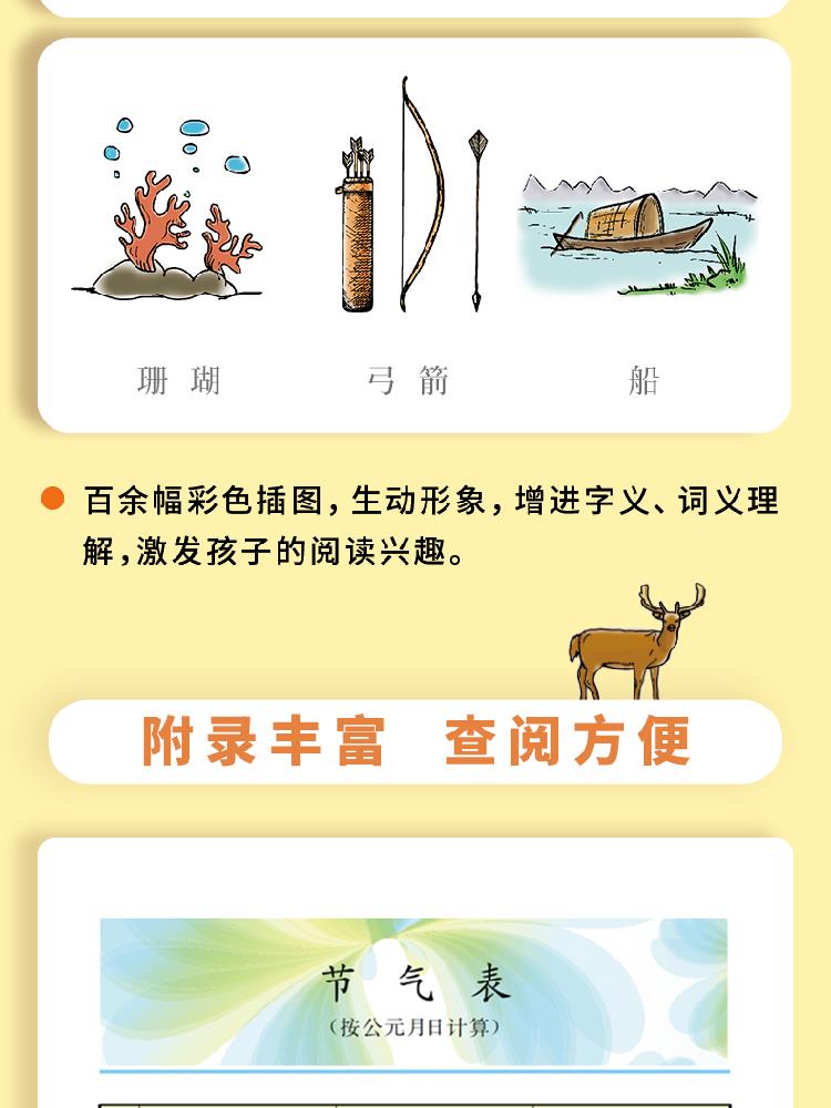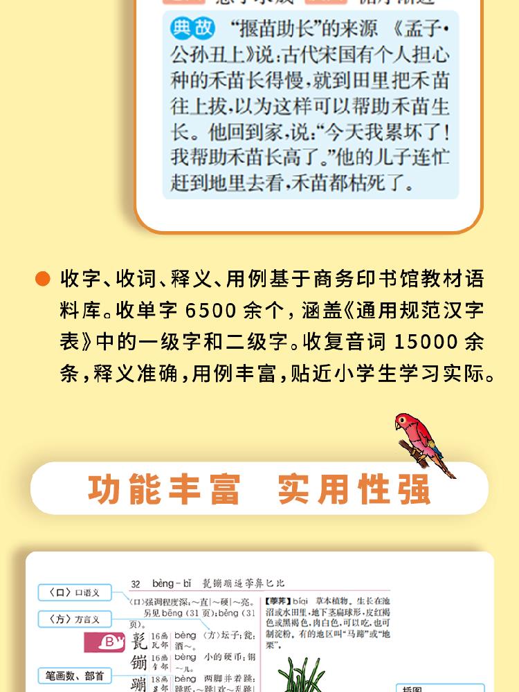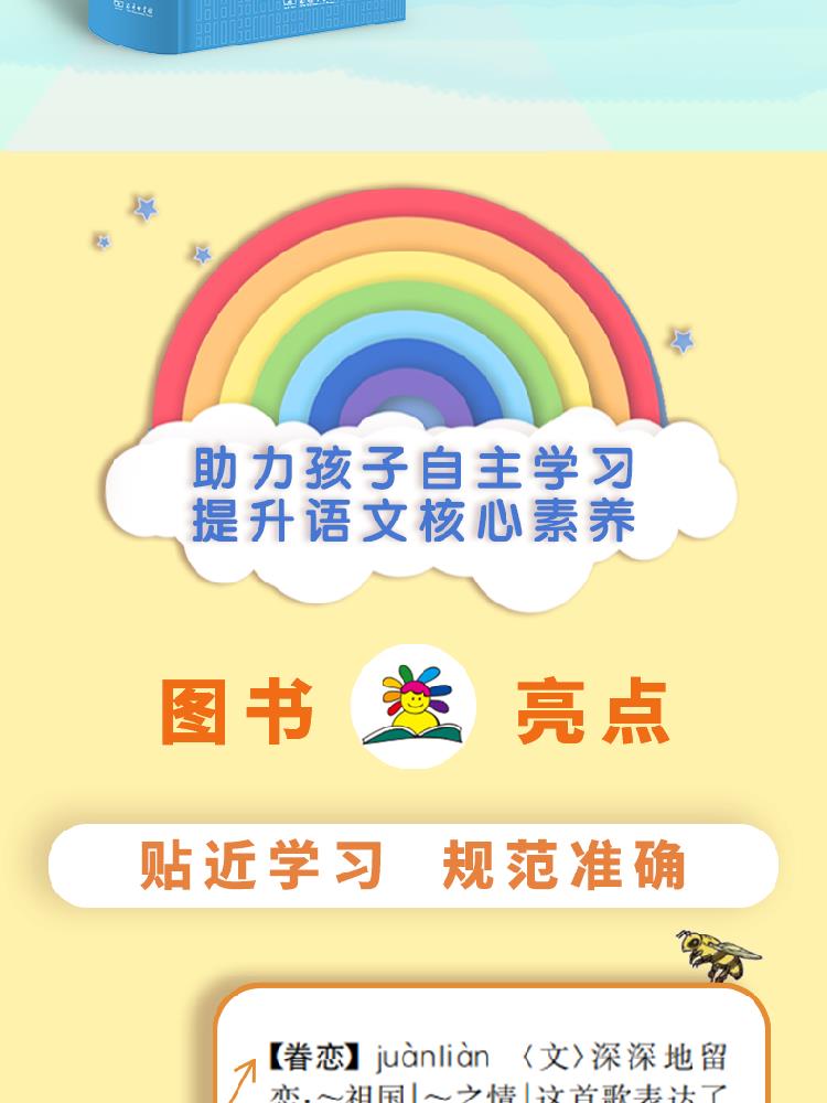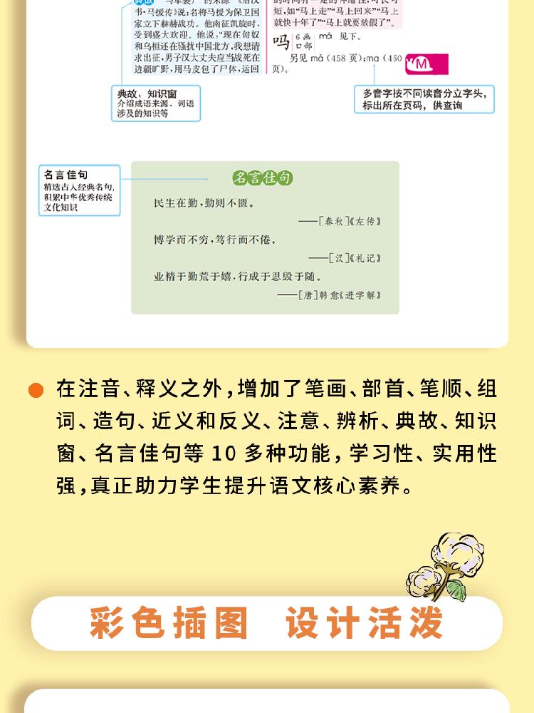 在准确注音、释义的基础上,还设立笔画、部首、笔顺、组词、造句、近义词、反义词、注意、辨析、典故、知识窗、名言佳句等10余个板块,助力小学生提升语文核心素养。
