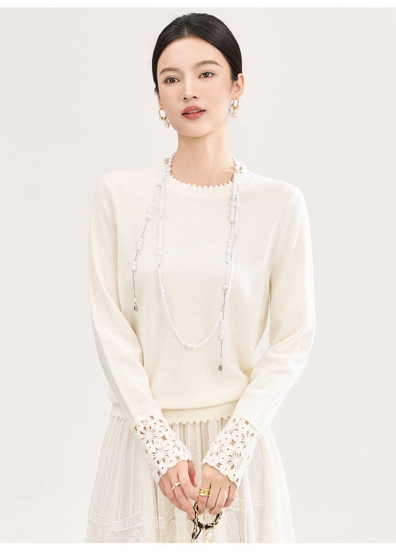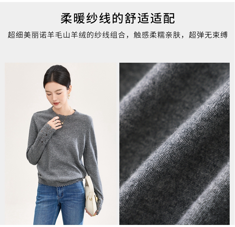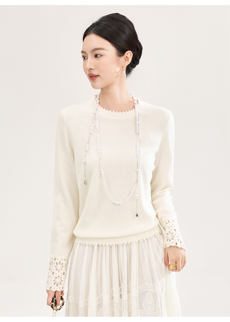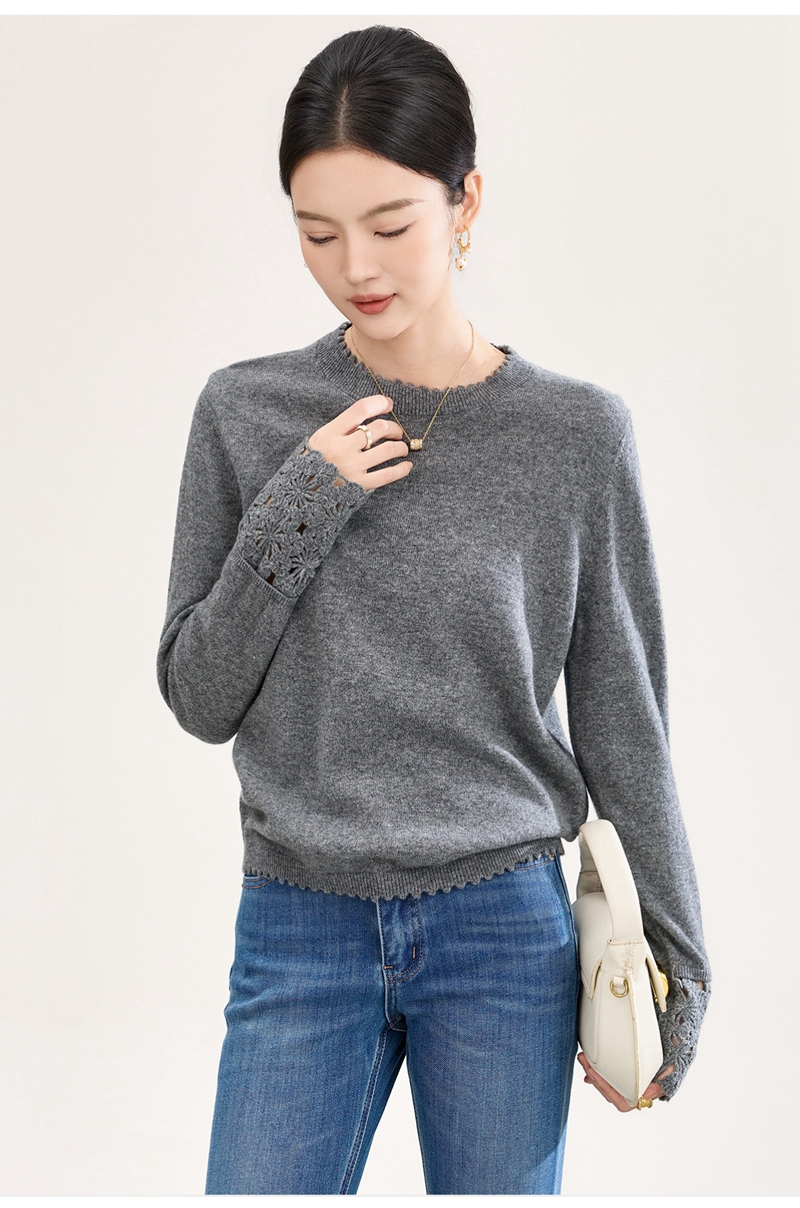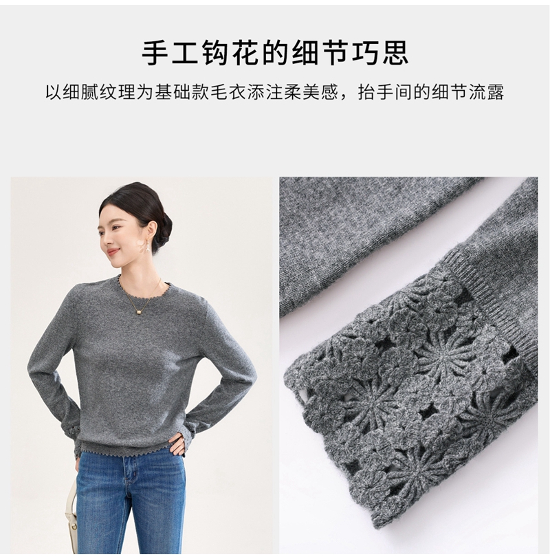 山羊绒手工镂空钩花芽边圆领长袖针织上衣