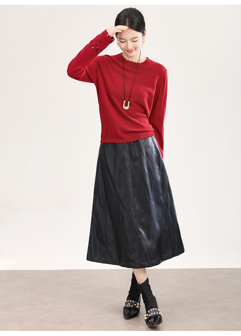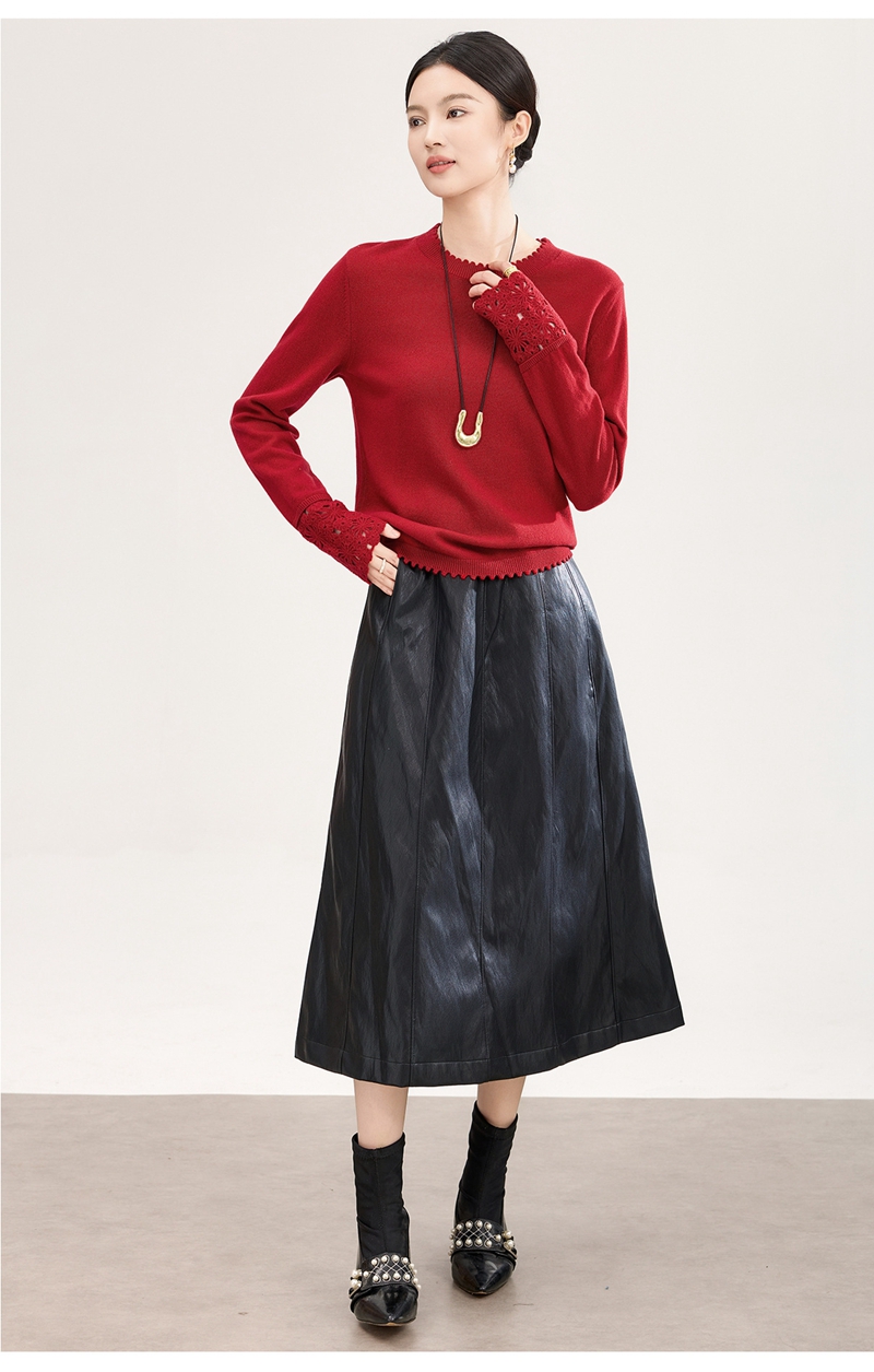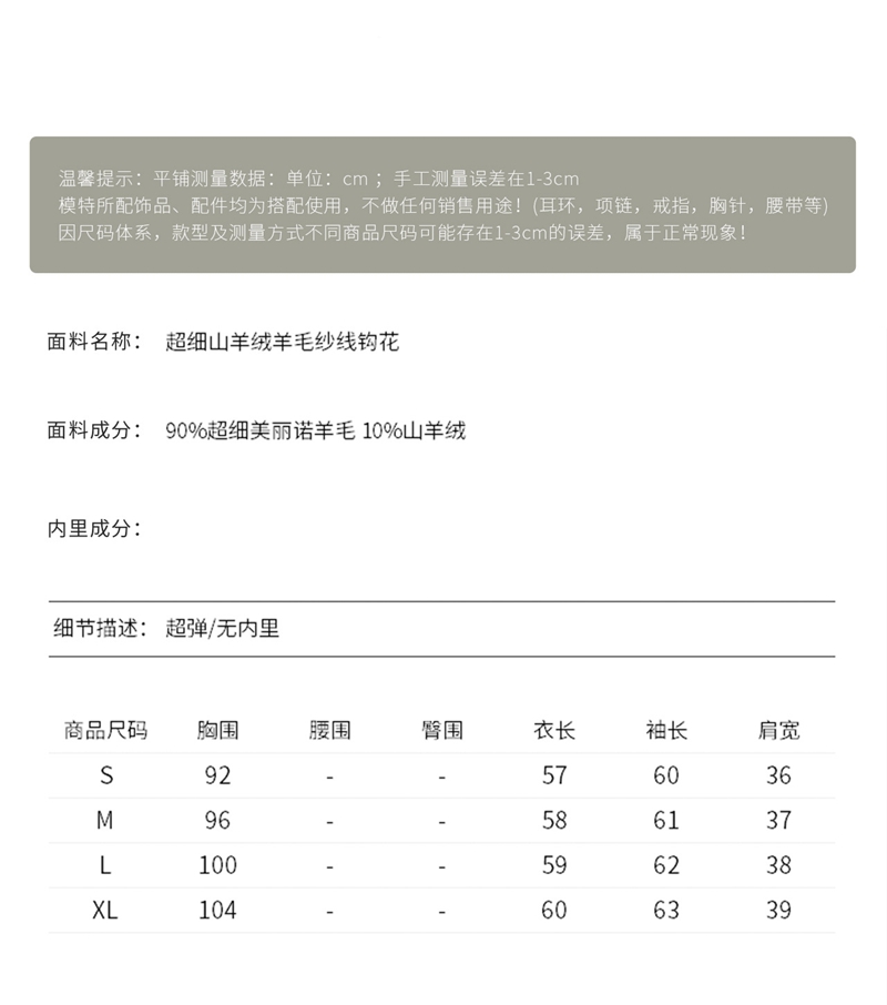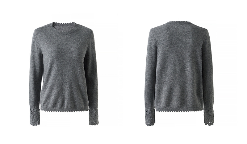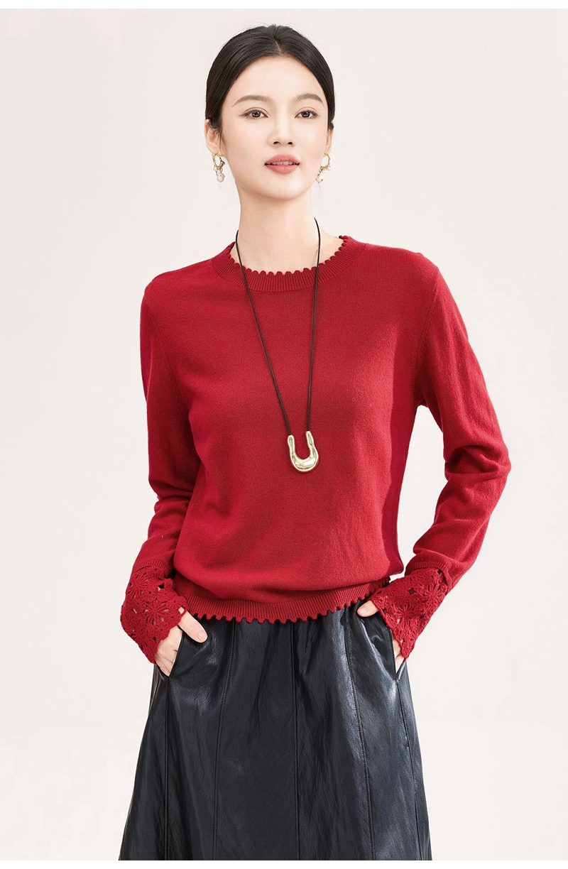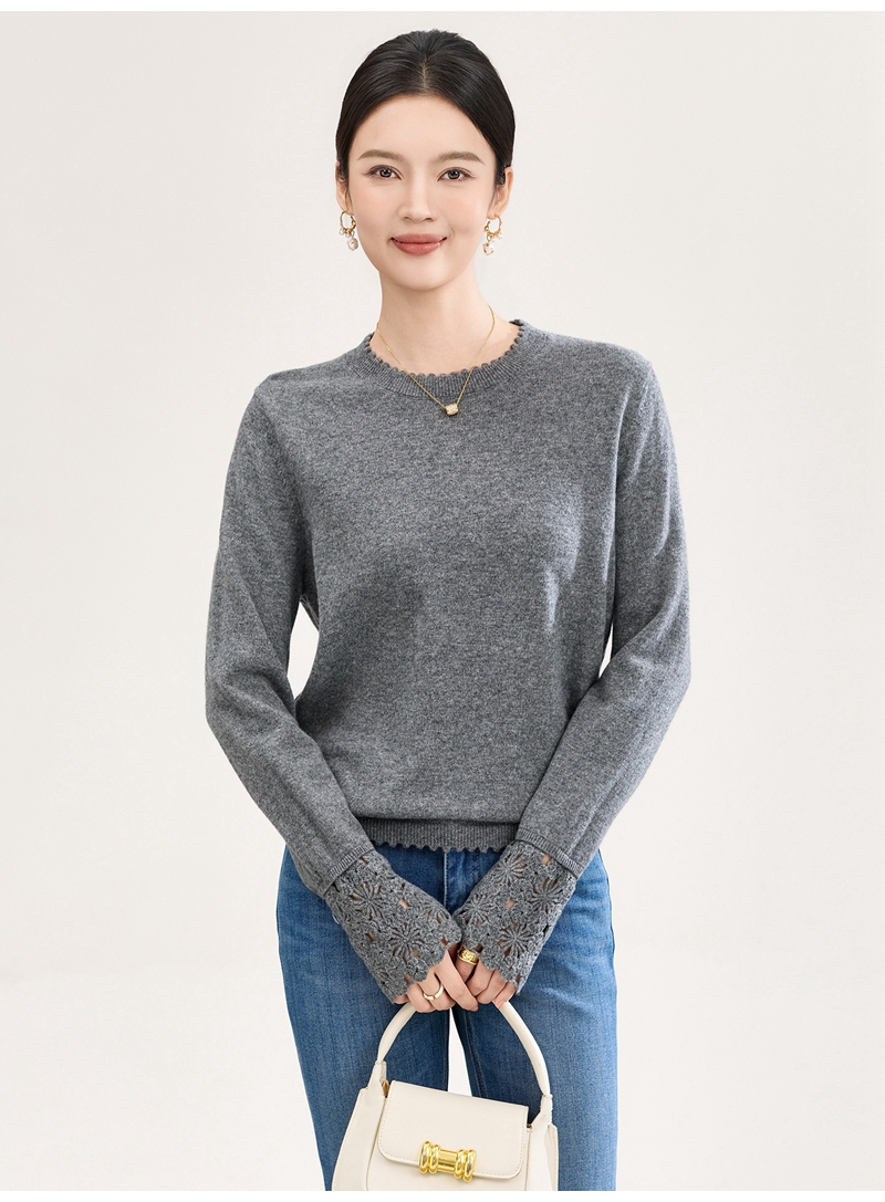 山羊绒手工镂空钩花芽边圆领长袖针织上衣