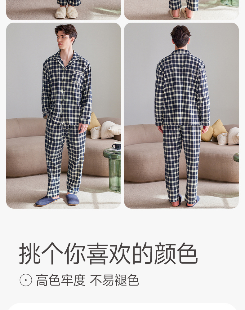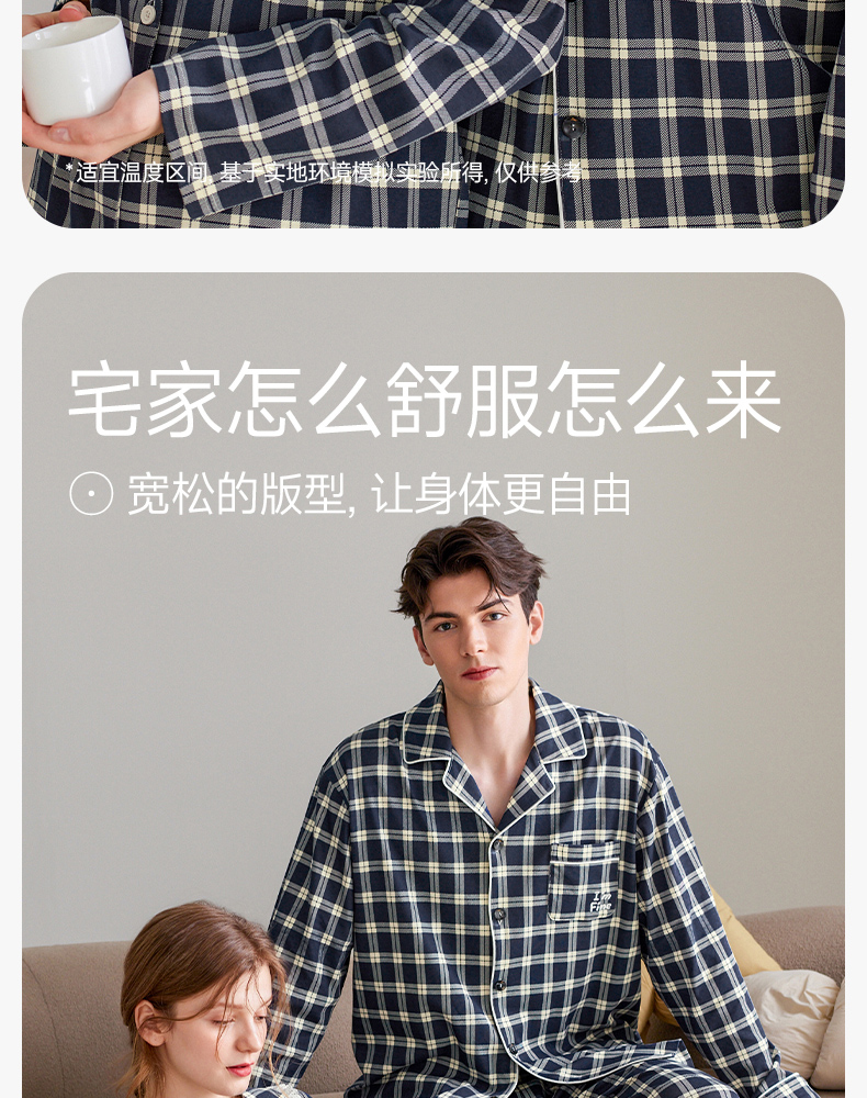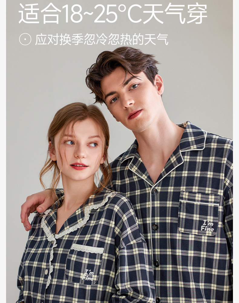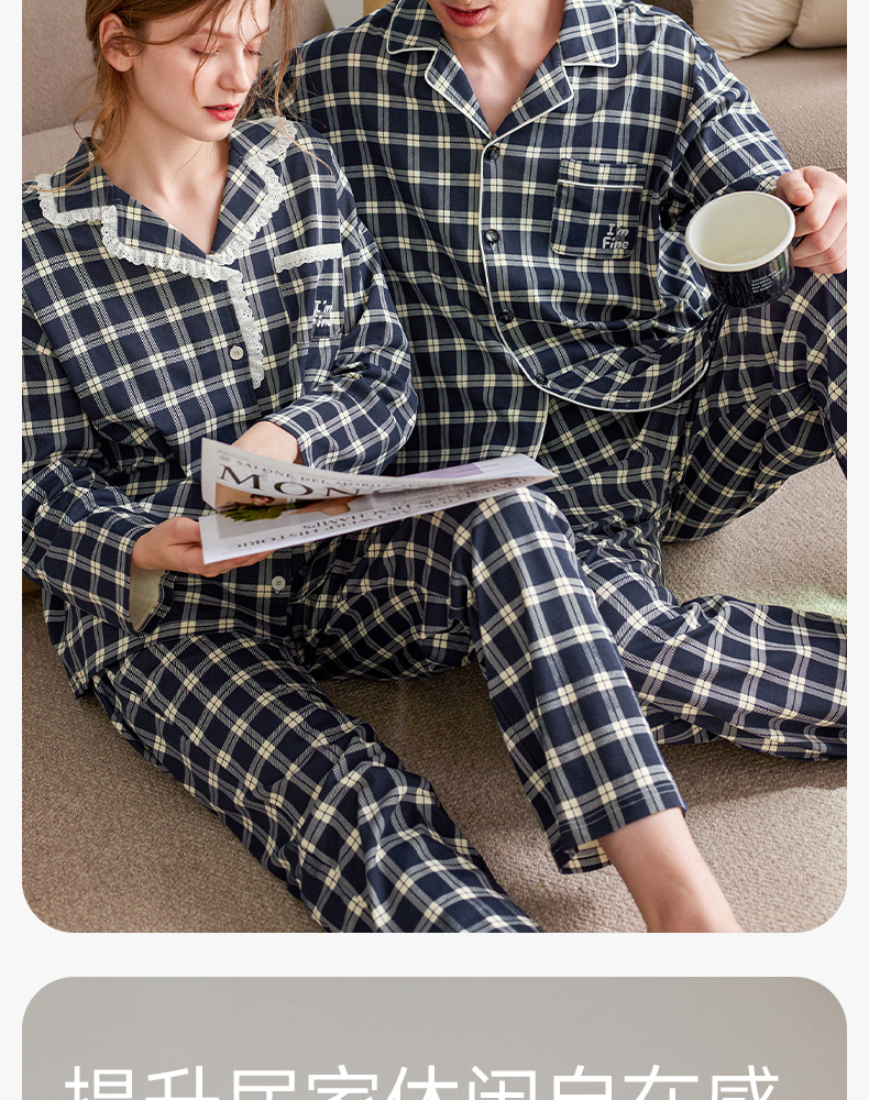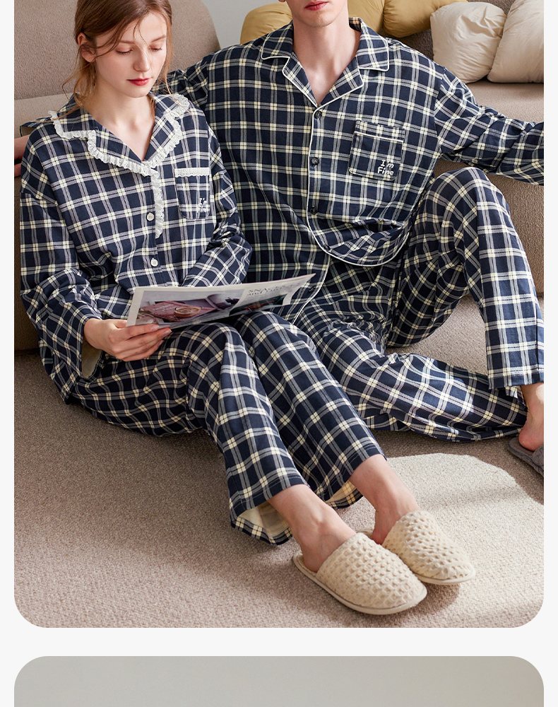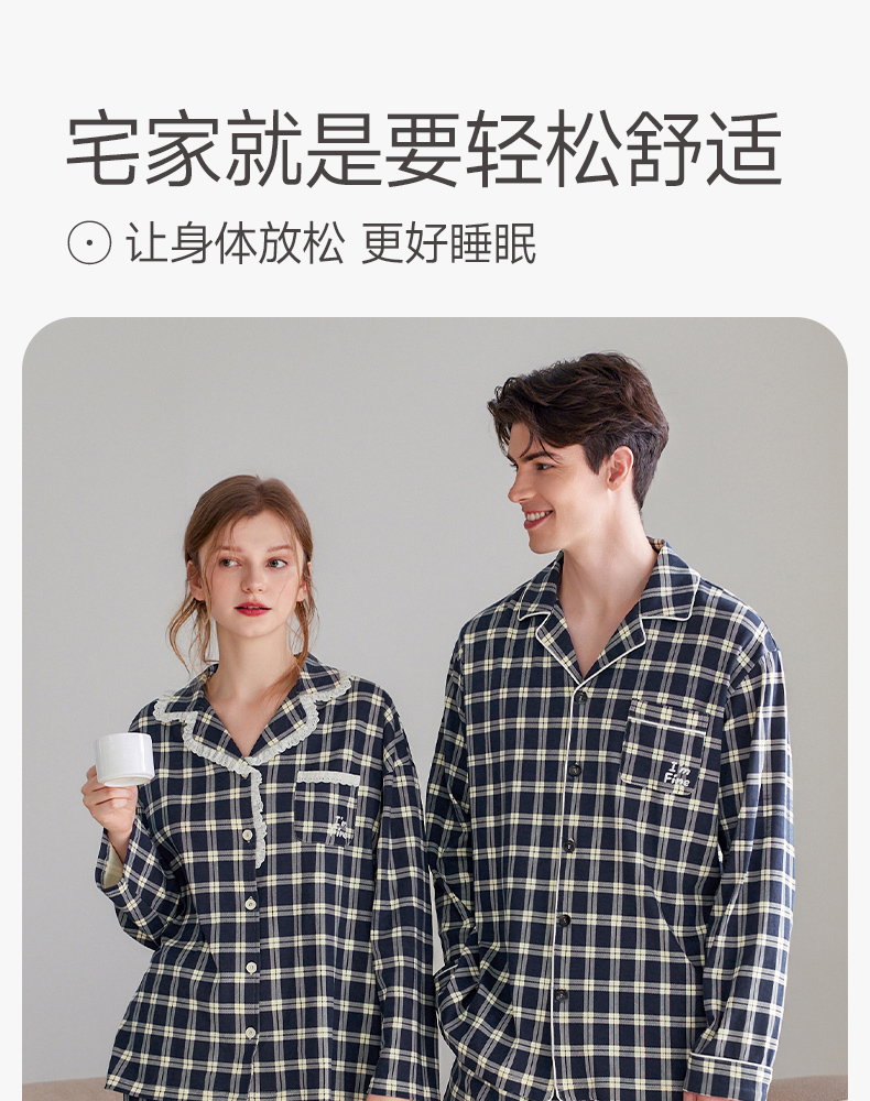 芬腾长袖情侣睡衣春秋季纯棉开衫套装男女格子宽松大码全棉家居服