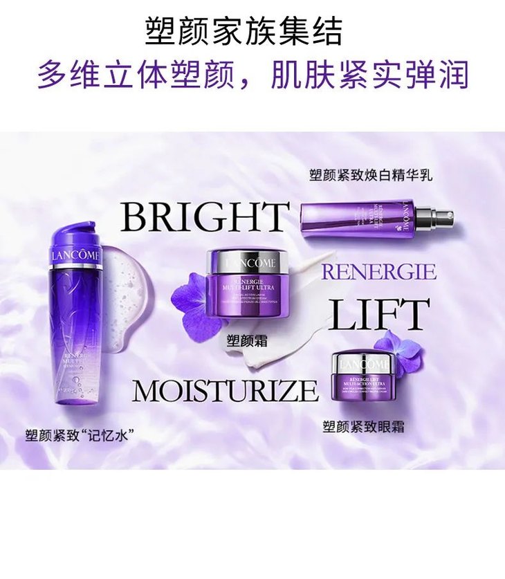 自1992年上市以来,Lancome兰蔻立体塑颜系列不断升级,以最佳针对性的方式为各类肌肤衰老问题提供了完美、前沿、尖端的解决方案。2016年,Lancome兰蔻运用独家创新的[Up-Cohésion]?科技(“向芯力”紧致提拉因子),全新臻献Lancome兰蔻新塑颜修护凝露水和Lancome兰蔻新塑颜修护按摩霜,提拉紧致效果明显、持久有效。:Lancome兰蔻新塑颜修护凝露水,质地独特,吸收快速,瞬间提拉 。 前沿科技凝结无与伦比的高效产品,带来卓越超群的非凡功效,引领女性开启塑颜提拉的全新纪元。