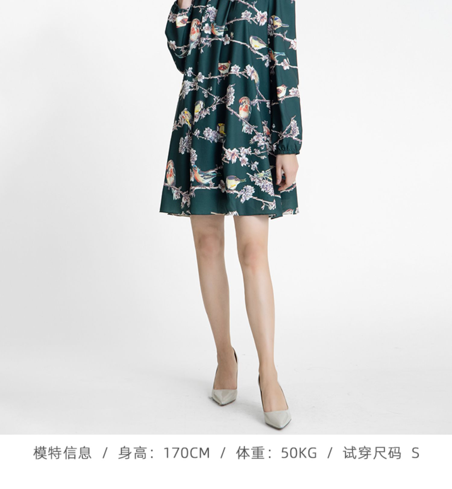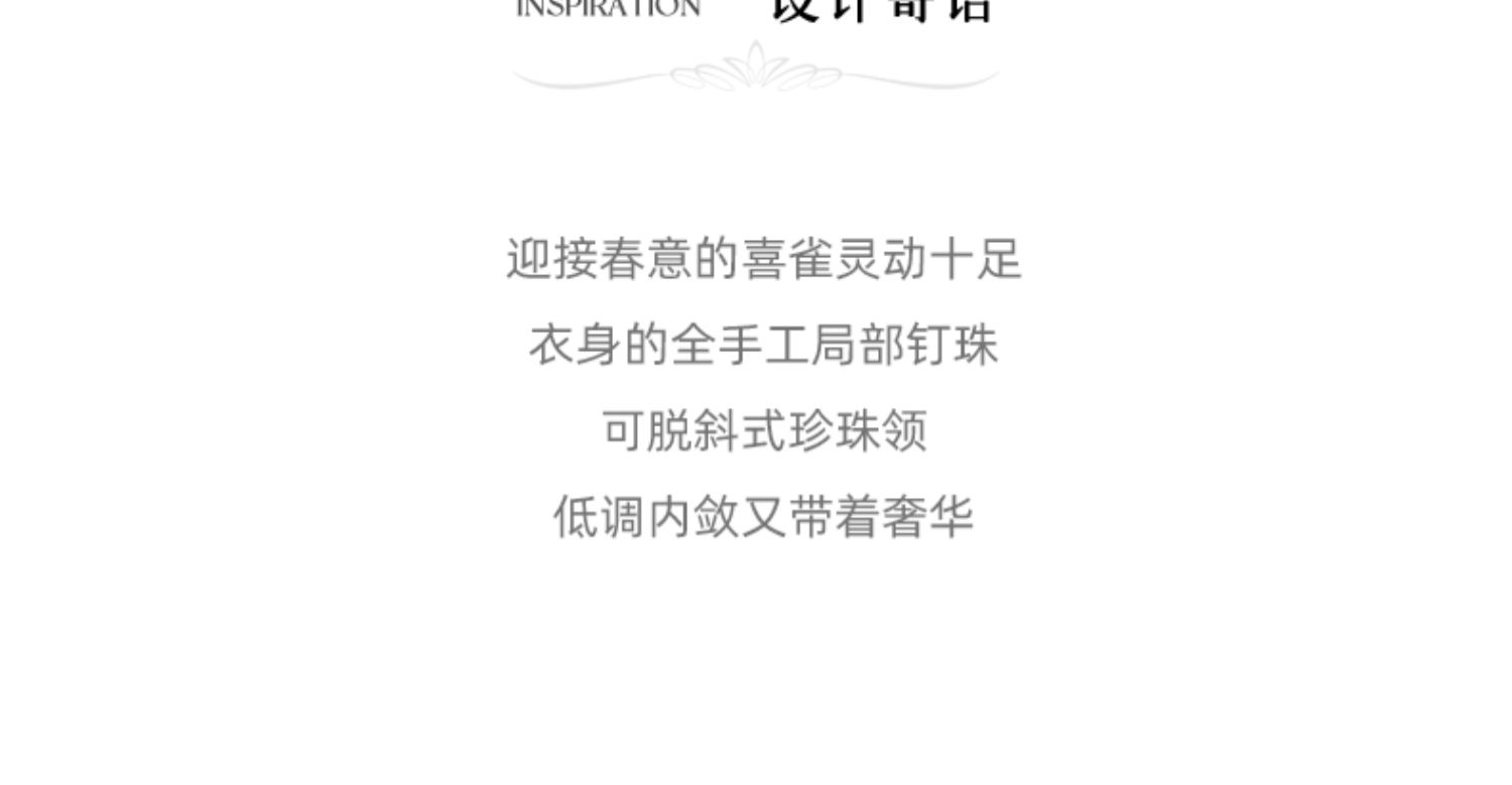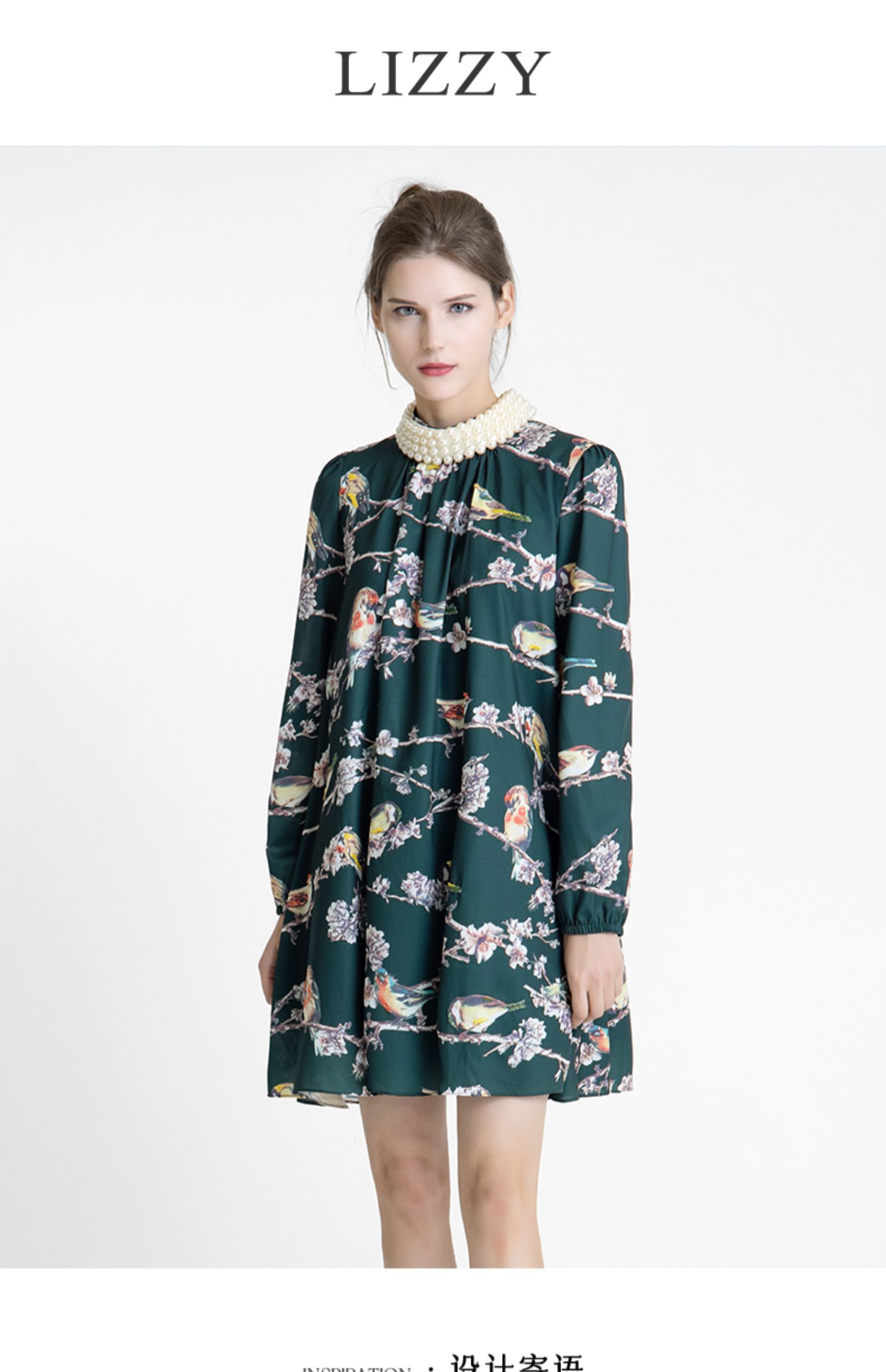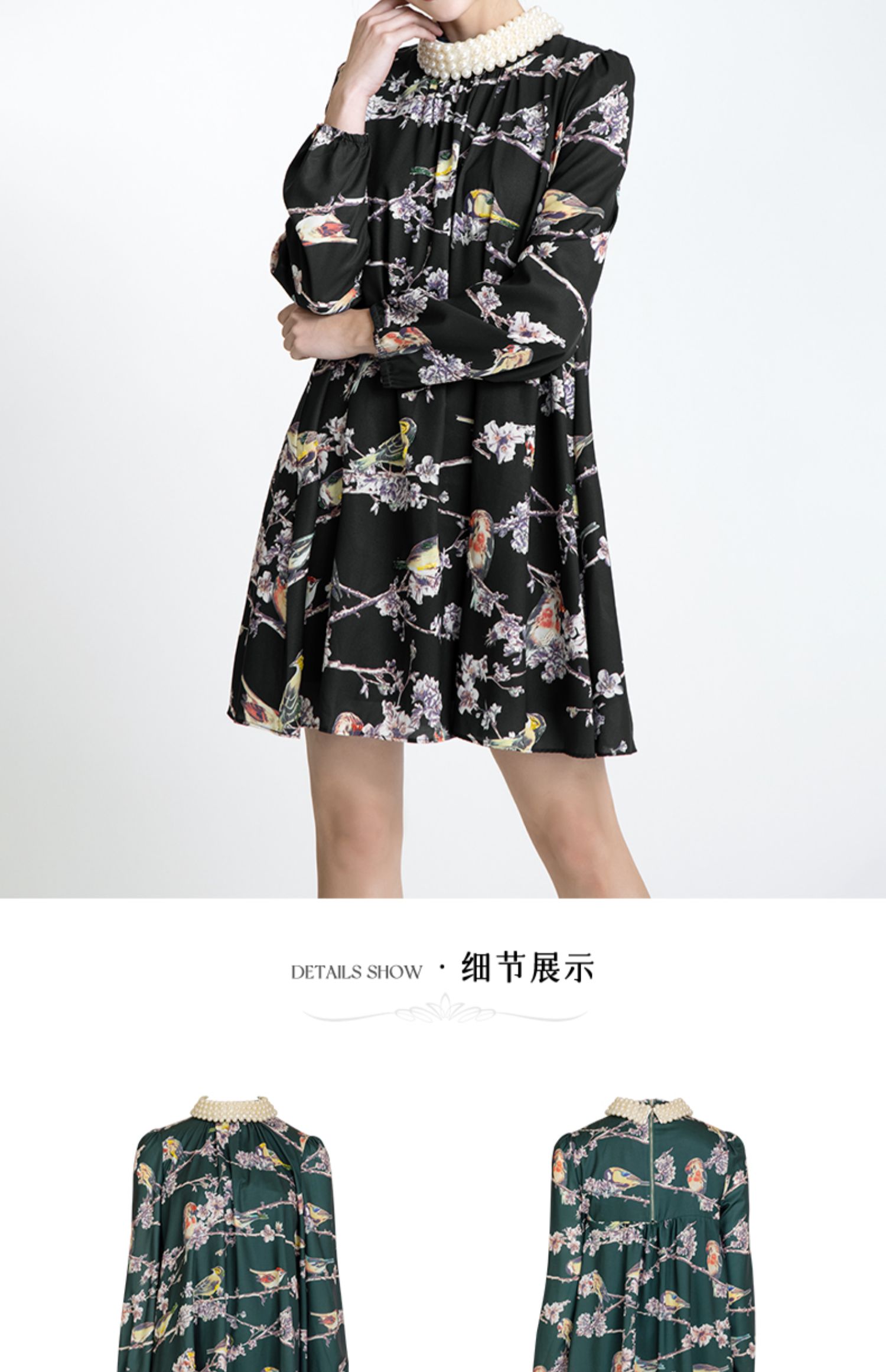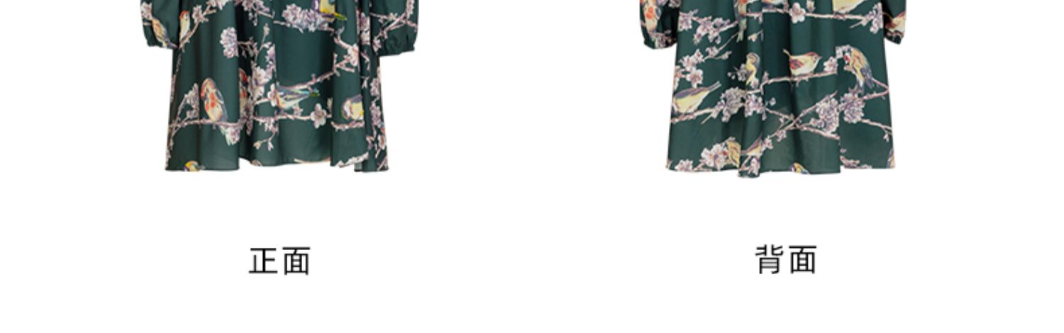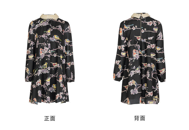 LIZZY 古典优雅名媛风立数码印花喜鹊梅花钉珠连衣裙(配珍珠项链)5396