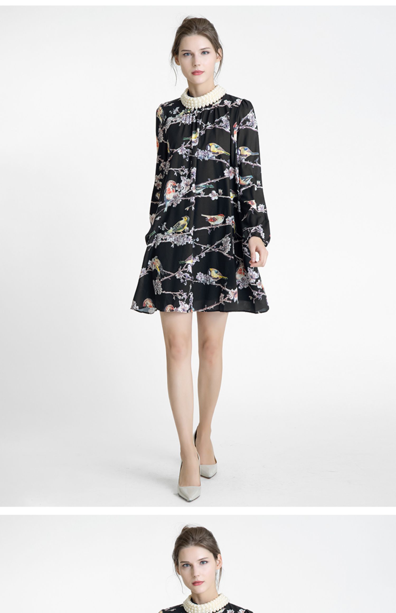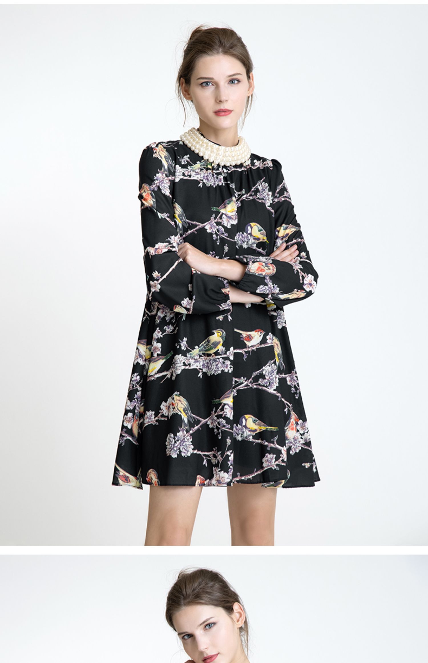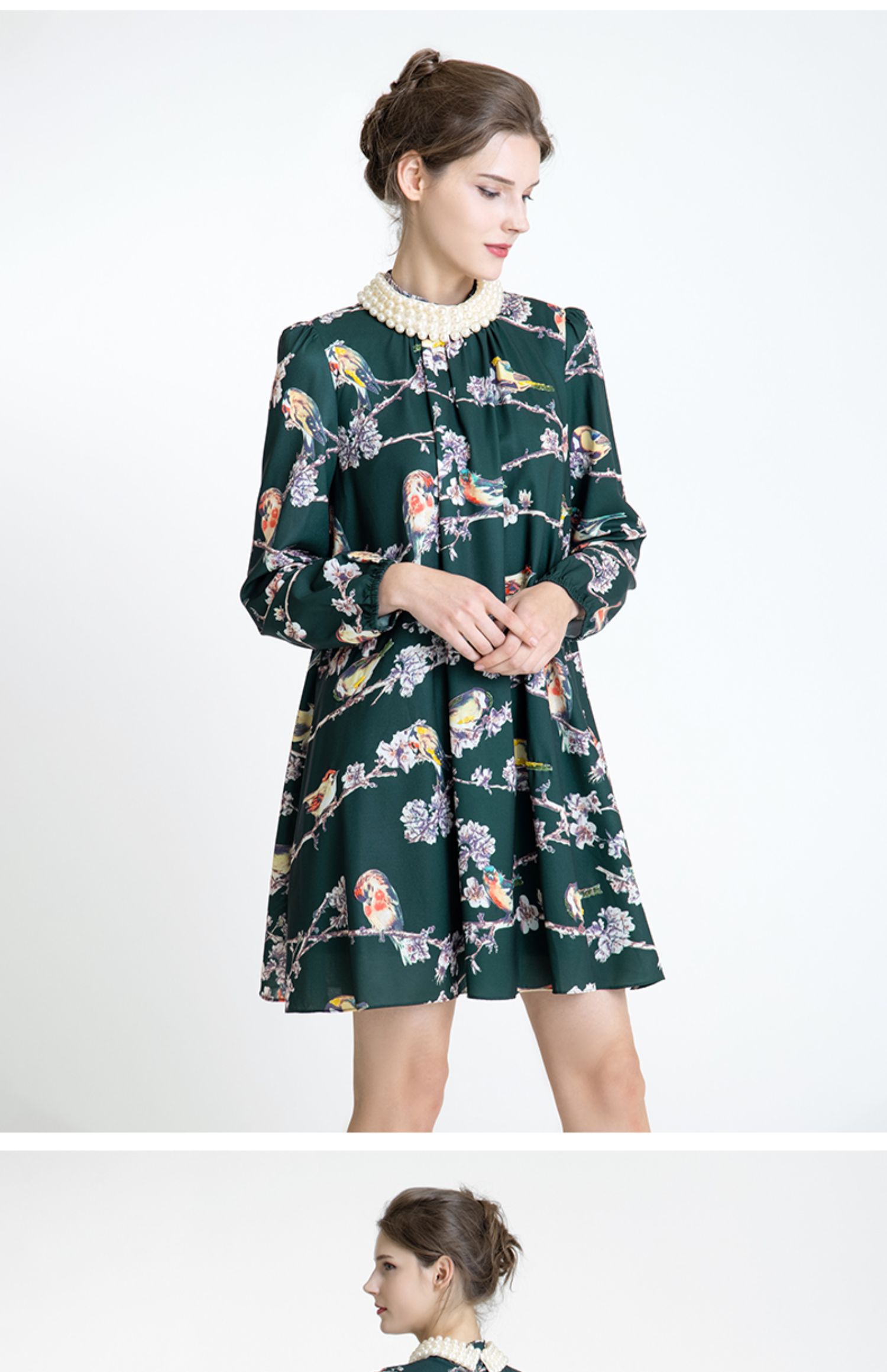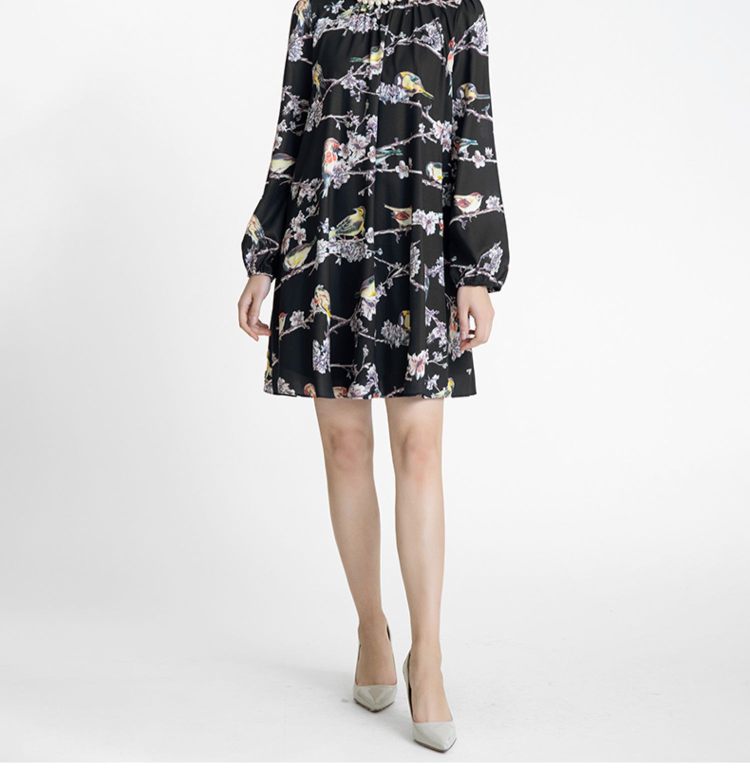 LIZZY 古典优雅名媛风立数码印花喜鹊梅花钉珠连衣裙(配珍珠项链)5396