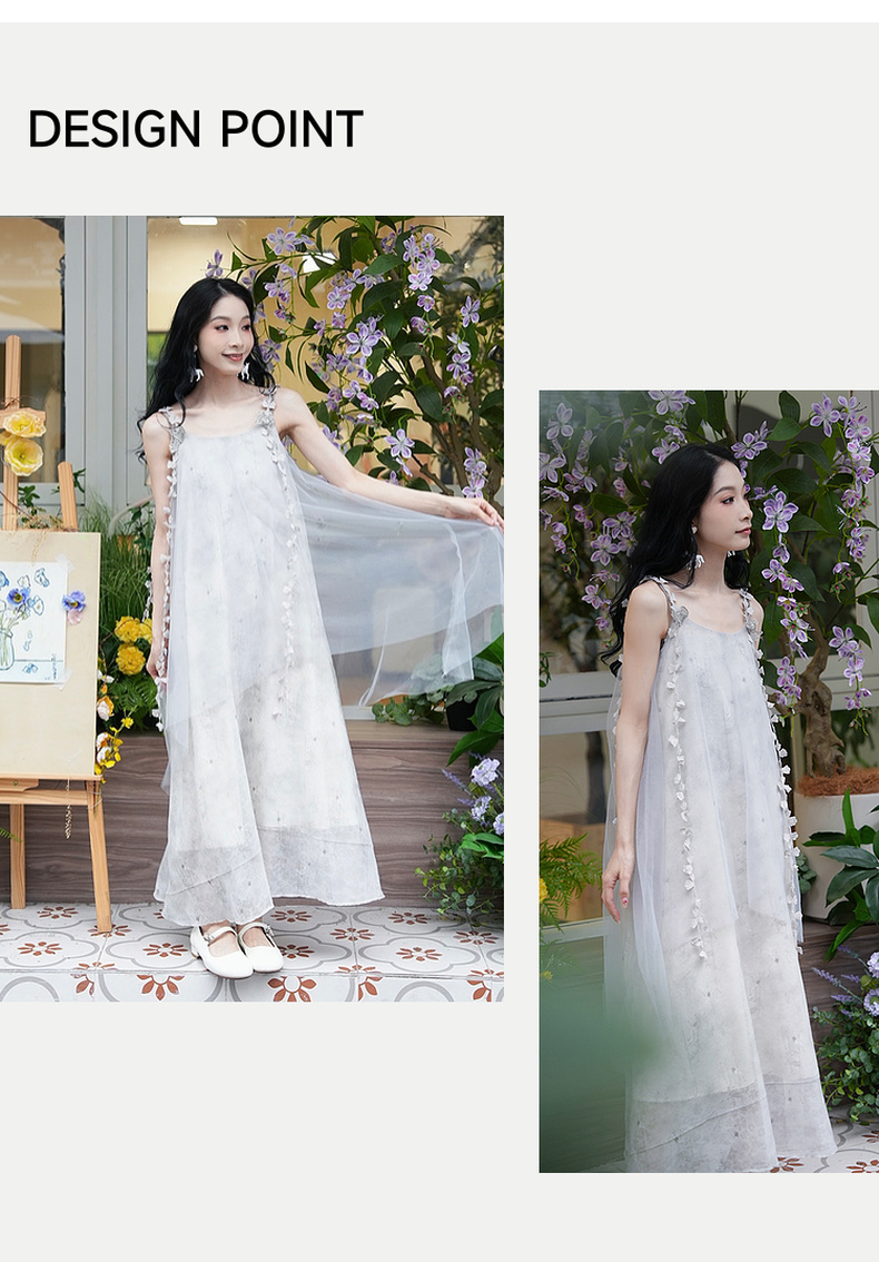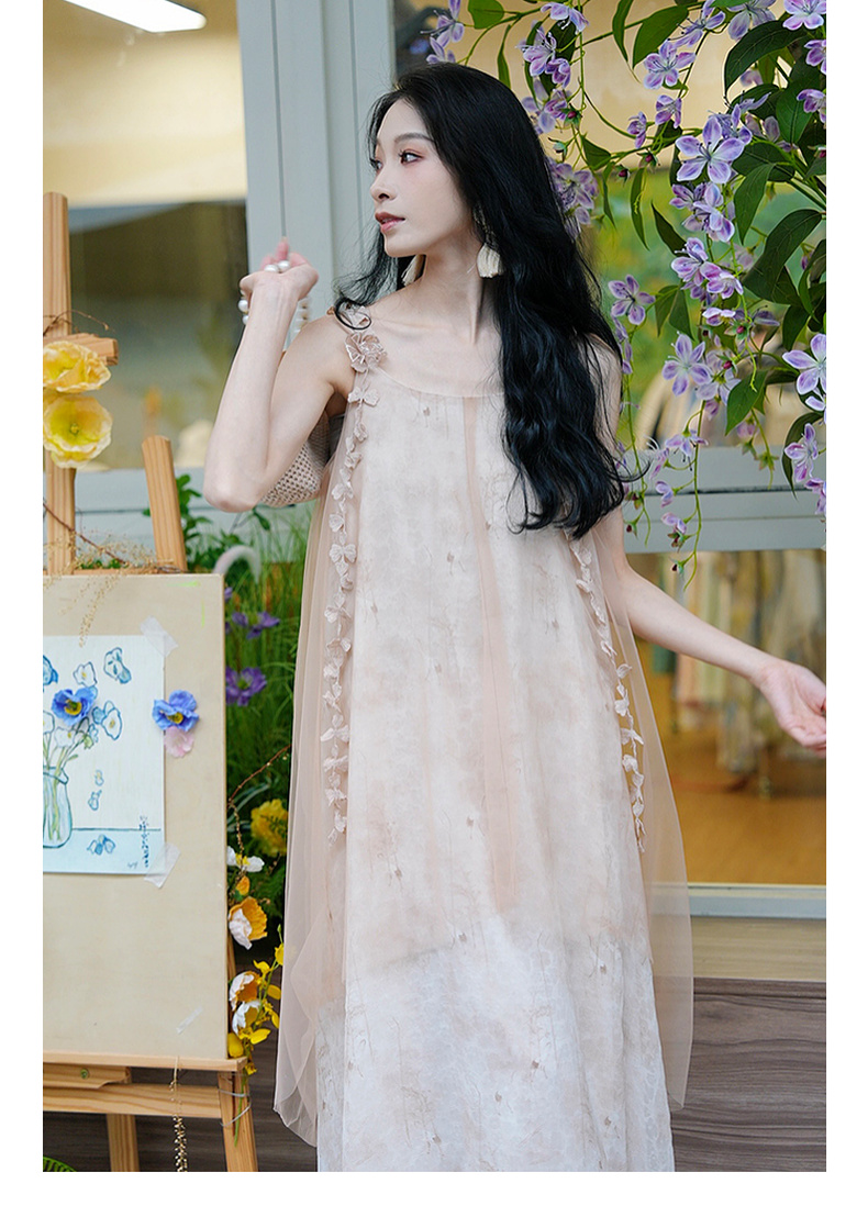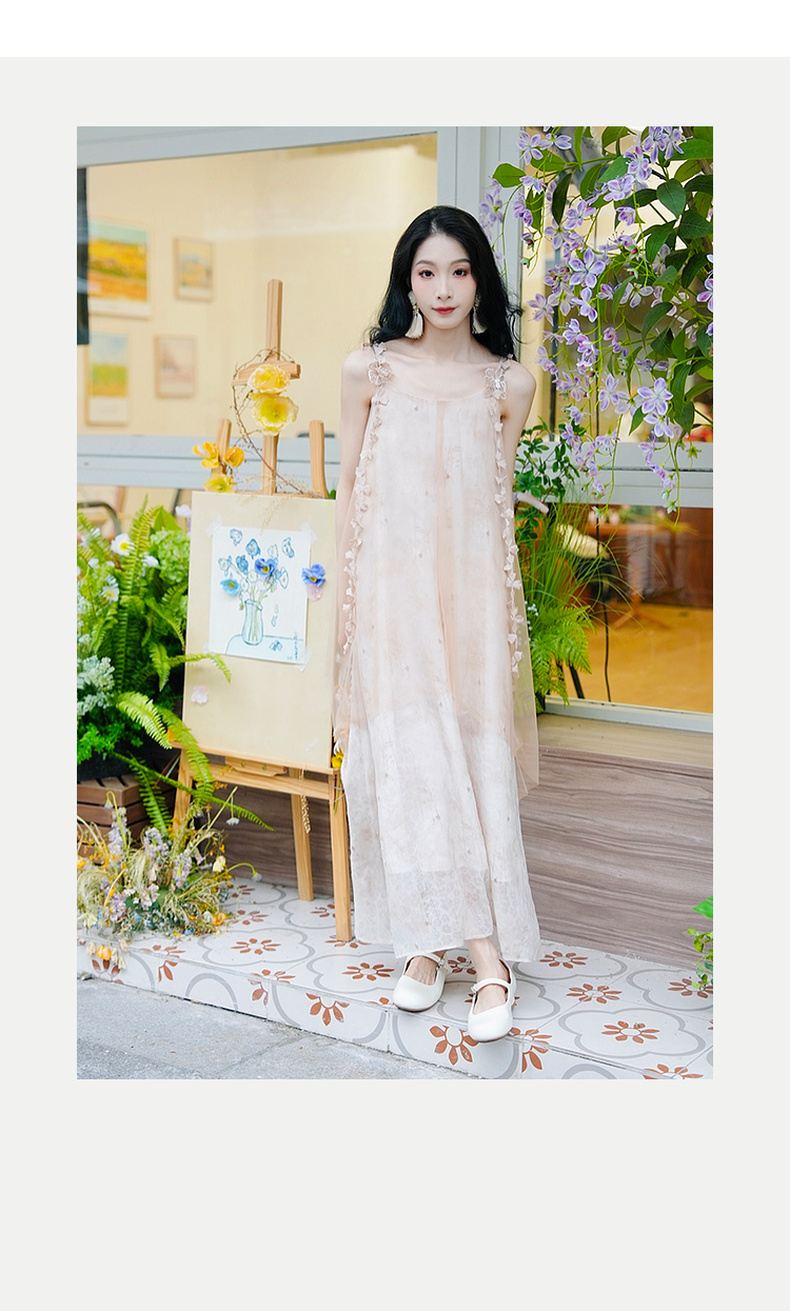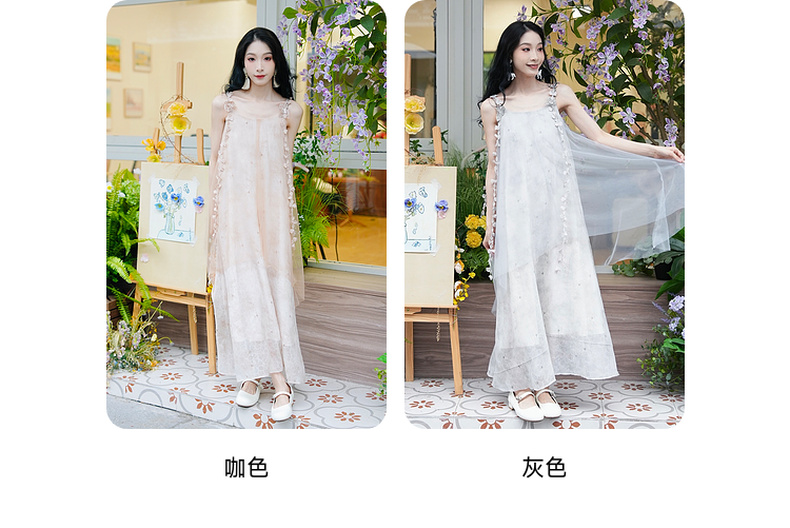 两三事 屿岸吟风 2025夏季新款立体花朵吊带裙小仙女印花连衣裙