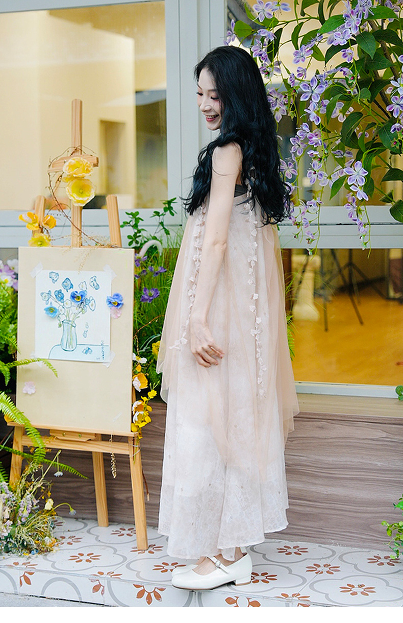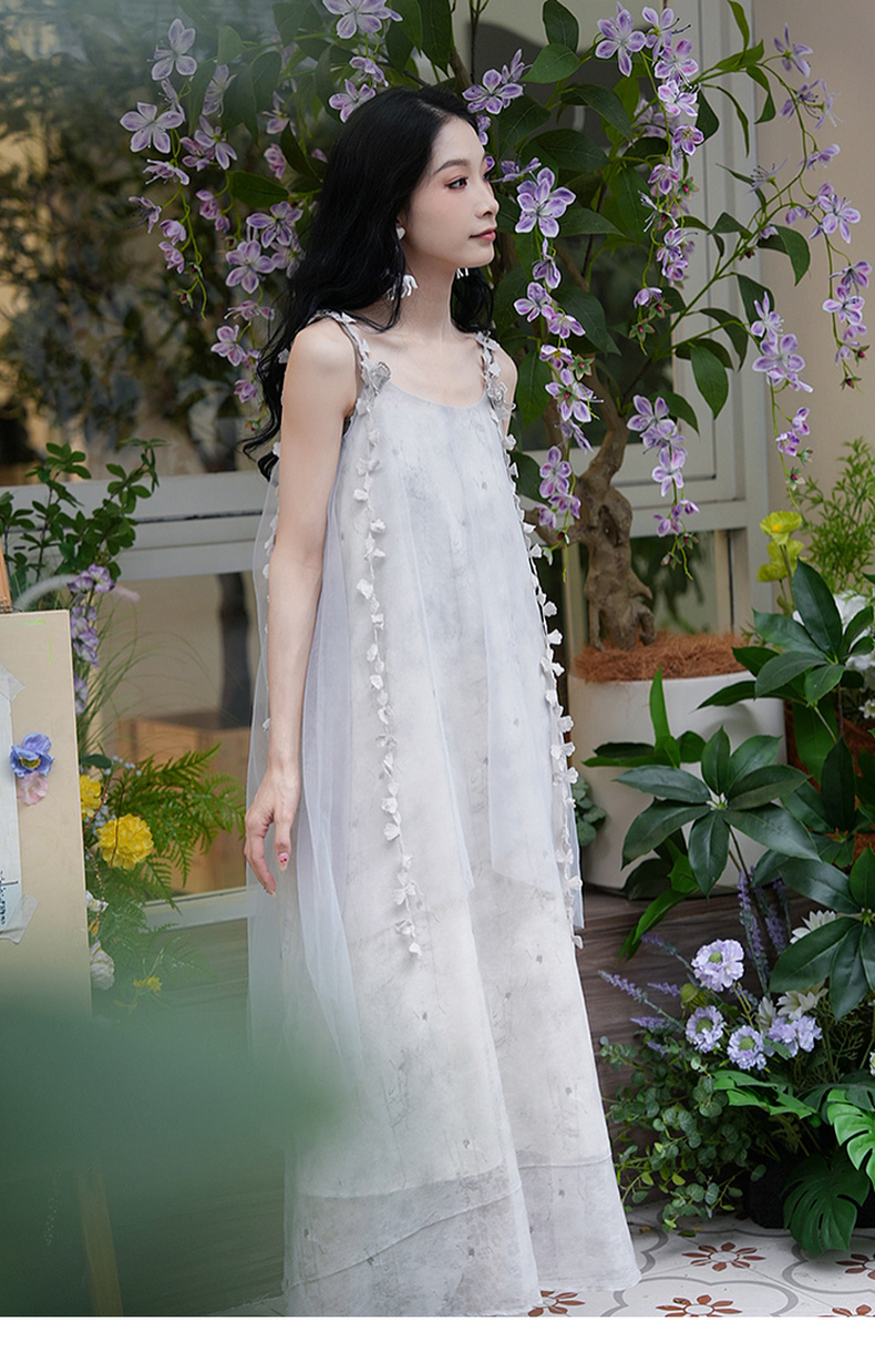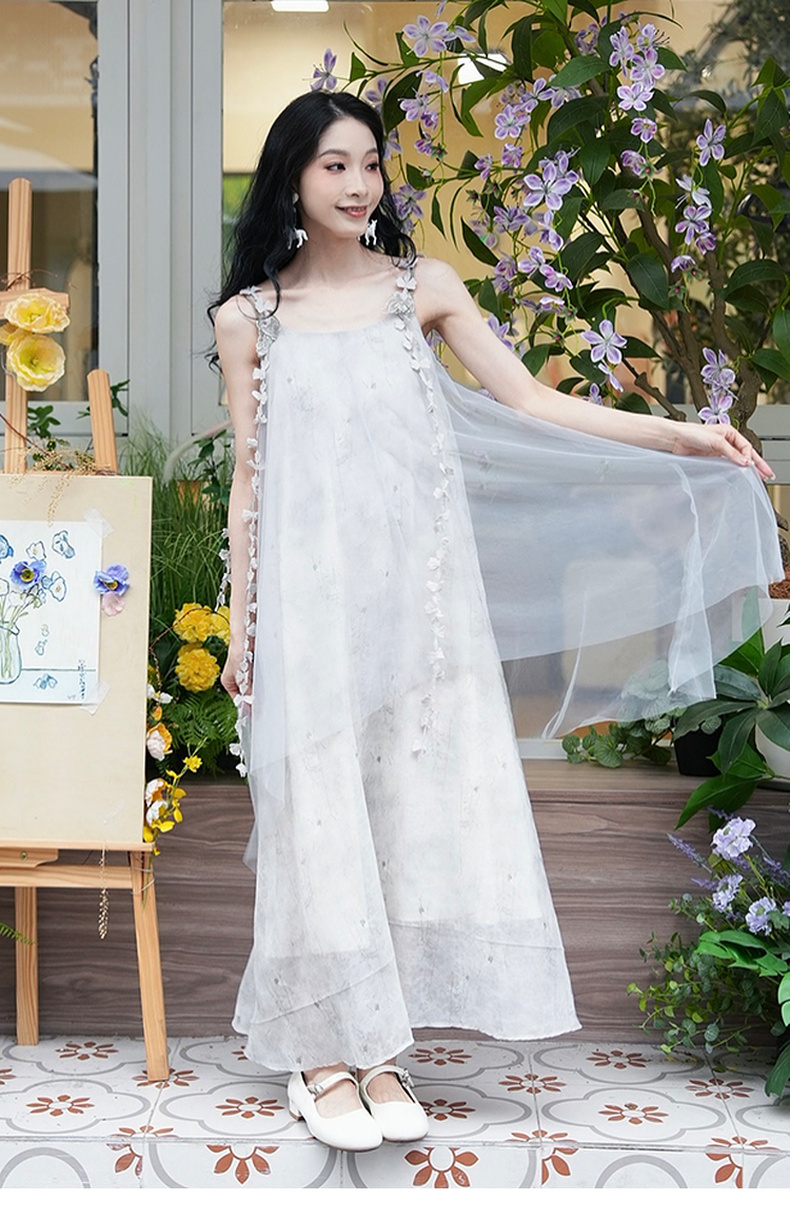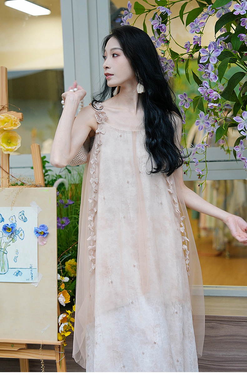 两三事 屿岸吟风 2025夏季新款立体花朵吊带裙小仙女印花连衣裙