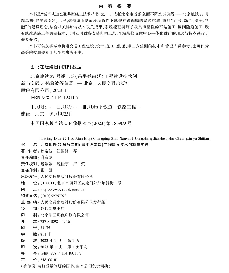 书名:北京地铁27号线二期(昌平线南延)工程建设技术创新与实践