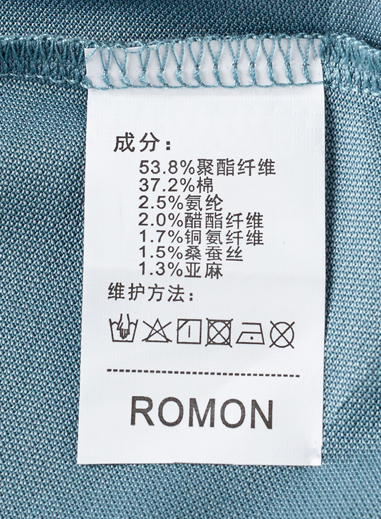 面料:53.8%聚酯纤维37.2%棉2.5%氨纶2.0%醋酯纤维1.7%铜氨纤维1.5%桑蚕丝1.3%亚麻