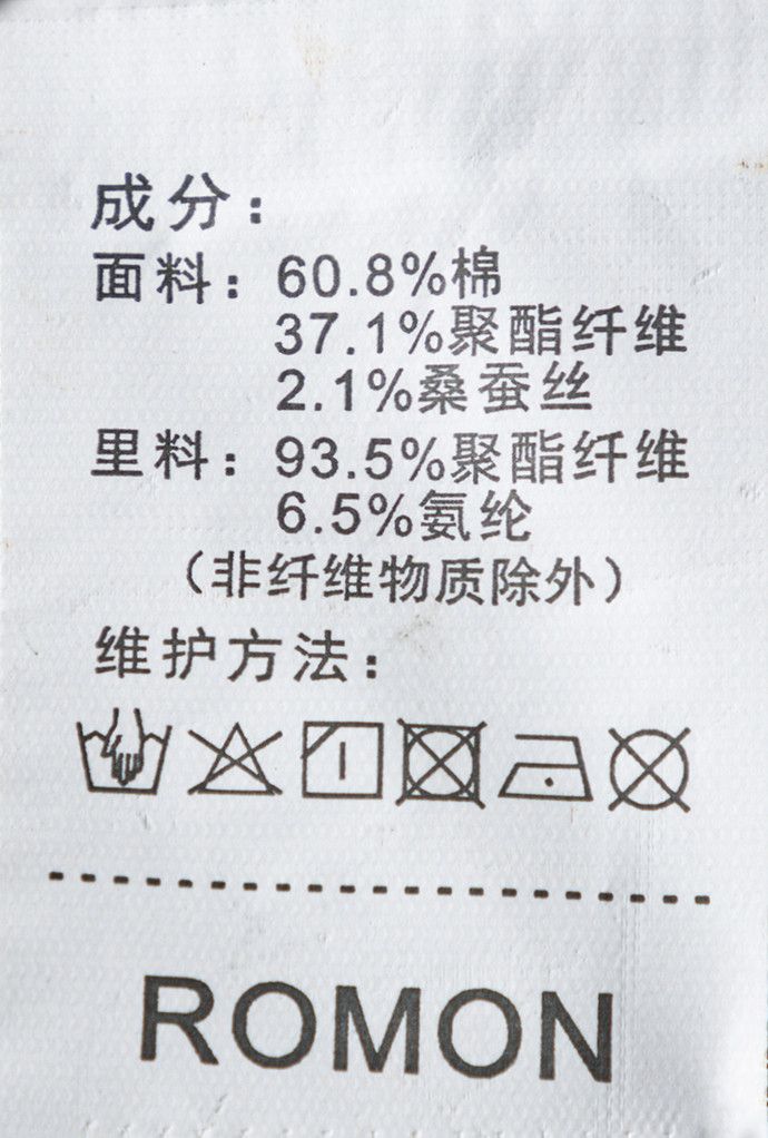 面料:60.8%棉 37.1%聚酯纤维 2.1%桑蚕丝 里料:93.5%聚酯纤维 6.5%氨纶(非纤维物质除外)
