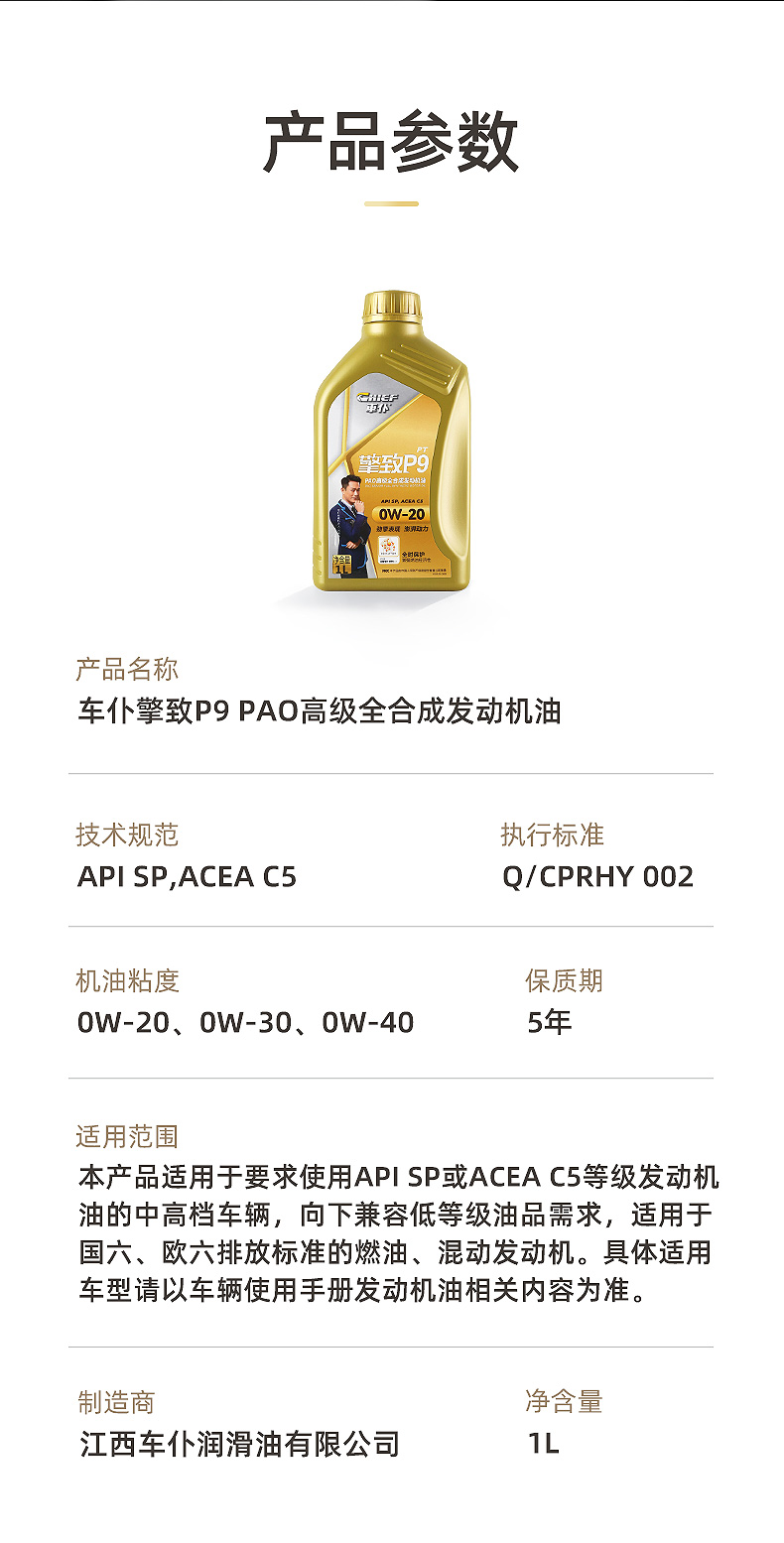 车仆官方正品擎致P9 0W20 0W30 0W40全合成润滑油汽车机油SP级1L