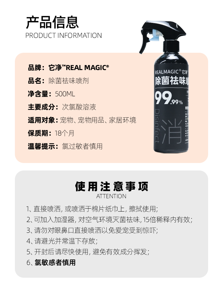 它净猫咪狗狗次氧酸高机能离子水除臭除jun除味清洁喷雾500ml