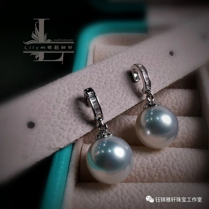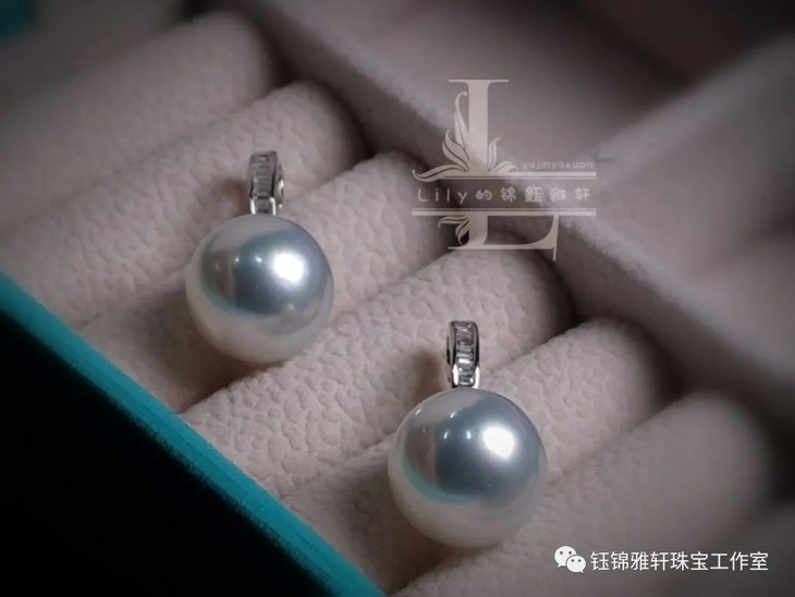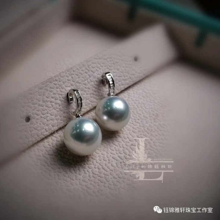 初见这对极品月光银的澳白珍珠时,她水银色的冷皮微带淡粉色的伴色,深深吸引到我,冷艳的气质,自带高贵的光泽让人移不开眼睛。加之圆度完美、皮光完美。要知道在澳白珍珠中,挑出一对颜色、大小、圆度、皮光几乎完全一致的耳环用珠,怕是要在上百颗中寻找。更别说是这么漂亮的颜色以及完美的圆度,更是需要机缘巧合的。