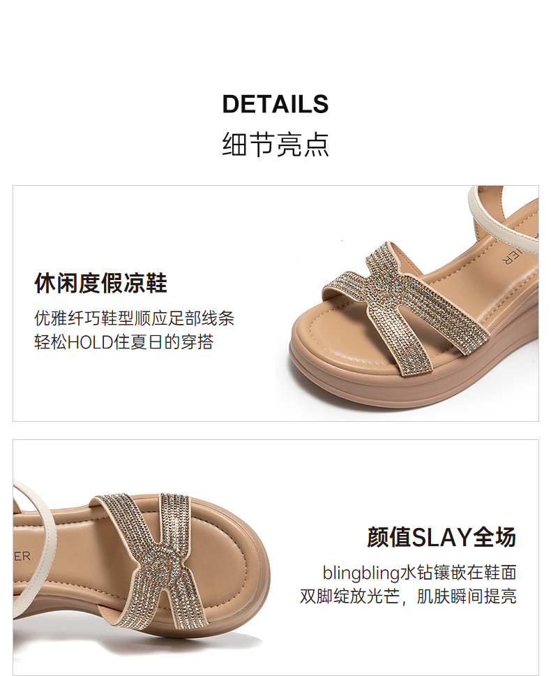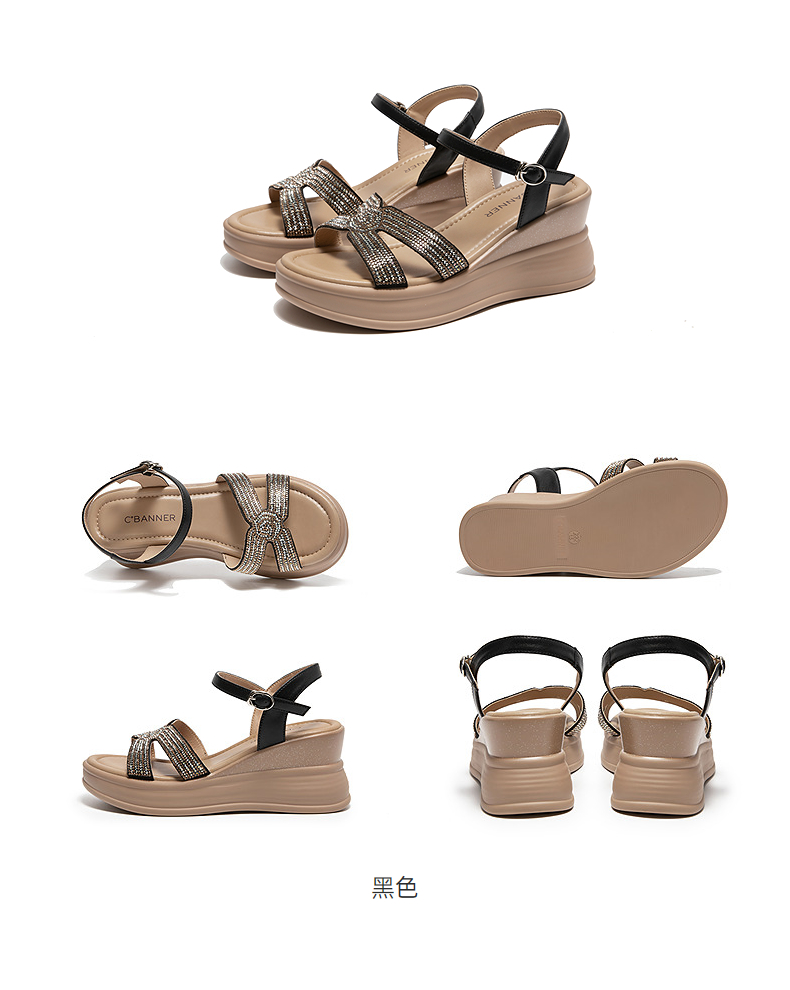 千百度坡跟一字带休闲凉鞋女厚底配裙子舒适绝美凉鞋A25385552