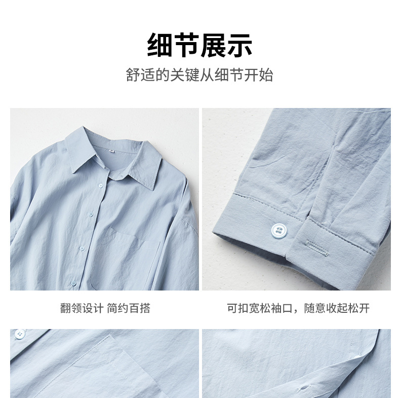 防晒100%砂洗纯棉长袖女式夏季衬衫蓝色高级感上衣薄外套宽松开衫