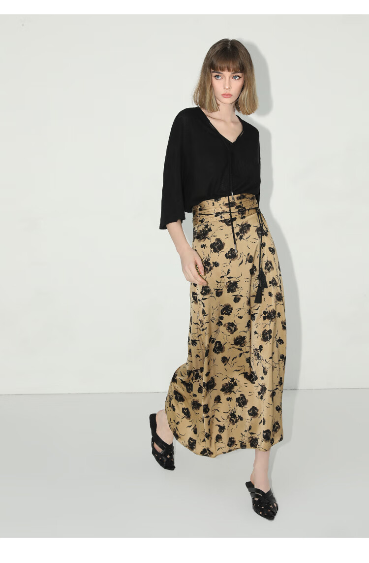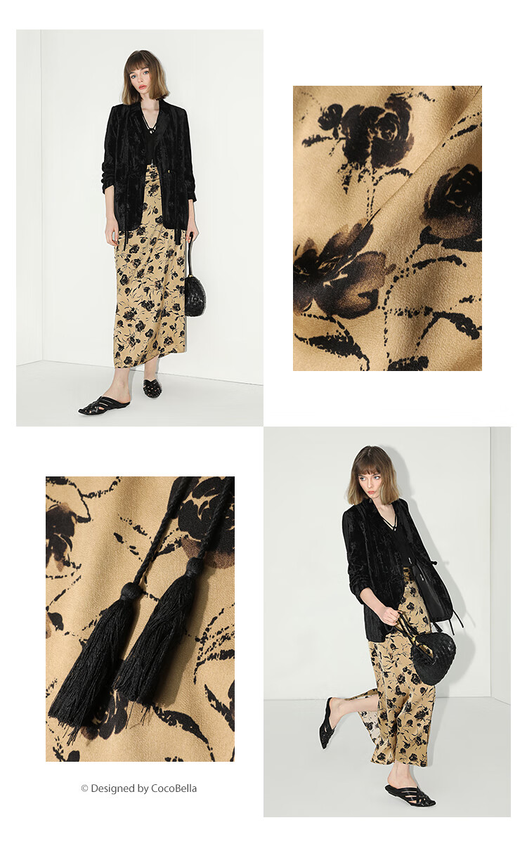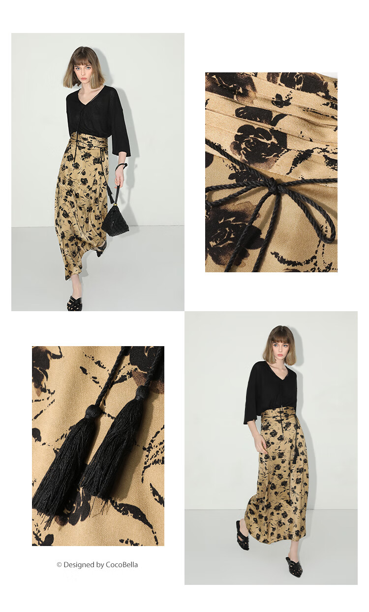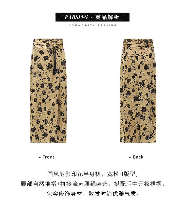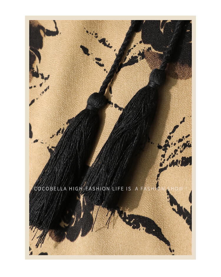 【限时秒杀】COCOBELLA国风流苏飘带高腰捏褶印花半身裙开叉直筒裙HS0019