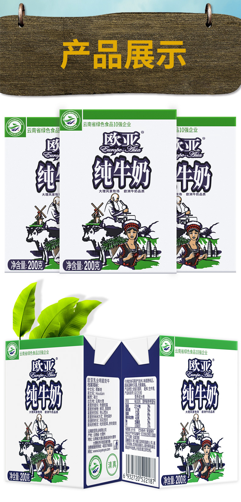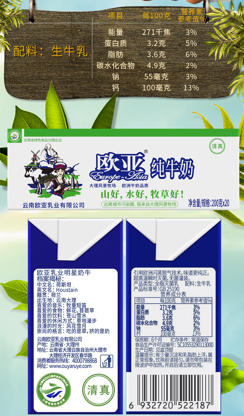 「200g*20盒/箱」欧亚高原全脂纯牛奶早餐大理乳制品