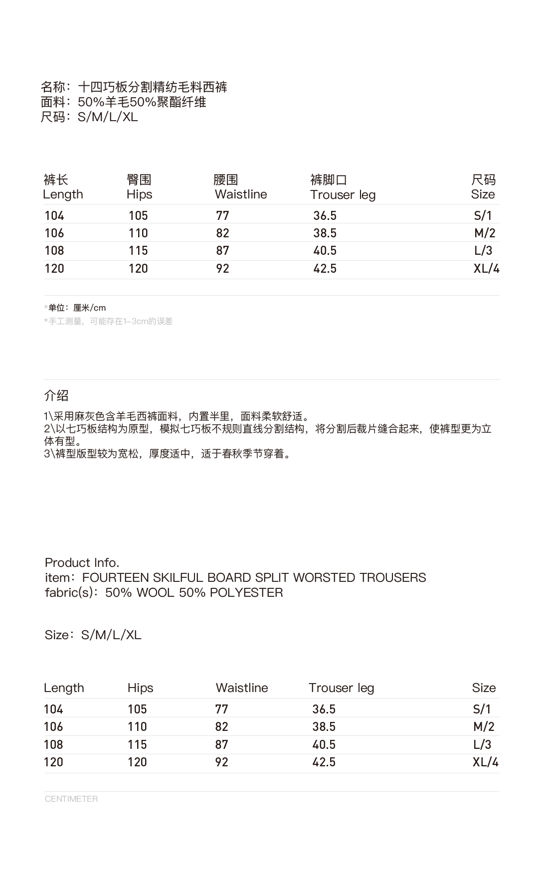 | 裤脚口款式: 直筒 | 材质成分: 聚酯纤维50% 羊毛50% |