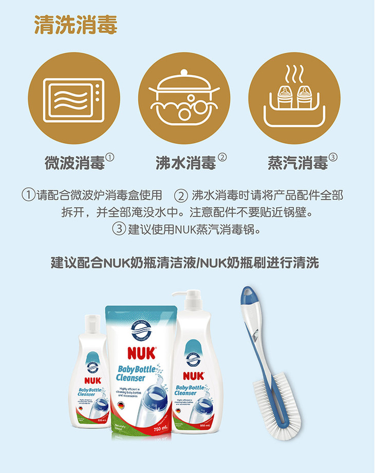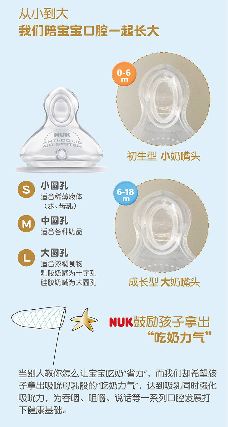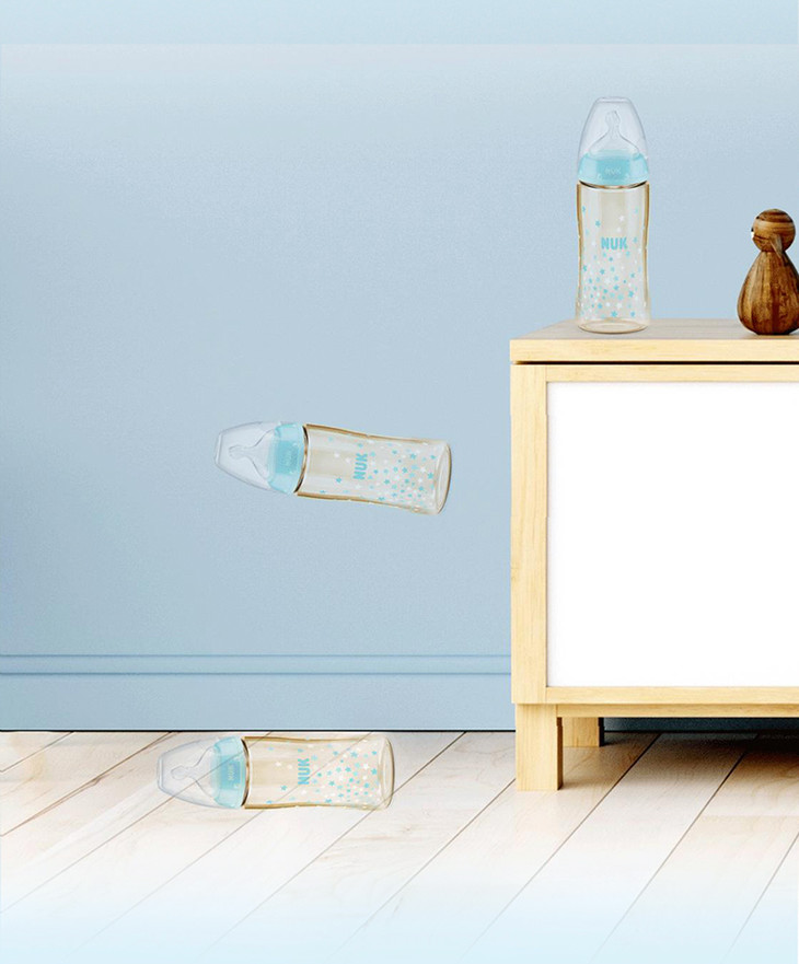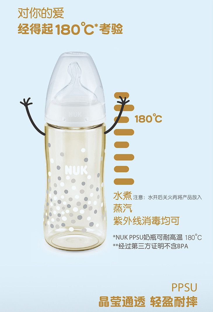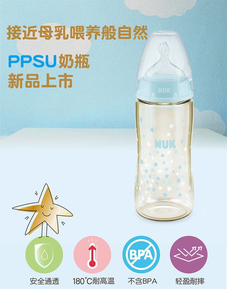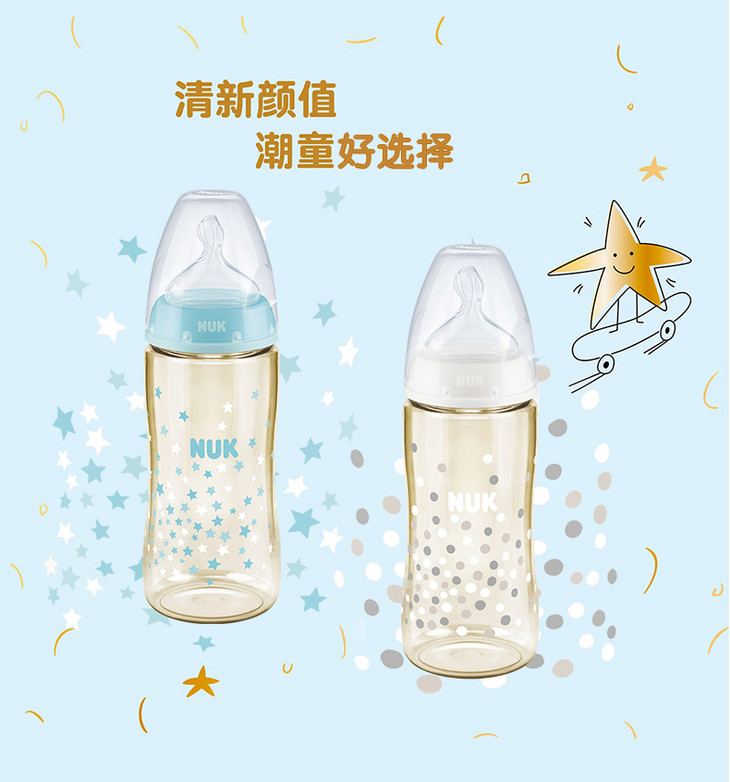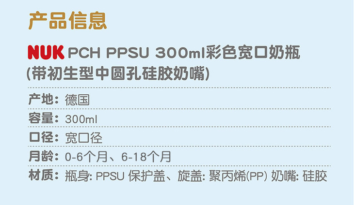 NUK PCH宽口PP彩色奶瓶 成长型 300ml 硅胶圆孔M(6-18个月)