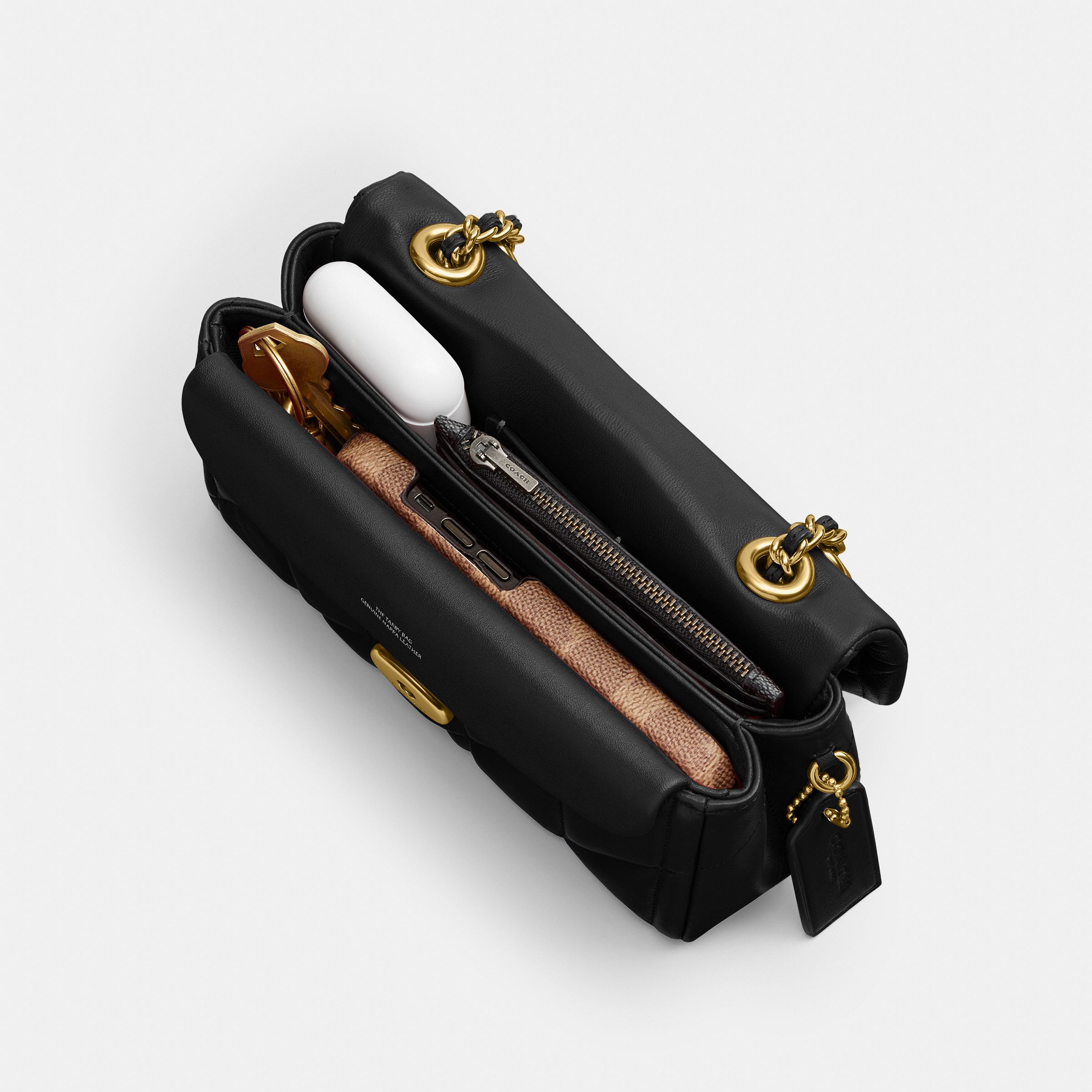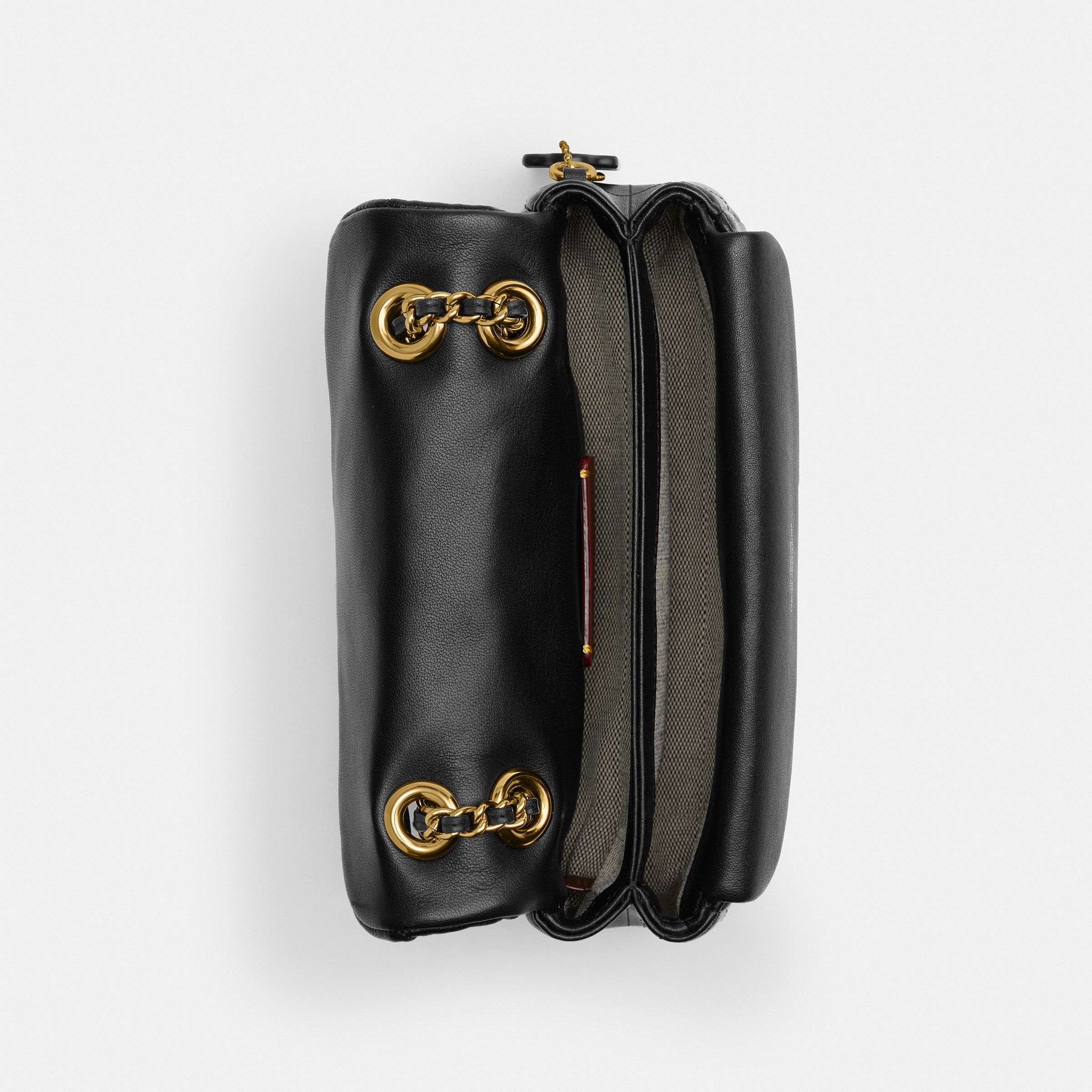 羊皮革内置磁扣袋推锁开合,织物配羊皮革衬里外置插袋垂直长度54.5cm链带,可肩背或斜挎20cm (长) x 11cm (高) x 7cm (宽)