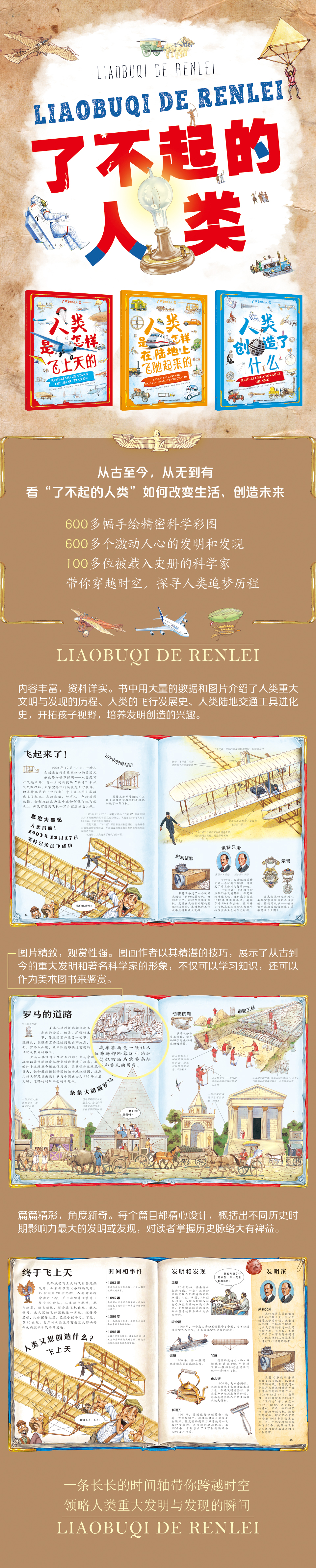 《了不起的人类》全3册 6-12岁 600+副手绘精密科学彩图 600+激动人心的发明和发现 100+载入史册的科学家 带你穿越时空 探寻人类追梦历程