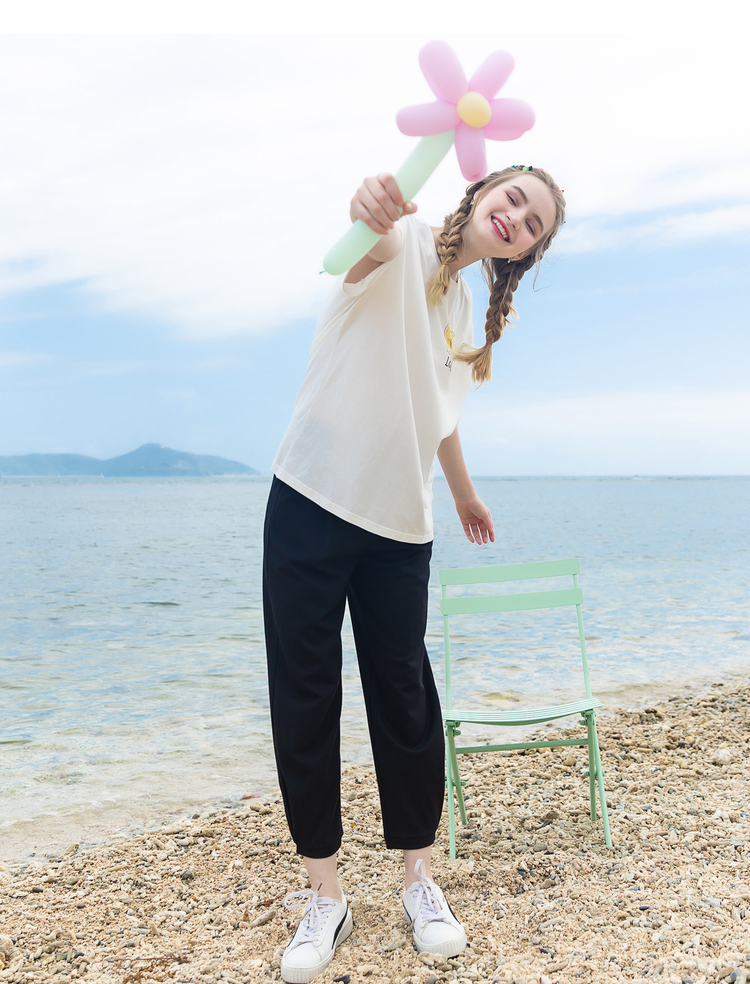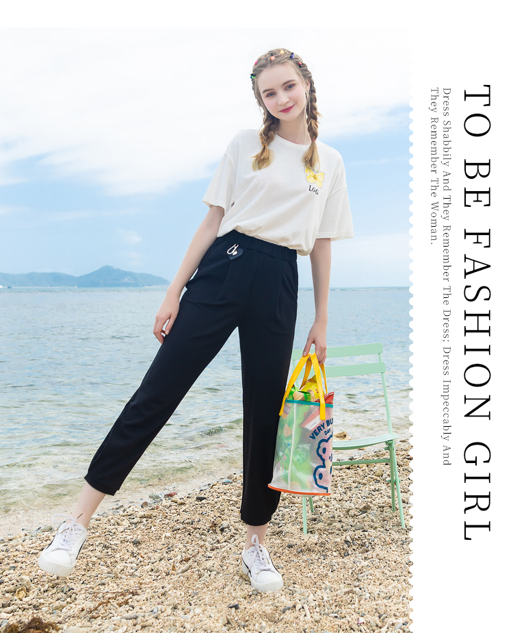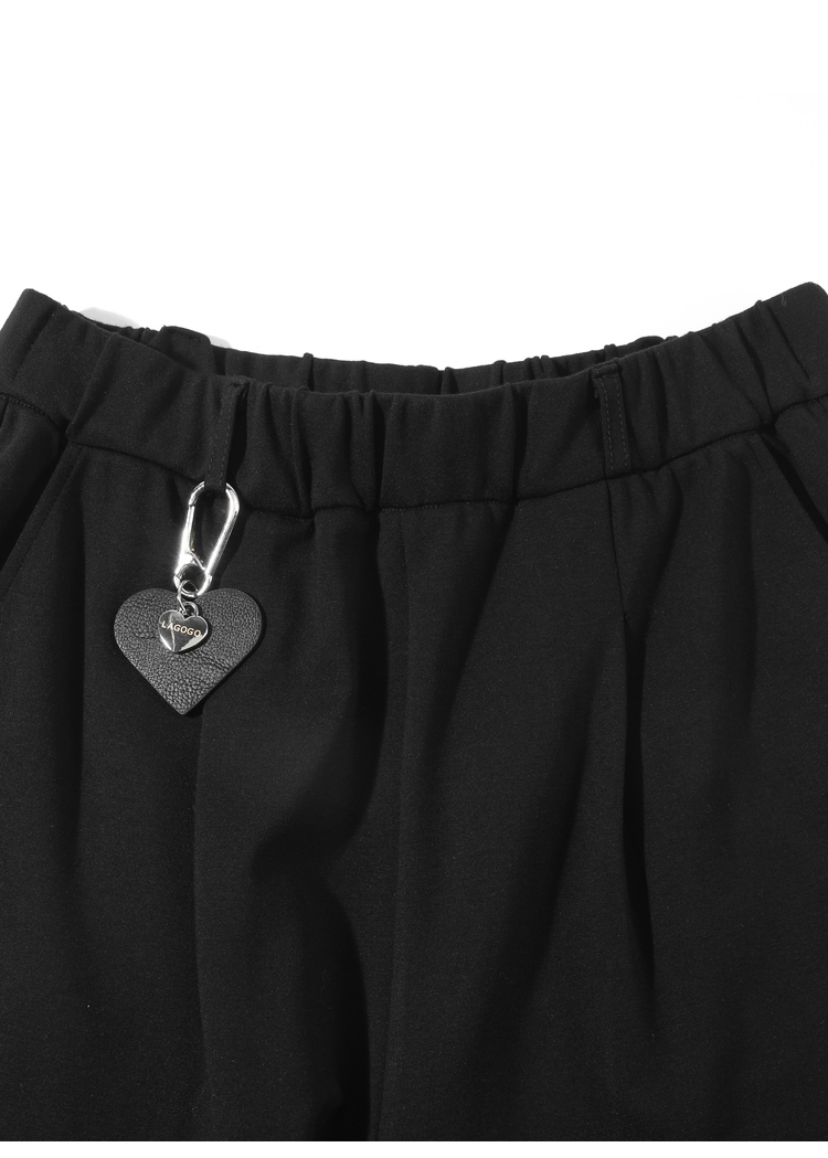 Lagogo拉谷谷2022年春季新款松紧高腰黑色休闲裤子女九分裤直筒裤LAKK432A71